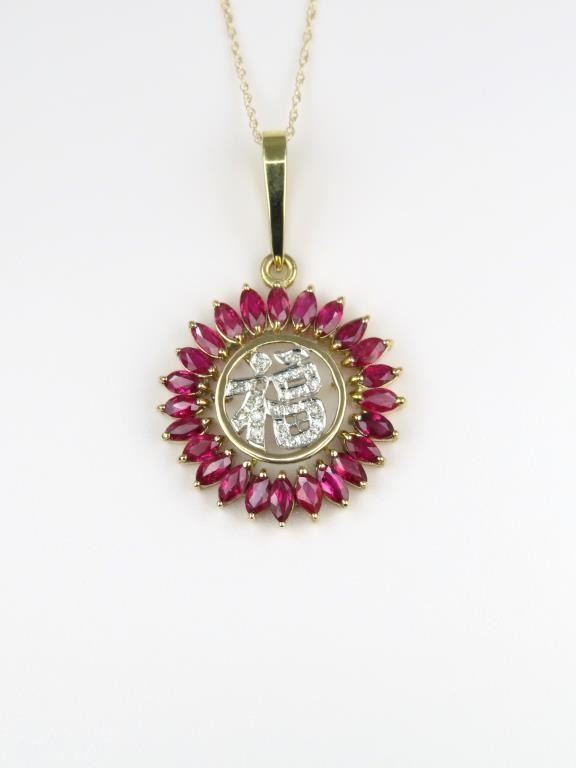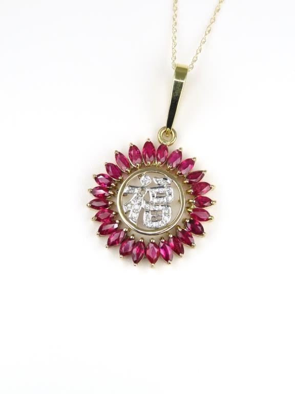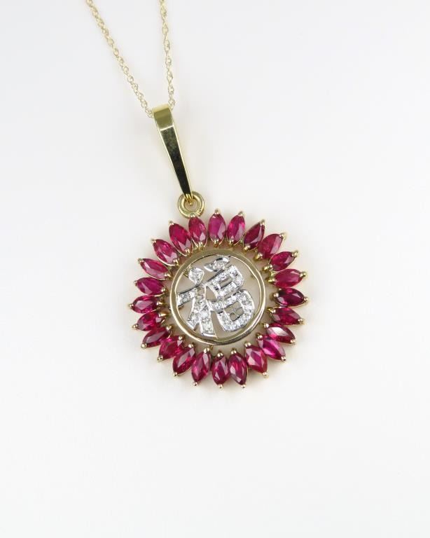 Elegant Ruby and Diamond Pendant featuring 28 marquise cut vivid Red Rubies weighing approx. 3.00 carats accented with 22 round Diamonds framing Chinese good luck design.