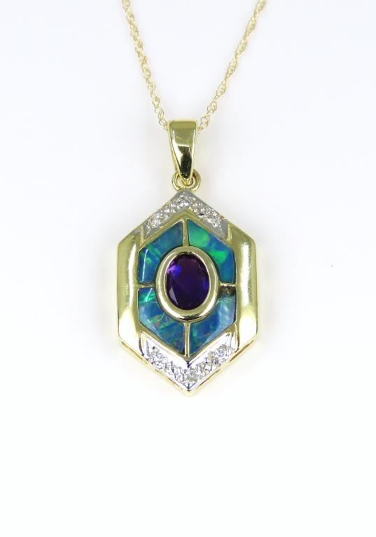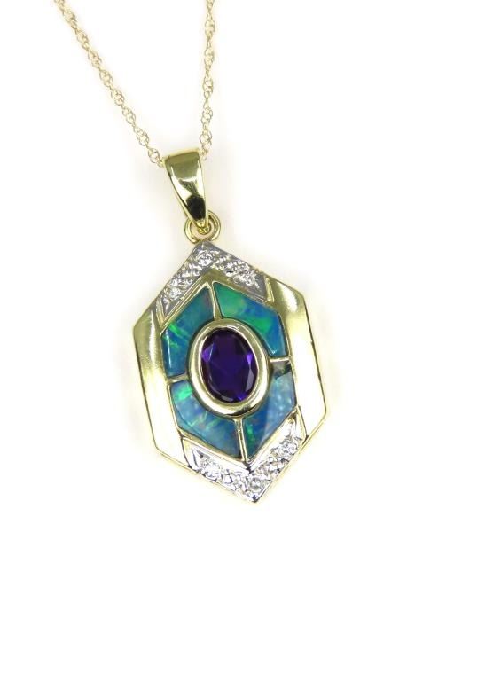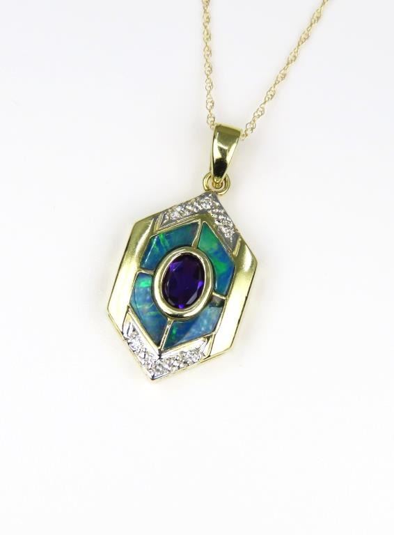 and Diamond Pendant featuring inlayed Black Opal with color flashes with oval cut Amethyst in center set in 14 karat yellow gold setting.