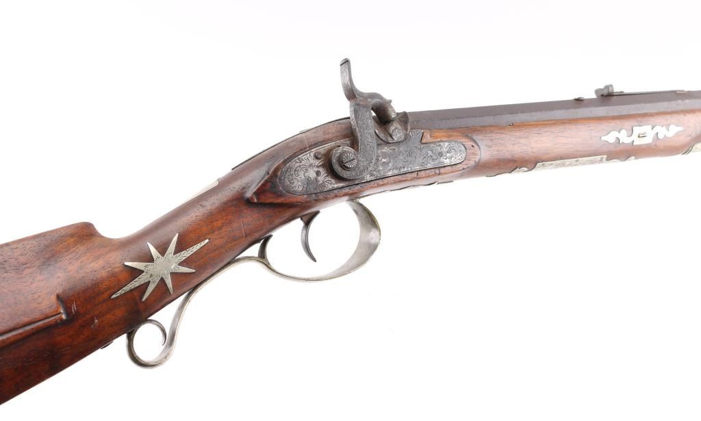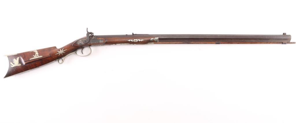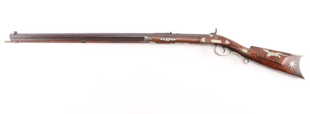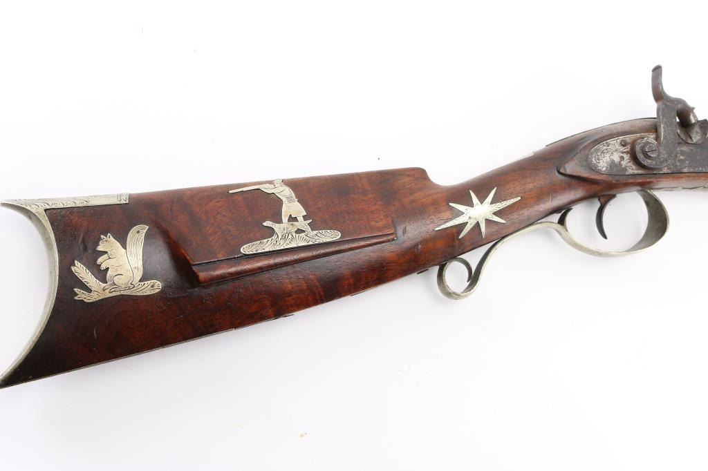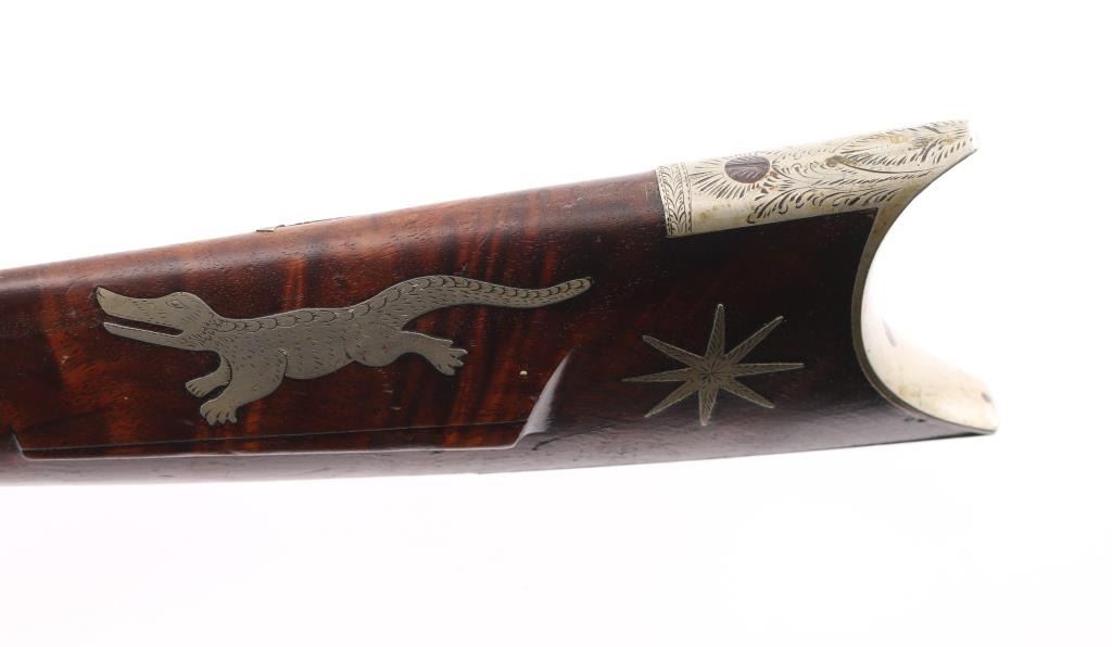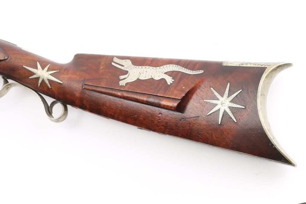 Rifle with fancy inlaid stock showing alligator on left cheekpiece similar to Rezin Bowie rifle. 49" overall with 34'" octagon barrel of medium to slightly heavy weight. 40-42 calibre. The trigger guard is engraved with a flop-earred jack rabbit, also other inlays of squirrel, hunter and dog, stars, geometrics adn a fancy engraved plaque on bottom of side of forend with fancy buttplate, nose cap and furniture. The sights have been changed and moved further forward from owner aging and becoming near sighted. A small peep sight tap hole in the top and 3 tap holes for original rear sight in the barrel, 1 with a cross post remaining. No half - cock, but lock working and rifle is good to very good overall. Normal aging, minor pitting, small imperfections. Modern ramrod. An interesting rifle that Musso felt had an association with the southwest and circa about 1830-1850. Condition is NRA Good to Very Good **Antique Firearm** From the Joseph Musso Collection