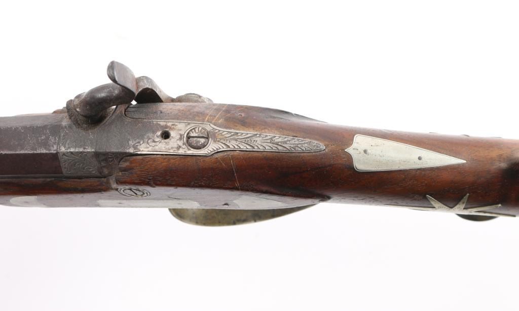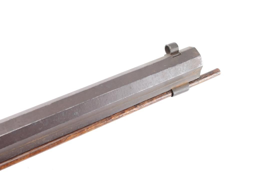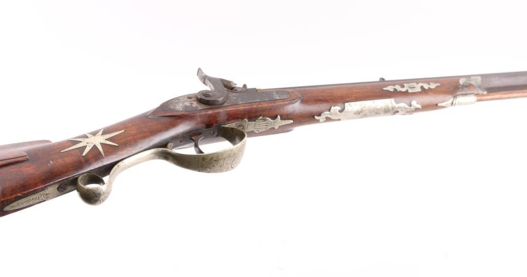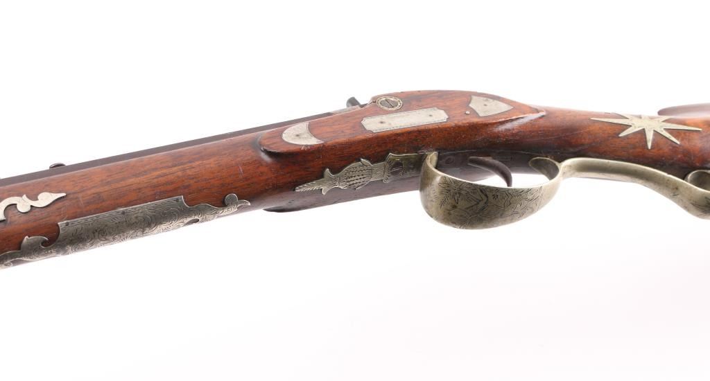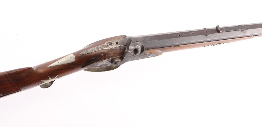 Rifle with fancy inlaid stock showing alligator on left cheekpiece similar to Rezin Bowie rifle. 49" overall with 34'" octagon barrel of medium to slightly heavy weight. 40-42 calibre. The trigger guard is engraved with a flop-earred jack rabbit, also other inlays of squirrel, hunter and dog, stars, geometrics adn a fancy engraved plaque on bottom of side of forend with fancy buttplate, nose cap and furniture. The sights have been changed and moved further forward from owner aging and becoming near sighted. A small peep sight tap hole in the top and 3 tap holes for original rear sight in the barrel, 1 with a cross post remaining. No half - cock, but lock working and rifle is good to very good overall. Normal aging, minor pitting, small imperfections. Modern ramrod. An interesting rifle that Musso felt had an association with the southwest and circa about 1830-1850. Condition is NRA Good to Very Good **Antique Firearm** From the Joseph Musso Collection
