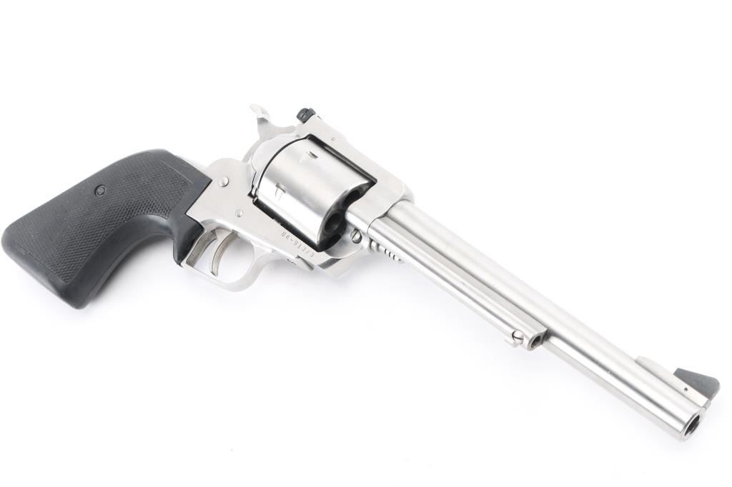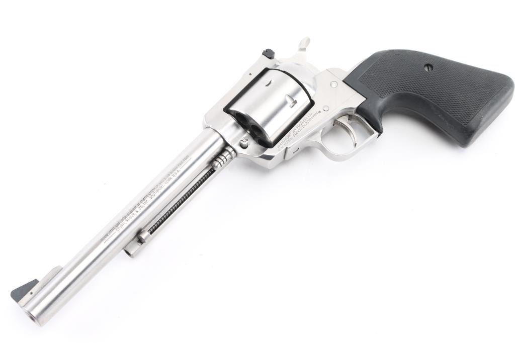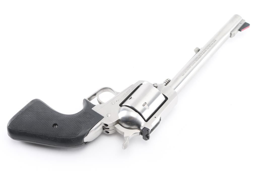 SN: 84-91379 stainless steel single action 6 shot revolver, 7.5" barrel with serrated ramp front sight with red accent and adjustable square-notched rear sight, serrated trigger and hammer spur, checkered black rubber grips. Bore is excellent/bright. Action is smooth, lock-up is tight. Condition is NRA Excellent. Modern Firearm.