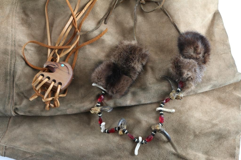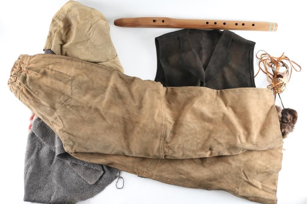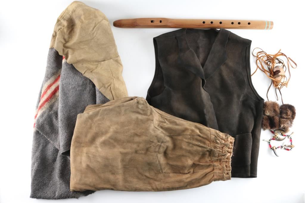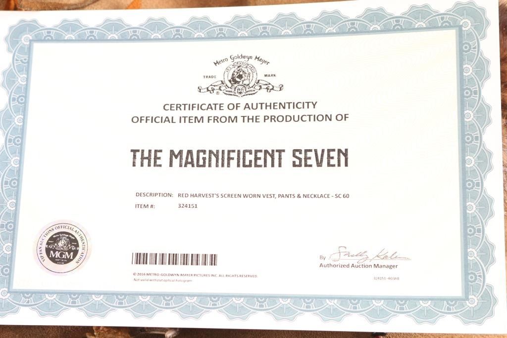 Worn by the "Red Harvest Character" worn by famous actor "Martin Sensmeier" in the 2016 film, known for action war movies. Includes item COA from the MGM movie production for each of the items. Includes "Red Harvest" screen worn vest, pants& necklace. All seen in scene "60" of the film with screen used horse blanket with deer skin & flute set. Included with the outfit to complete the set is a screen used quiver w/ bow holder arrow an VFX arrow rig with COA. Note to buyer there are more items in the auction worn in different scenes of the "Magnificent Seven 2016 Film" See Lots 821A, 822 for full set.