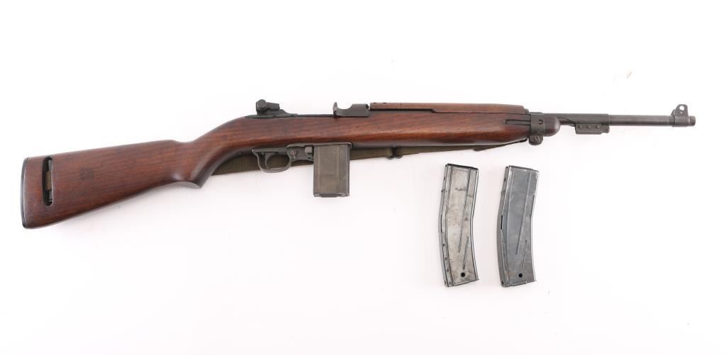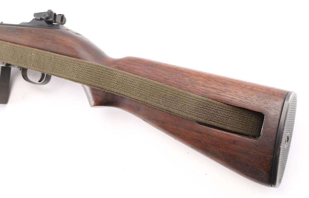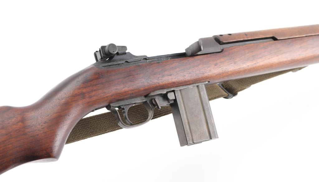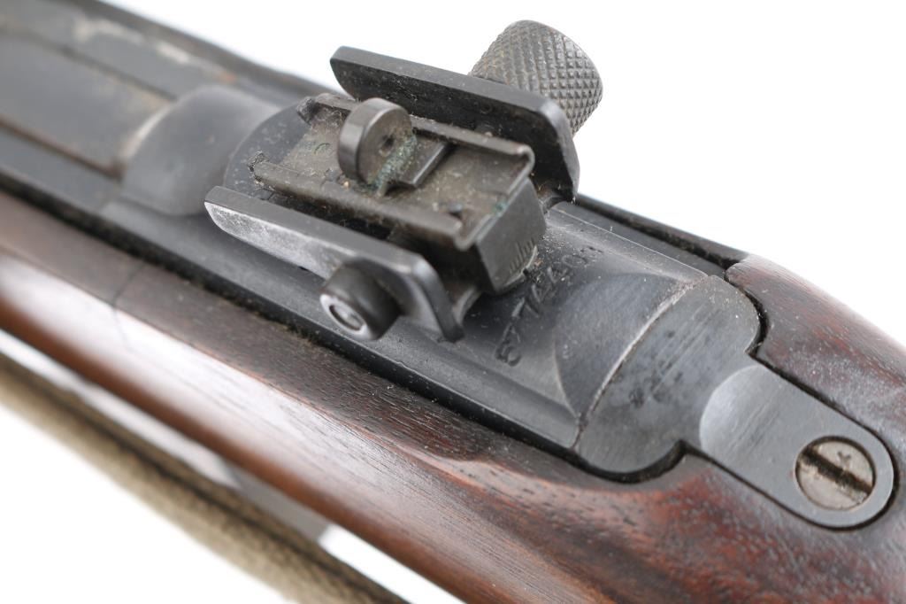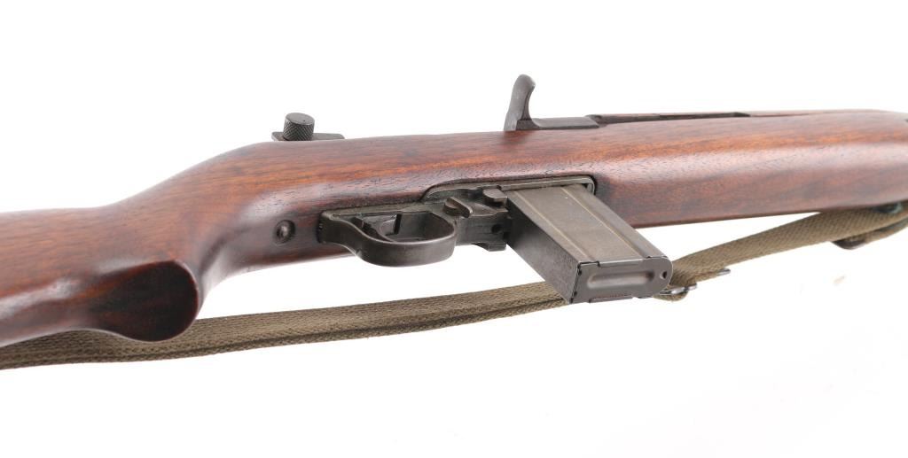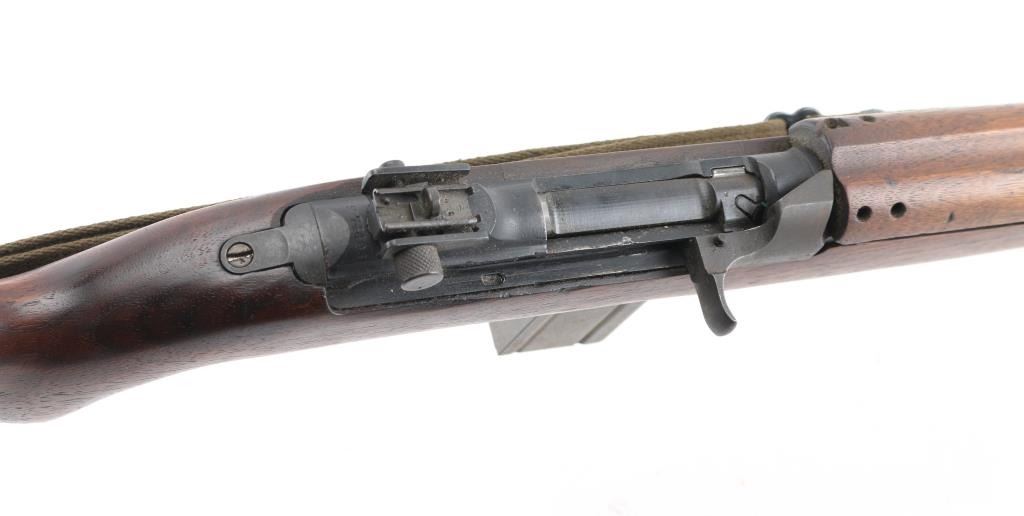 US military semi-automatic rifle manufactured circa 1944. Features parkerized finish, walnut stock & handguard, protected blade front sight, peep rear sight with sliding elevator, 18" barrel, rotary safety, front sling swivel, Type III front band with bayonet lug, oval cut sling/oiler slot in butt, accepts detachable magazine. flat bolt, four rivet handguard. Bore is very good condition. Retains 98% finish, some minor edge loss of finish. Wood is sound with a chip out of the wood adjacent fourth rivet of handguard. Small dents & dings, mostly on top handguard. Crossed cannon cartouche on stock. No markings observed on barrel. No importer marks found. Includes one blued steel 20 rd magazine and two 30 rd magazines. USGI green canvas sling attached. Slightly dirty on metal surfaces. Condition is NRA Very Good. **C&R Firearm** From the Joseph Musso Collection