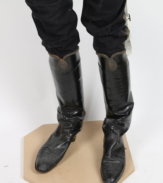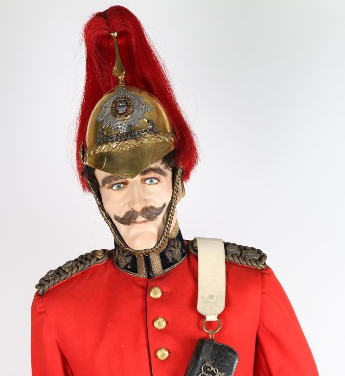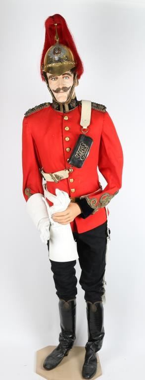 Museum quality display mannequin wearing uniform from the "Rorke's Drift" Era. Dragoon officer's helmet with brass chain chin strap, tunic w/ brass buttons and emblems, Epiletts. Dispatch pouch with buff leather and brass mounted belt, White buff leather waist belt with brass buckle. Black mid-calf leather boots and white gloves. Gold striped trousers. Some aging and normal wear. Very good condition. Detailed mannequin included. Joe Musso Collection. conflict Anglo-Zulu War branch 24th Regiment of Foot item Uniform