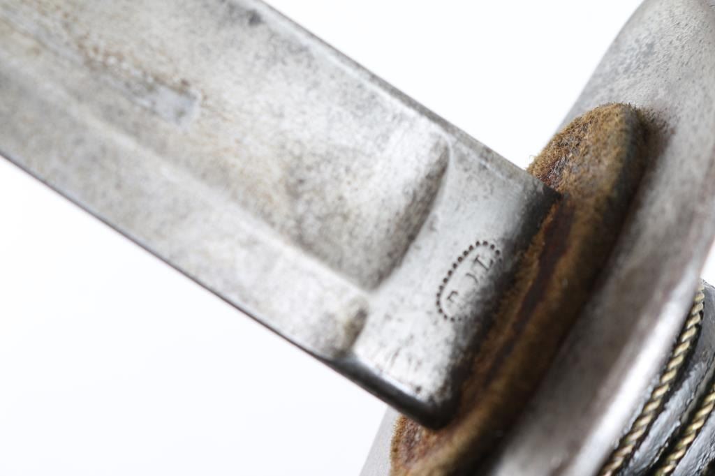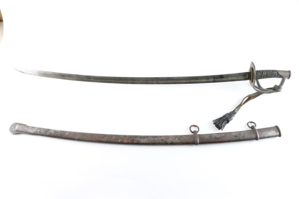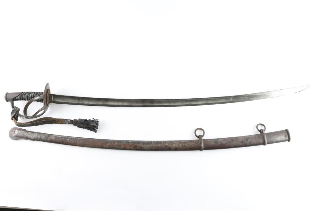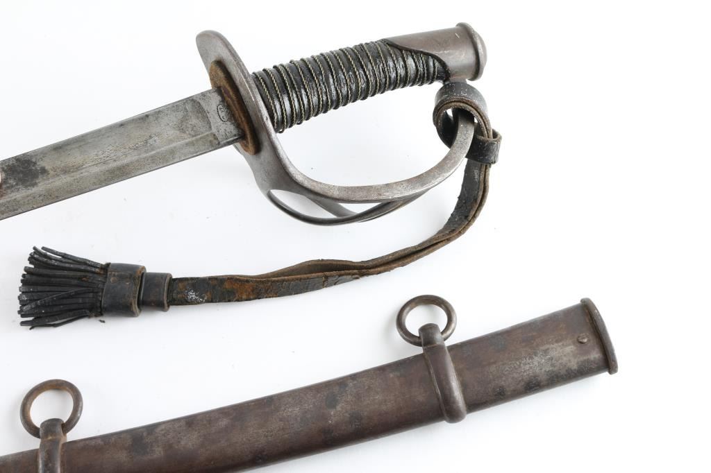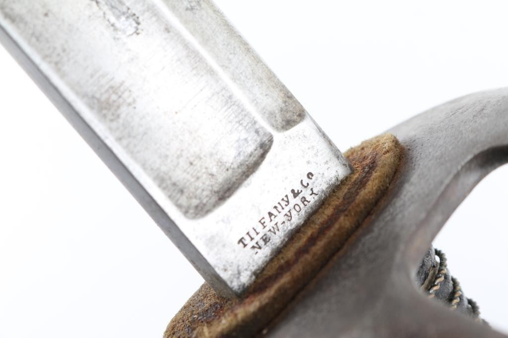 Heavy Calvary Saber marked "Tiffany & Co." on ricasso. 36" Blade is sound with a good edge. Iron hilt shows age dark patina and minor pitting with its grip retaining all the wire wrap and about 95% leather. Good markings. Very good condition. With scabbard. A very desirable and hard to get Civil War sword. From the Joseph Musso Collection
