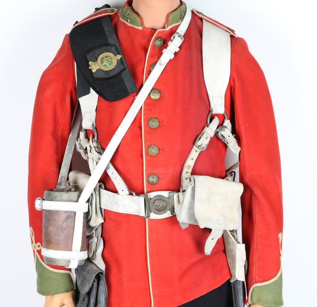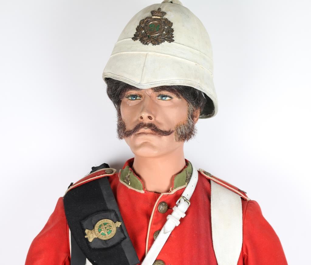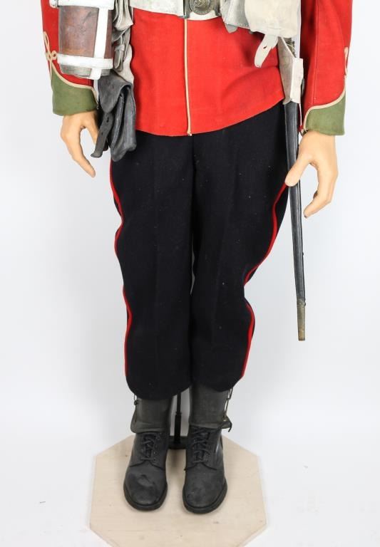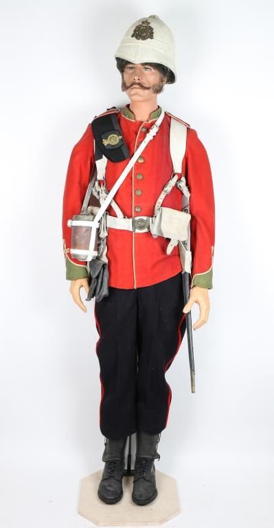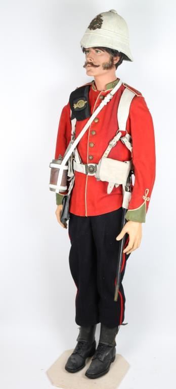 Museum quality display mannequin donning British officer's uniform and equipment from the "Rorke's Drift" Era. 24th Regiment of Foot. Pith helmet w/Egypt plaque of Sphinx and matching collar emblems. Black piss cover. Tunic w/ brass buttons and fancy sleeves. Blue trousers with red stripe, canteen w/harness, belt and two ammo pouches and one utility pouch. Snake belt buckle on buff leather waist belt. Black medium size boots w/ spats. Some aging and minor wear. Very good condition. Detailed mannequin included. Joe Musso Collection. conflict Anglo-Zulu War branch 2th Regiment of Foot item Uinform & Equipment