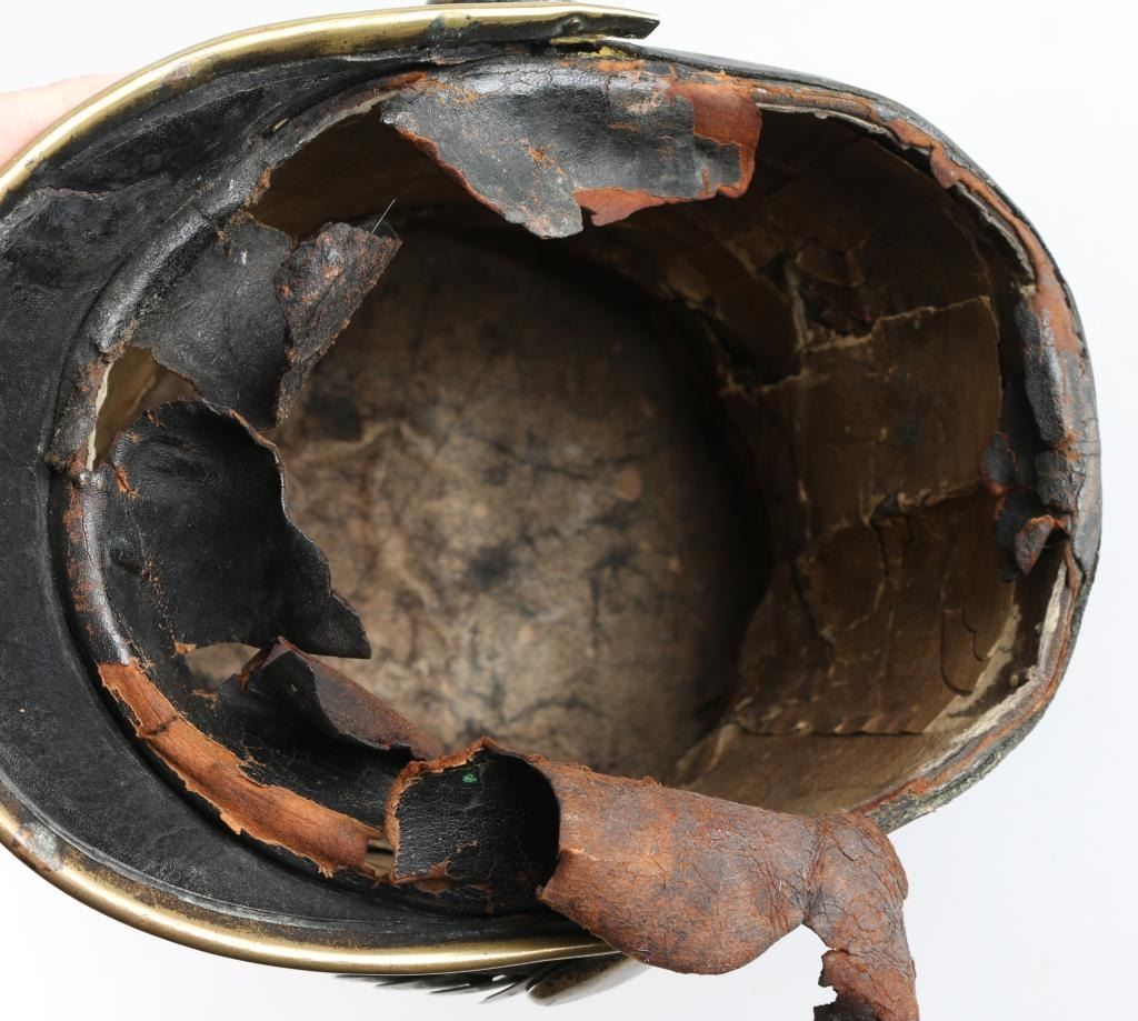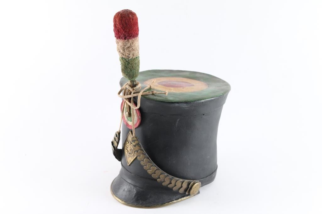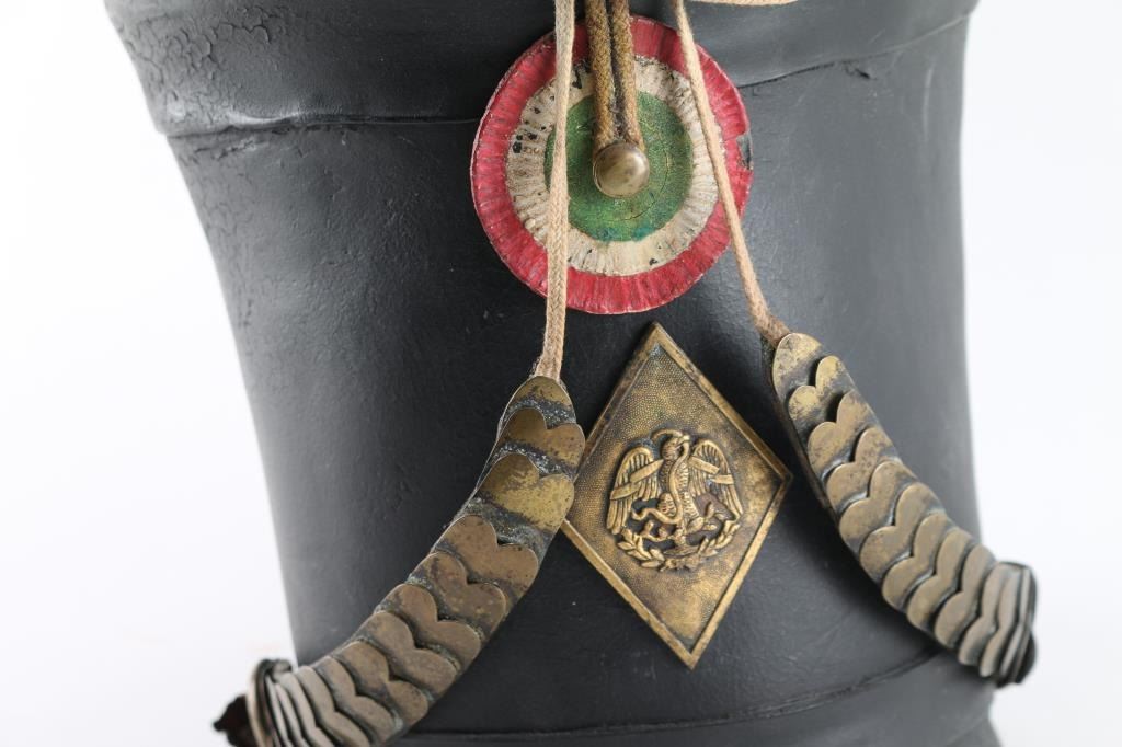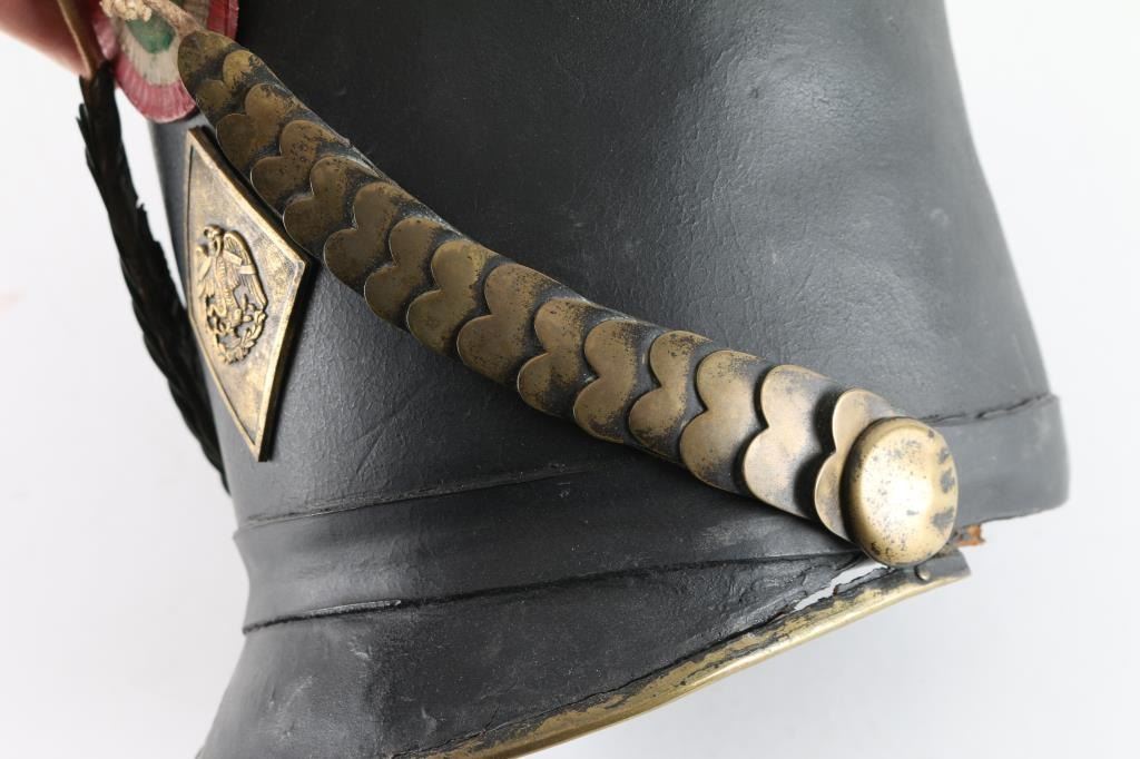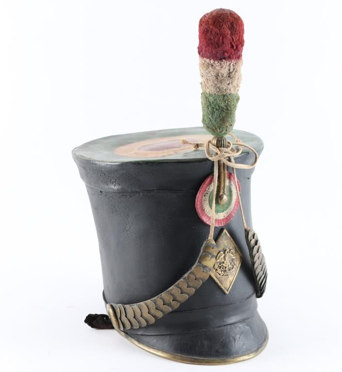 18" tall leather leather Mexican Army Shako. Circa mid 1800's. (Alamo, Mexican-American War) Leather backed brass overlapping/linked chin scales with plain swivel pots. Diamond-shaped insignia of stamped brass with a gilt wash. The pre-revolution version of the Mexican national coat of arms in bas-relief dominates the center, with a finely-pebbled background with the eagle with rattlesnake in it's mouth. Red, white, & green rosette, and pom-pom, brass edged visor. Has the controversial 'roundel' painted in green, white, & red on top of the shako, paint appears to have been on there a very long time. The shako is intact, and overall very good condition, but the pom-pom is loose, and there are just remnants of the leather liner. From the Joseph Musso Collection