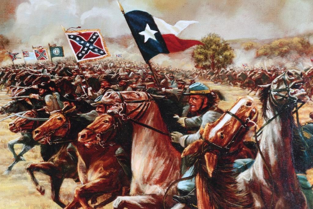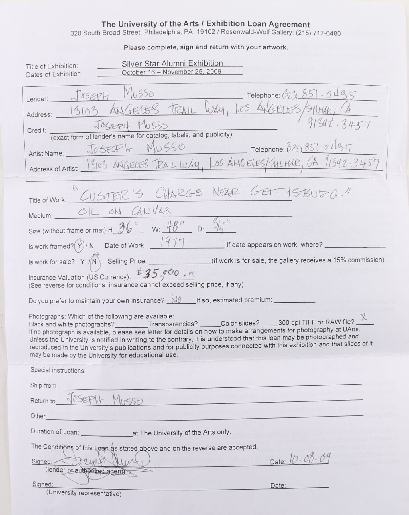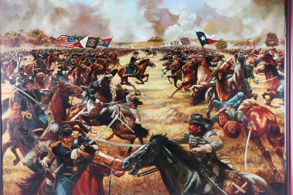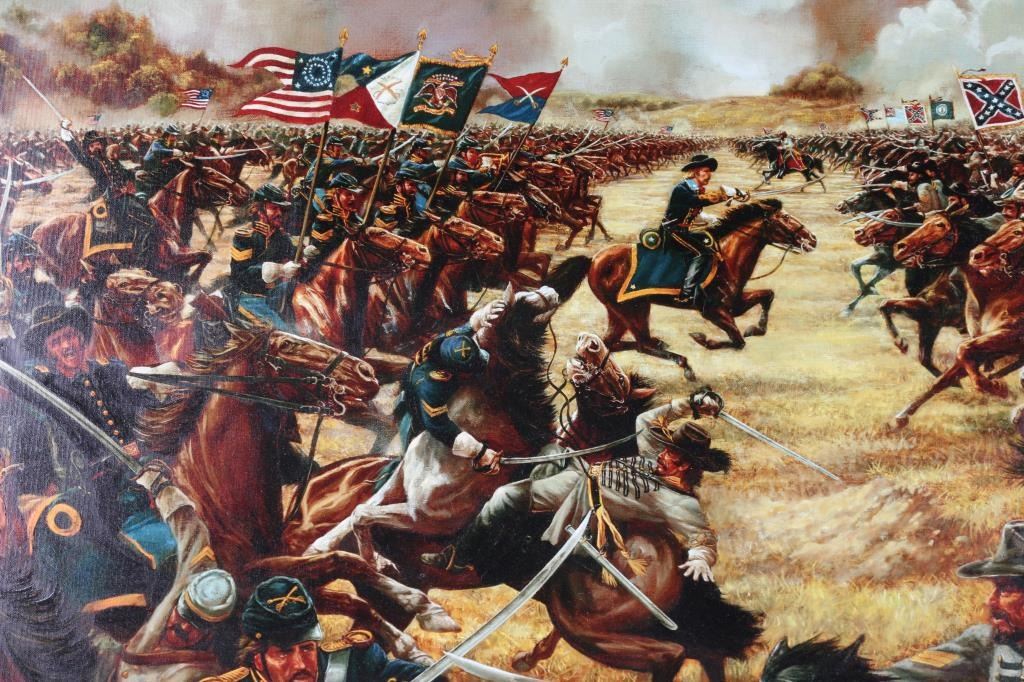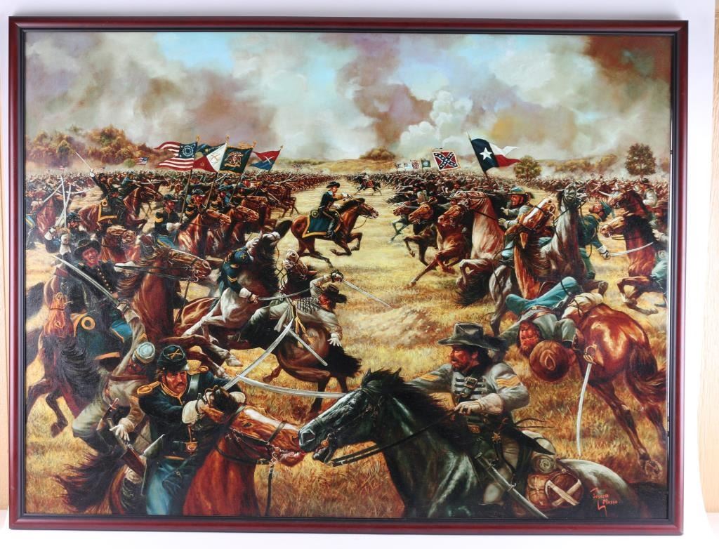 4' X 3' original oil on canvas. Depicting General George Armstrong Custer leading Calvary charge during the "Battle of Gettysburg". Signed by artist, Joseph Musso. Researched and expertly executed by Musso for his private collection. Painting also displayed by the University of the Arts Philadelphia, in the Silver star Exhibition. Valued at $35,000 for exhibition and receipt dates the work, 1977. Excellent condition. From the Joseph Musso Collection