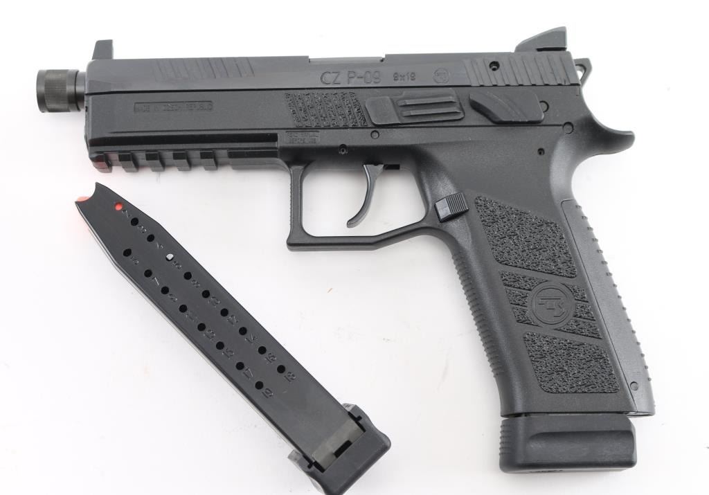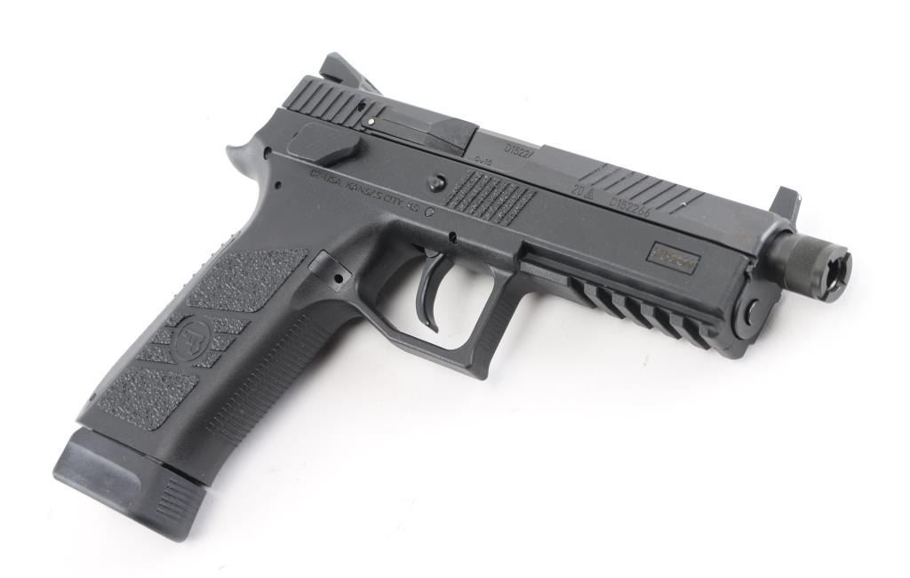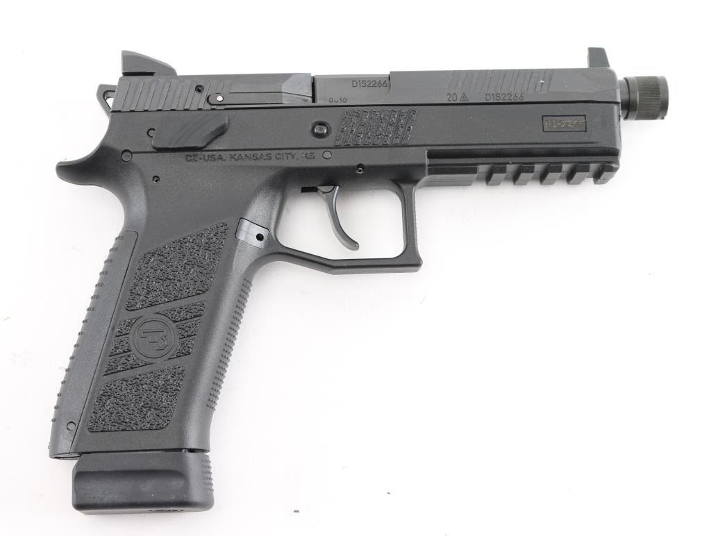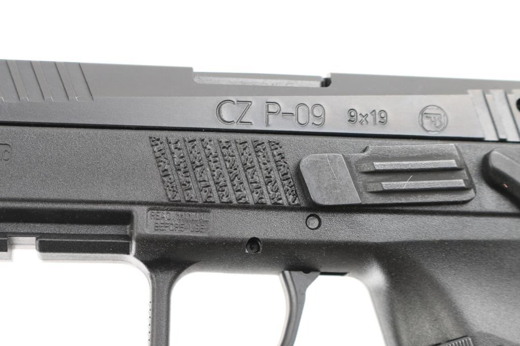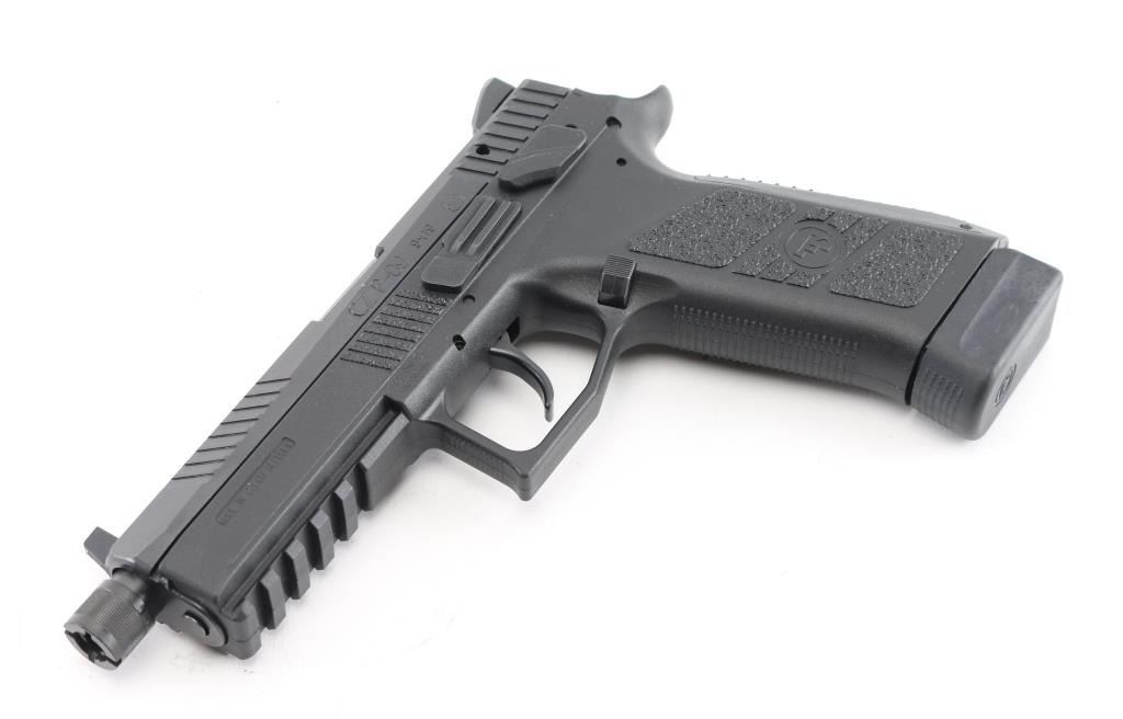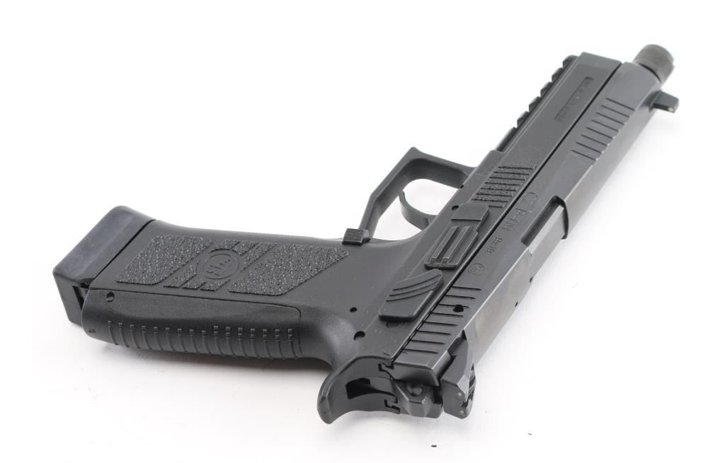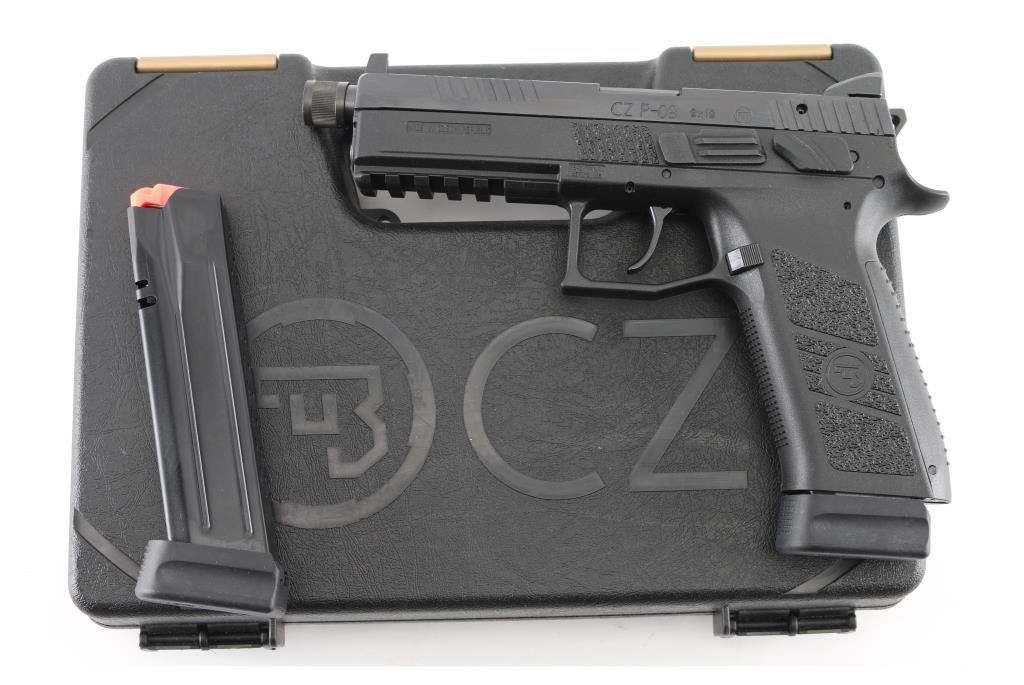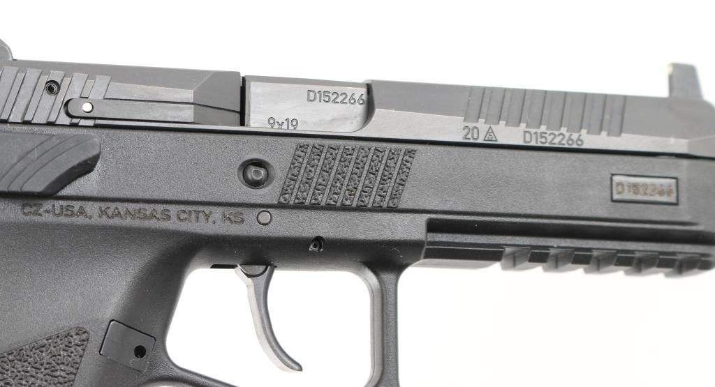 Made in the Czech Republic this is a full size, black polymer frame, semi-auto pistol chambered in 9mm. 5.15" threaded barrel. Black stainless slide has serrations on the front and back. It sports a 5 slot Picatinny rail, ambidextrous decocker and 3 dot luminescent raised night sights. It comes with the original factory hard case, owners manual, cleaning kit, cable lock, extra backstraps and (2) 19 round magazines. This gun is new. Condition: NRA Excellent. Modern Firearm.