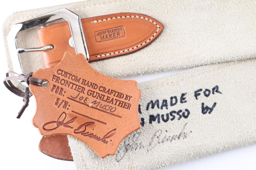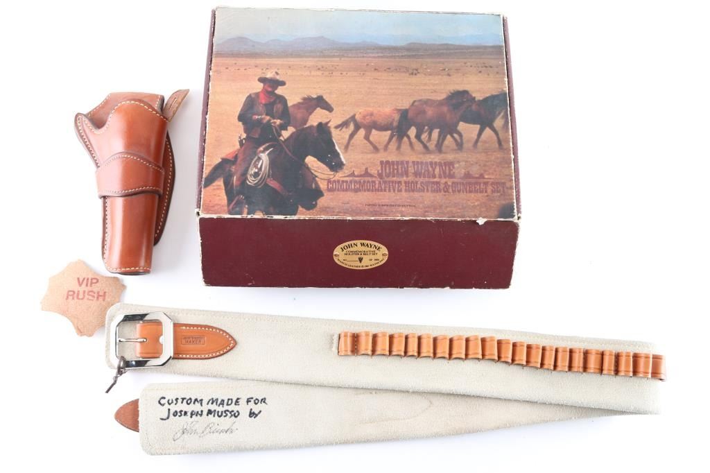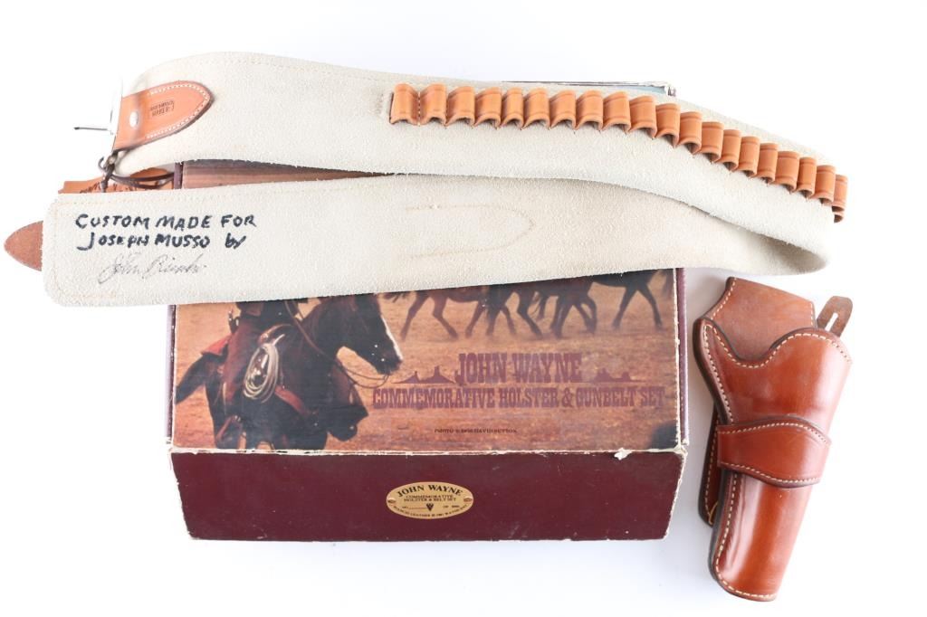 Custom made and signed by John Bianchi for John Wayne. Custom hand crafted by Frontier Gunleather for Joe Musso. Waist size: 36". Excellent condition. Comes with John Wayne Commemorative box w/ S/N#1183 and paperwork. Joe Musso Collection.