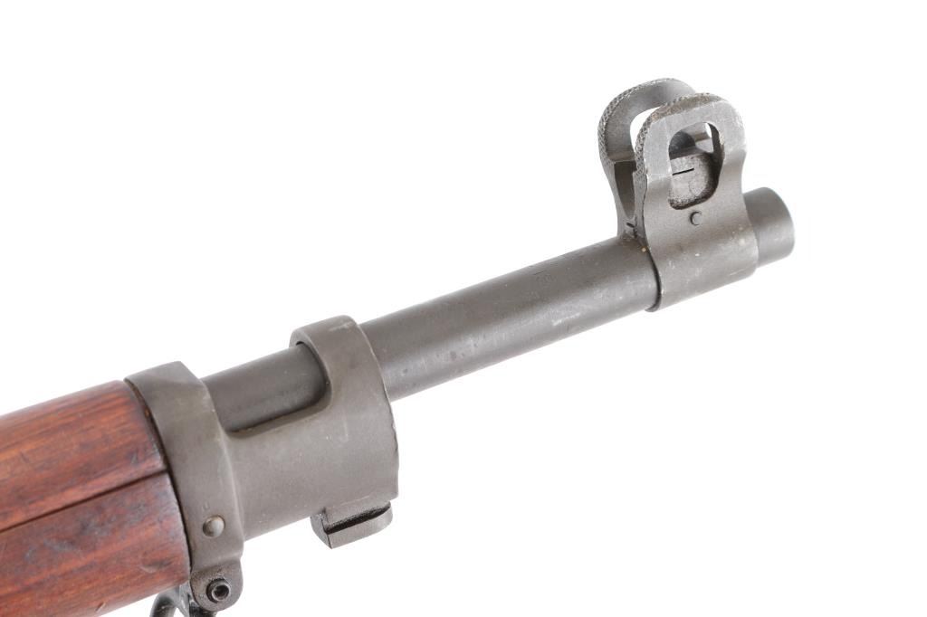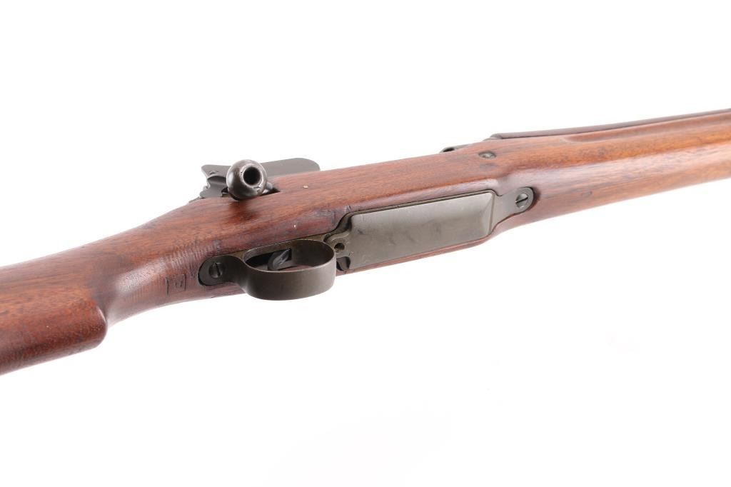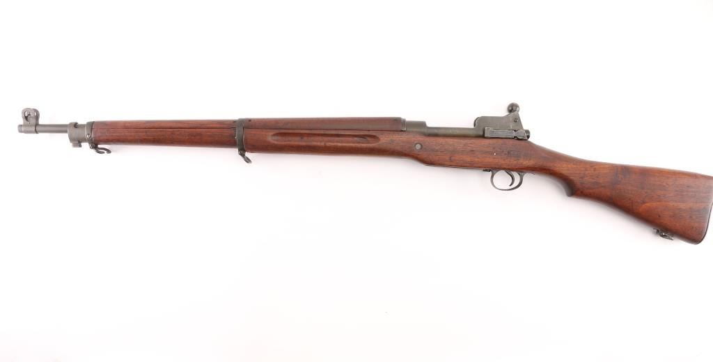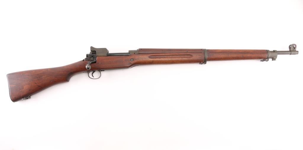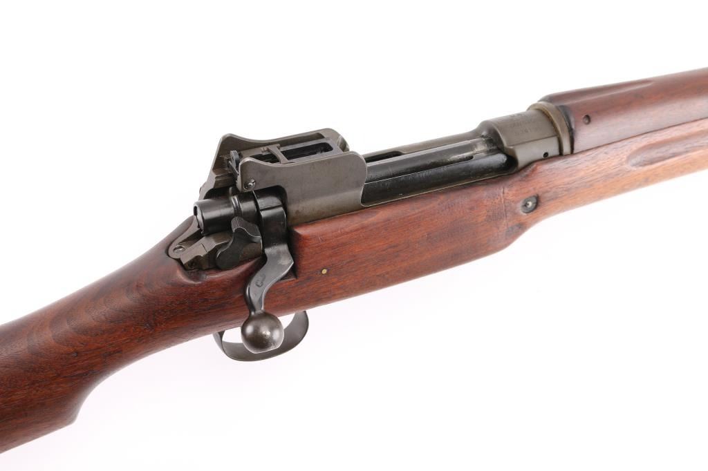 US military Mauser type bolt action rifle manufactured for use in WWI by the Eddystone division of Remington. Often referred to as "Enfield", due to British Enfield type rifling. Refinished with parkerizing, appears arsenal applied. Features 26" barrel, blade front and peep rear ladder sights both protected by steel guards, manual safety, 6 round magazine, wood handguard & stock with grasping grooves, trap door in butt, sling swivels, stacking swivel. Bore is very good condition. Retains 90% finish, showing a greenish tint. Wood has been sanded, retains proper military finish, shows loss of sharp edges in forend grooves. Metal fit to wood is very good. Retains US Army Ordnance "bomb" marks. Cartouches on stock are faint. "E" marked barrel dated "4-18". Condition is NRA Very Good++ as refinished *** C&R Firearm ***