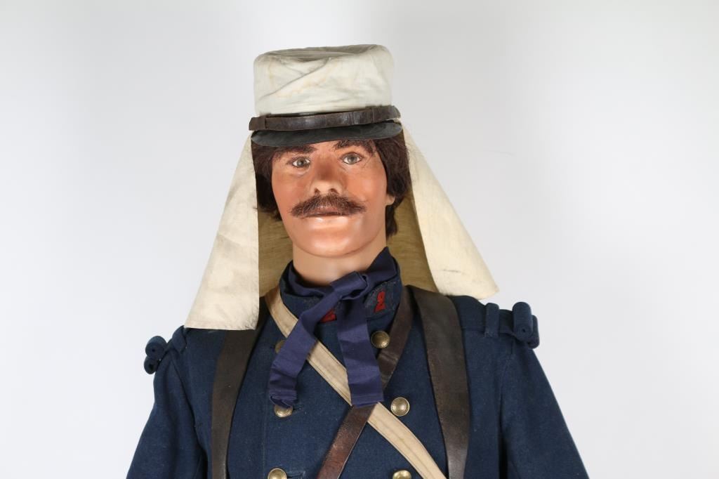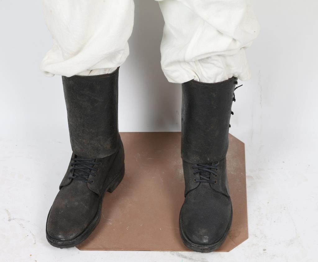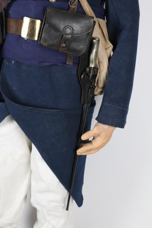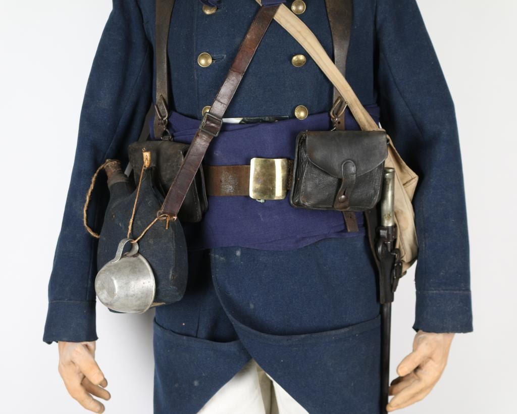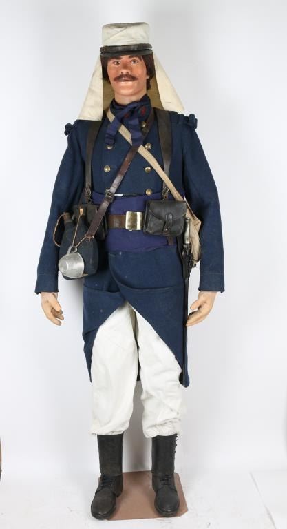 Uniform on mannequin from Joseph Musso private museum display. Hat with summer white cover, tunic with marked buttons, waist belt with brass buckle, canteen, tin cup, Lebel bayonet with scabbard & frog. White button front britches. Leather boots. Condition is good to very good overall with minor aging and imperfections. From the Joseph Musso Collection