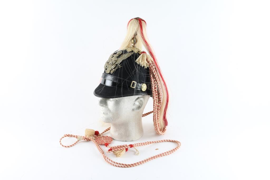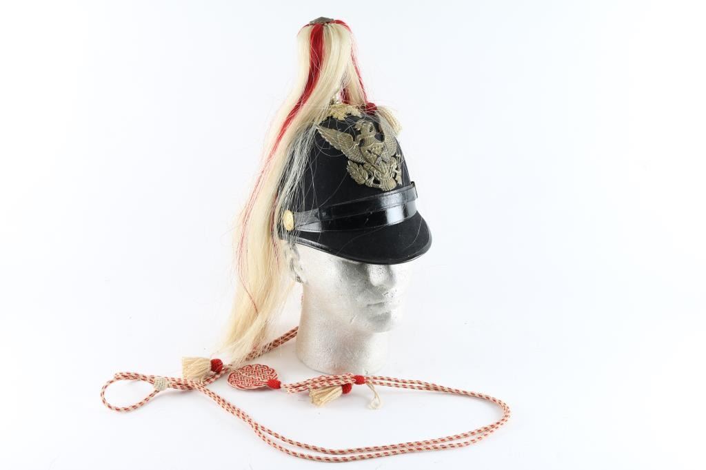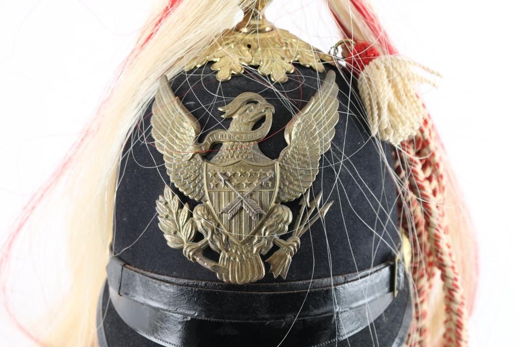 Rarely seen, this helmet has a 1 piece body with an interior sweatband ink stamped " Wm. H. Horstmann Co., Philadelphia. Contract Nov. 20th 1897" The helmet features a cavalry front plate with silver crossed arrows added to the shield. Side buttons also show crossed arrows. The long plume and the aiguillette are red & white as is correct for an Indian Scout. Condition is excellent inside & out, The felt, leather, horse hair plume, and furniture are all in great shape. From the Joseph Musso Collection