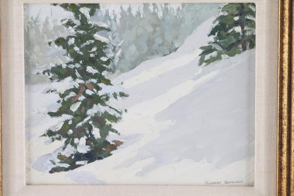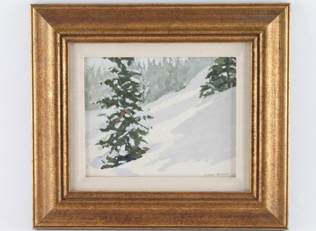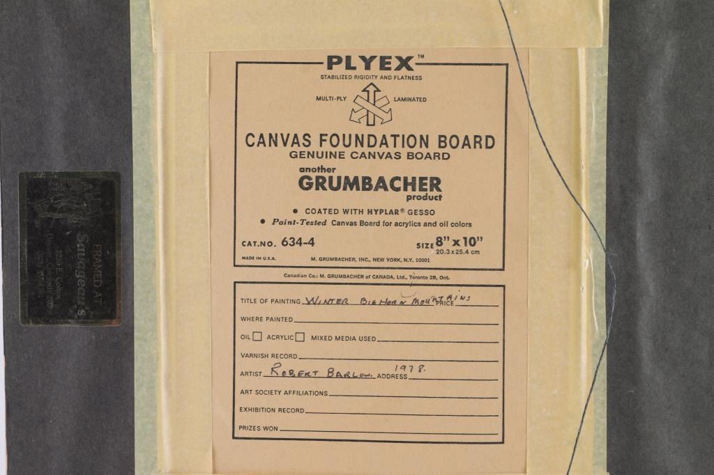 By artist "Robert Barlow" done in 1978 entitled "Winter Big Horn Mountains" signed lower right. Framed and nicely matted. Image size measures 9.5x7.5.