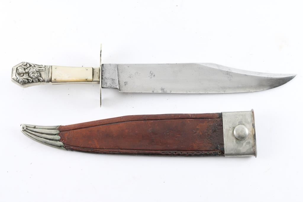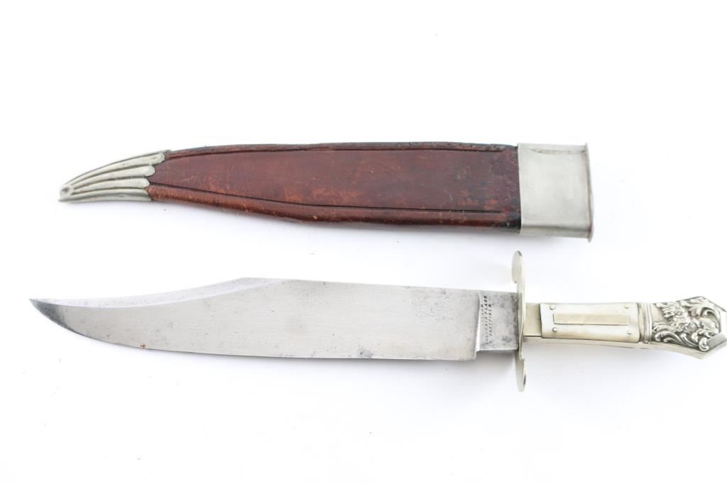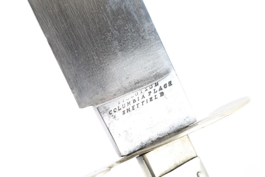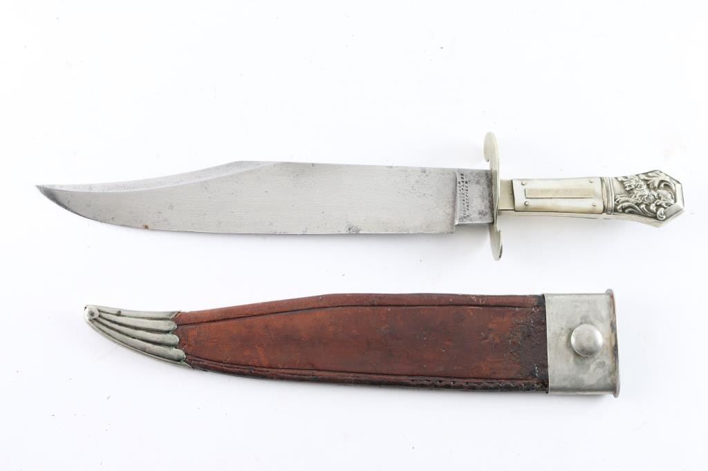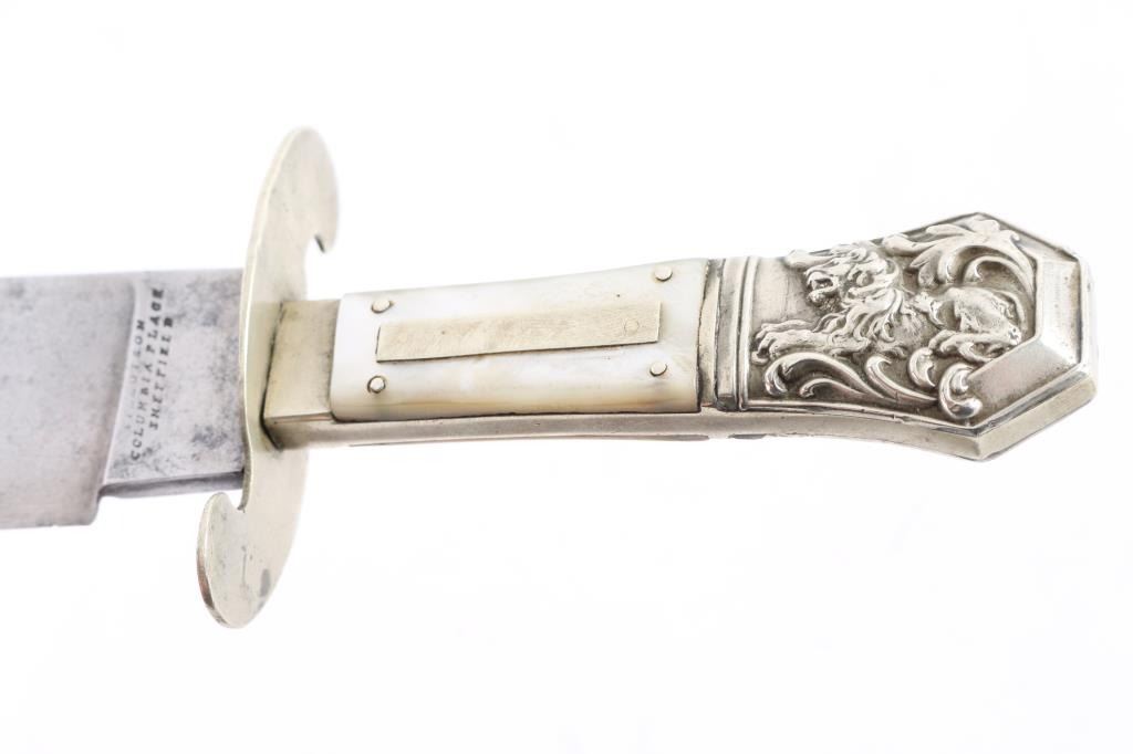 Trade marked, "Tillotson Columbia Place Sheffield" on ricasso w/ dye-struck lion pommel and pearl scales. Circa 1850. Features a 10 1/4" blade, 14 1/2" overall. Associated original to period scabbard, fits well but from earlier knife, has scalloped metal tip and German silver throat w/hanger button. Knife usually has etching of California Gold Seeker, but has been used and polished to no etching visible on blade. Condition is overall Very Good. From the Joseph Musso Collection
