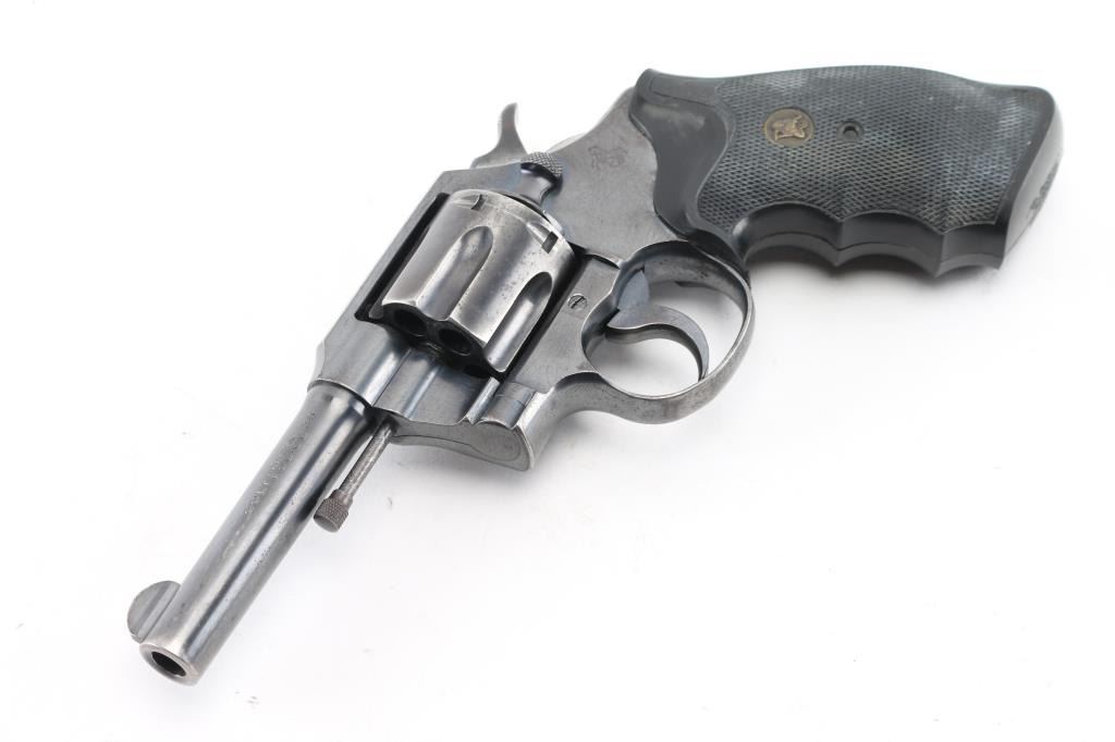 ‘Pre-War’ Medium frame double action revolver chambered in .38 Special, manufactured circa 1929. Features a blued finish, 4" barrel, round blade front sight, ‘u’ notch rear sight, fluted six-shot cylinder, non-shrouded ejector rod, smooth trigger, knurled hammer spur, square butt E frame and Pachmayr Gripper black rubber grip with finger grooves. Bore is very good condition. Retains 75% finish with edge losses, scratches, some light patina, bare metal on triggerguard. Grips are very good. Action is smooth with tight lock-up, a bit sluggish with a feeling like too much grease has been applied. Condition is NRA Very Good+ *** C&R Firearm ***