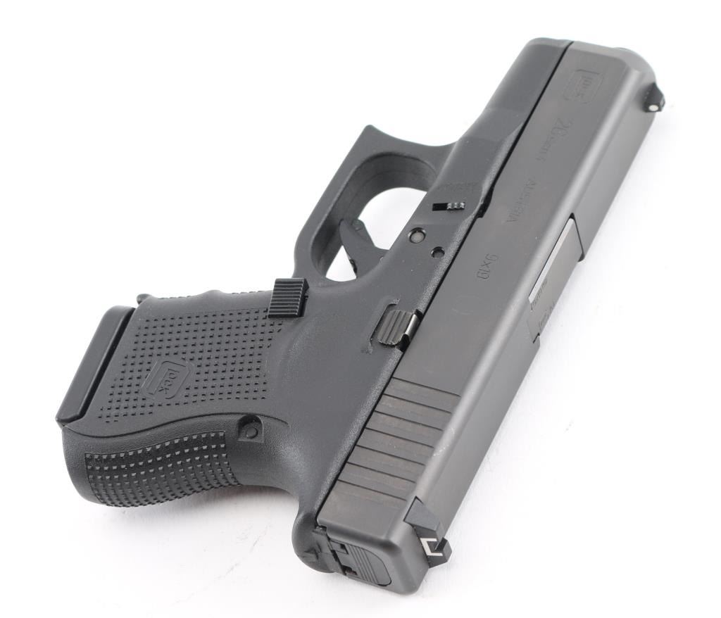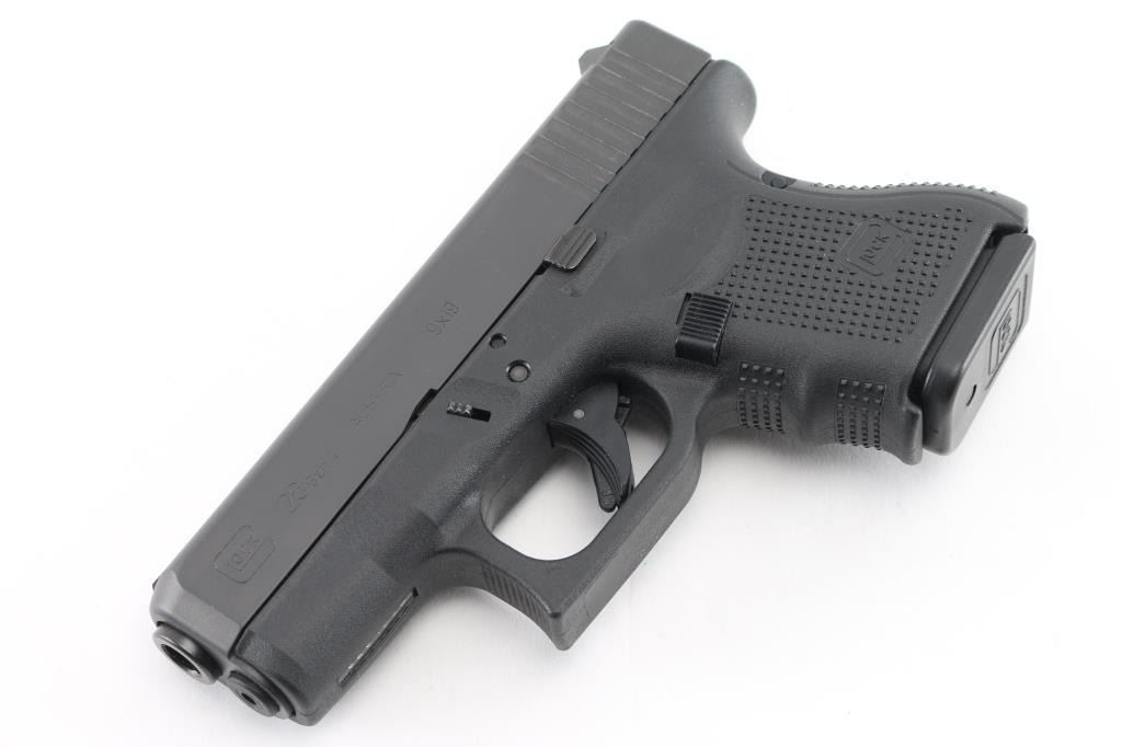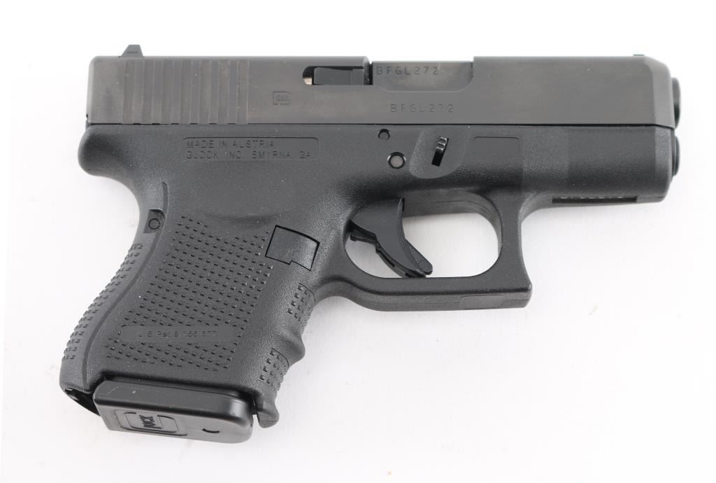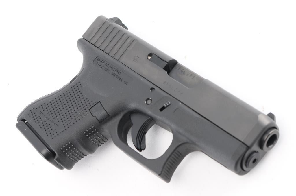 'Short Frame' Austrian made sub-compact safe-action semi-automatic pistol imported by Glock, Smyrna GA. Features a black finished slide, 3.3" barrel, front dot, rear white outline night sights, trigger safety, push button magazine release, factory 10 round magazine, black polymer frame with textured finger groove grip. Includes the original factory hard case with documents, interchangeable grip back straps (4 total), spare magazine (3 total), magazine loader and lock. Condition is NRA Excellent *** Modern Firearm ***
