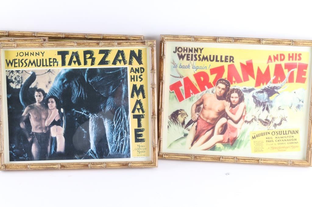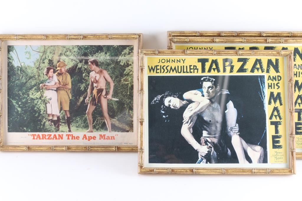 Collection of four authentic MGM production movie cards. All 11" X 14" and framed with simulated bamboo. 1) 3 - cards from the movie "Tarzan and His Mate", different scenes, starring Johnny Weismuller and Maureen O' Sullivan in 1934. 2) 1 - card from the movie, "Tarzan the Ape Man", starring Johnny Weismuller and Maureen O' Sullivan in 1932. Good to very good condition. From the Joseph Musso Collection