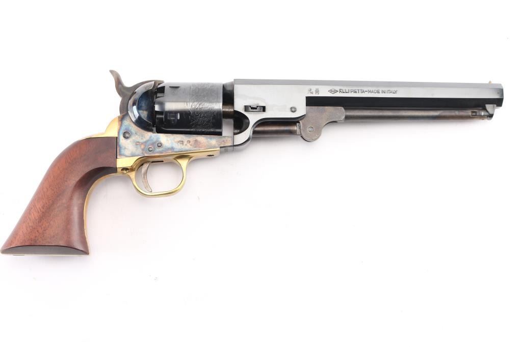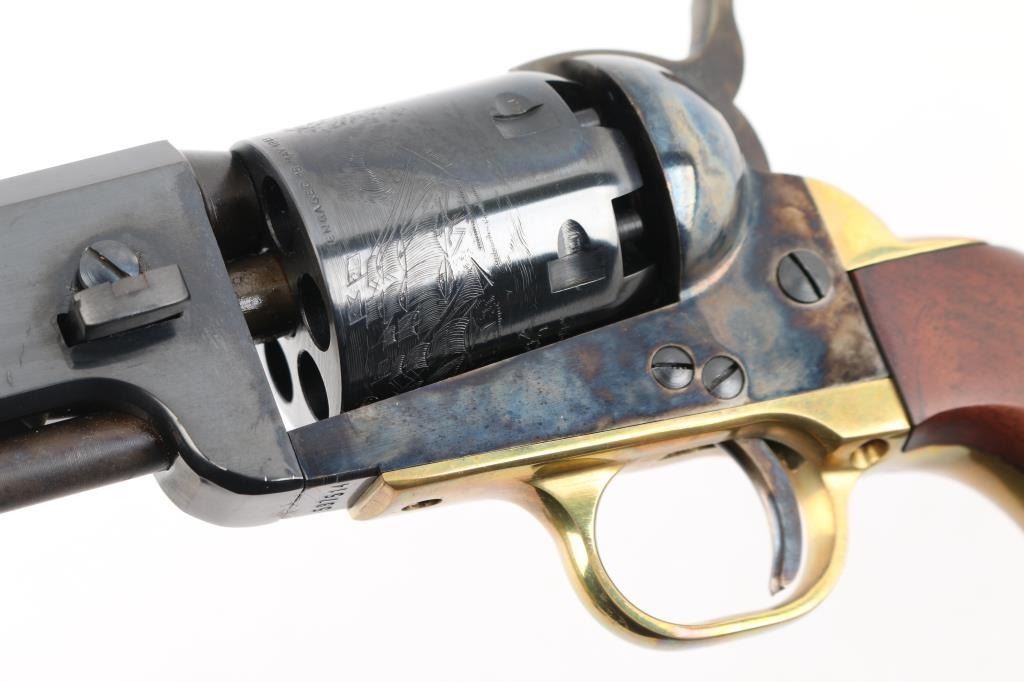 Italian reproduction of the 1851 model Colt cap-n-ball percussion revolver. For black powder only. Features blued & case colored finish, brass round triggerguard, brass backstrap, 7.5" octagon barrel, brass cone front sight, rear sight on hammer lip, six shot unfluted cylinder with roll engraved battle scene, loading lever, one piece smooth walnut grip. Condition is like new, no signs of firing, with few minor blemishes. Condition is NRA Excellent - like new *** "Antique" Firearm ***