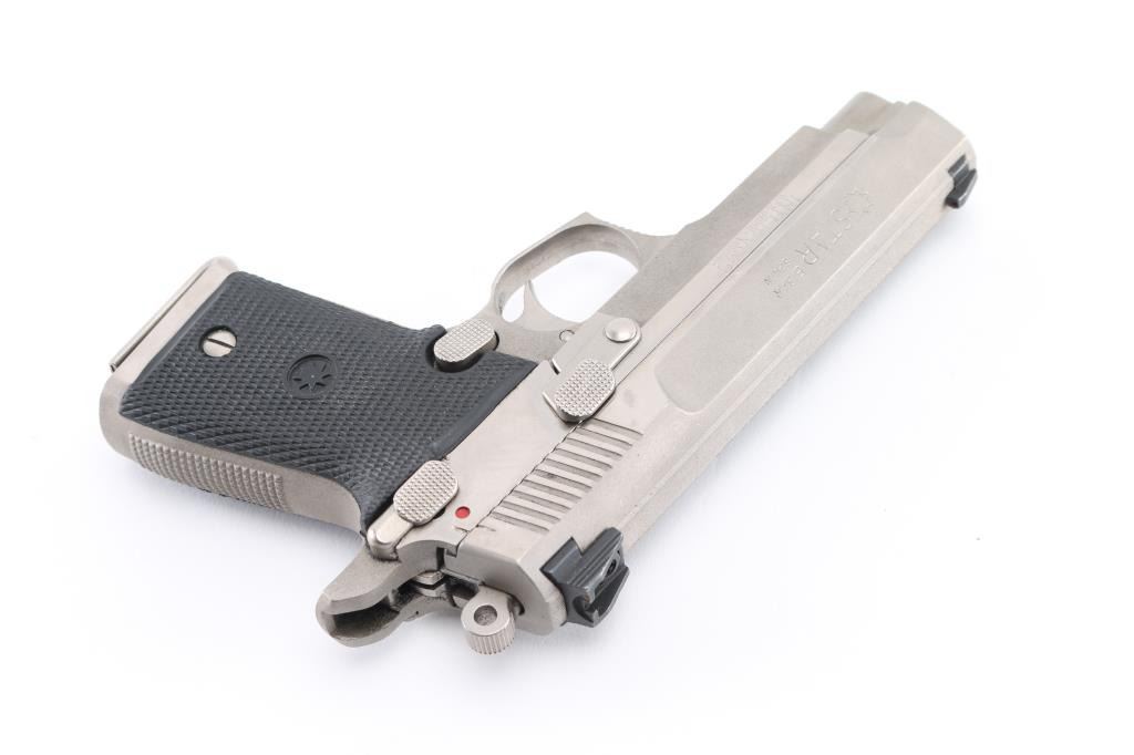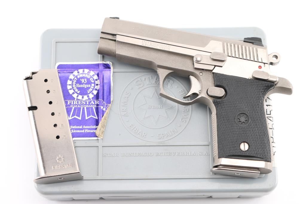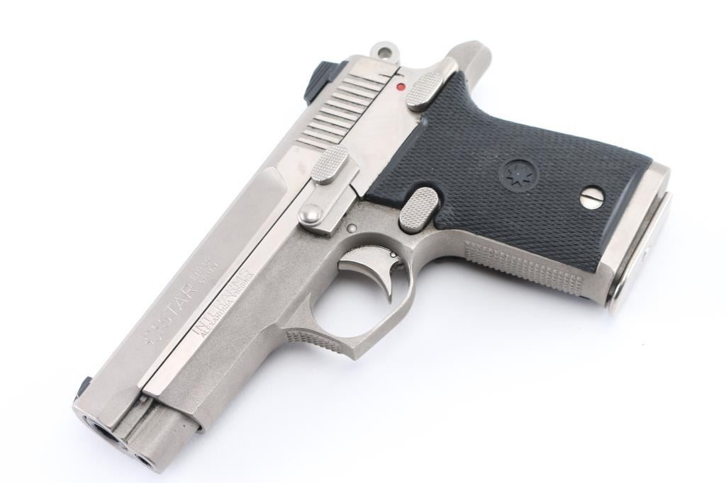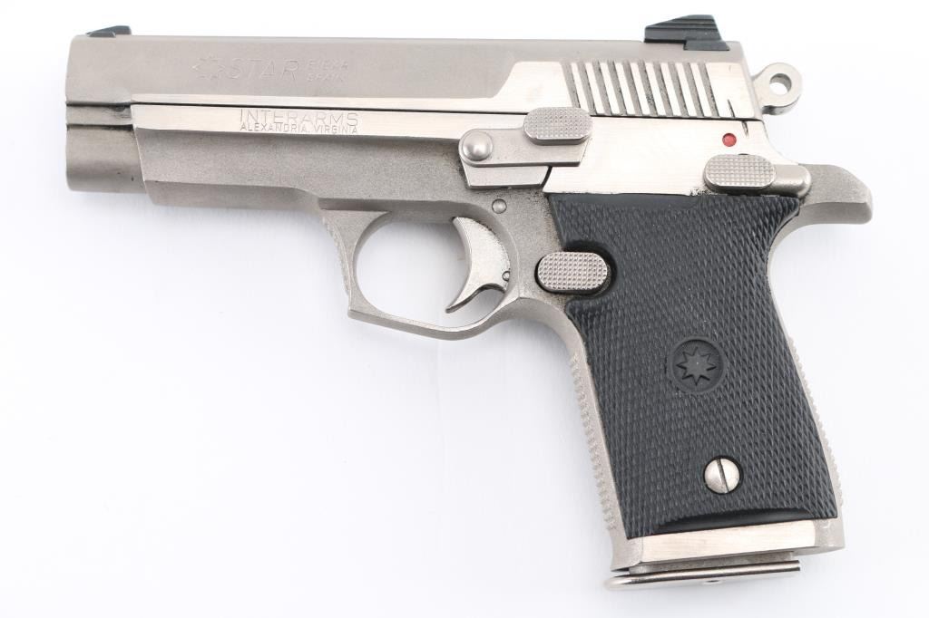 Spanish semiautomatic pistol imported by Interarms of Alexandria VA. Star also called this "M-43". Features stainless steel construction, single stack magazine, single action trigger, frame mounted ambi manual safety, 3.5" barrel, 3 dot sights in dovetails, black rubber grips. Bore is excellent. Appearance is excellent with few signs of use. Includes two magazines, factory box and manual. Condition is NRA Excellent *** Modern Firearm ***