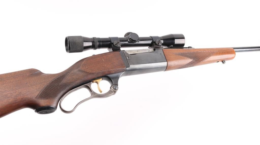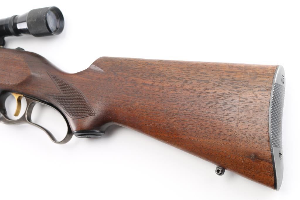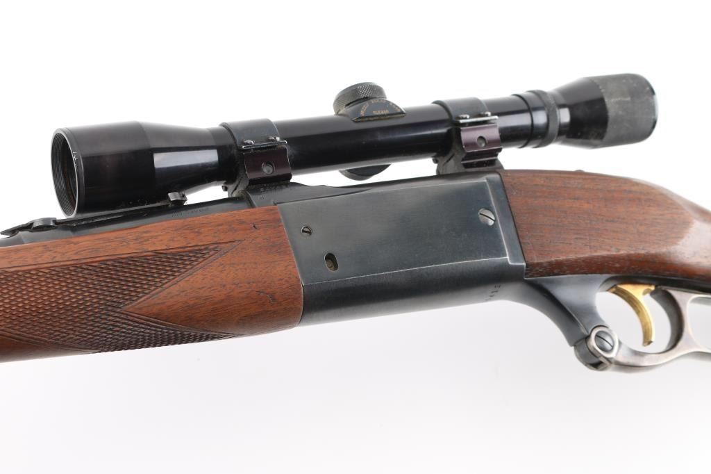 Lever action rifle manufactured circa 1961. Features blued finish, checkered walnut forend & curved wrist shoulder stock, serrated steel buttplate, 22" barrel, blade front sight, sporting rear sight, fixed rotary magazine with brass cartridge counter, tang safety/lever lock, cocking indicator, sling studs. Bore is very good condition. Retains 90% finish, with handling marks, edge losses. Bolt has bright jeweled surface. Case hardened colors on lever faded to mottled silver colors. Wood is very good condition with dents & scratches, slight finish loss near buttplate. Mounts a very good condition vintage Japanese made Swift Grizzly 2.5x32mm scope (clear view, fine crosshairs). Condition is NRA Very Good++ *** C&R Firearm ***