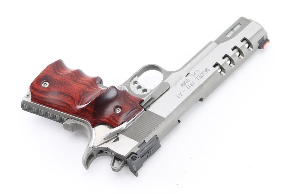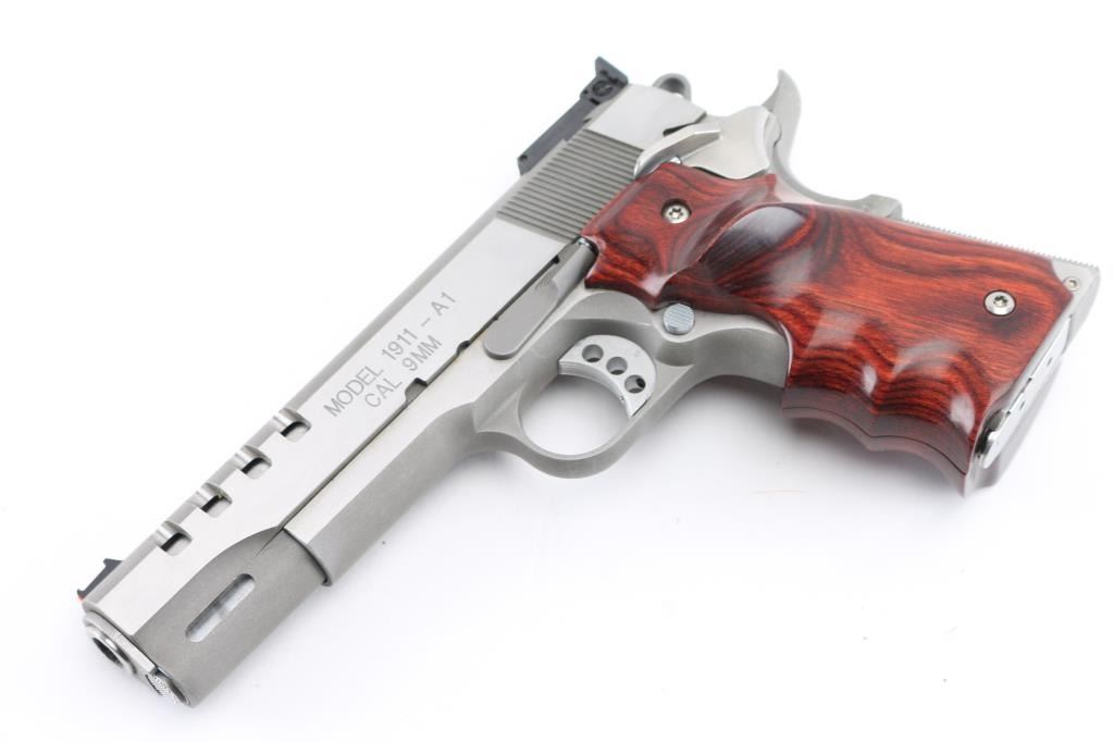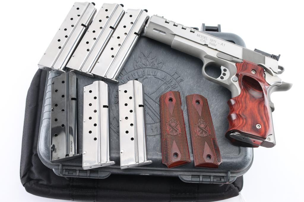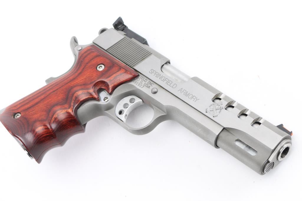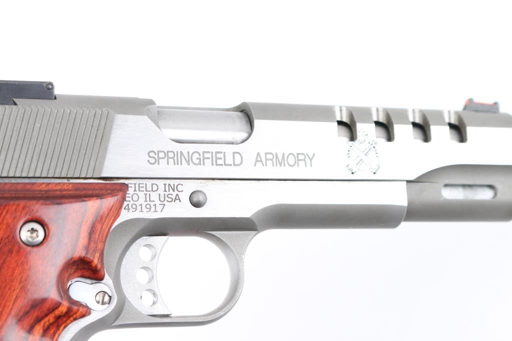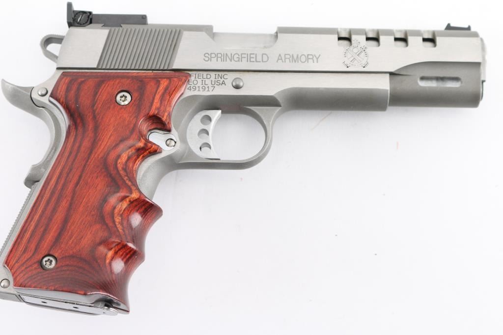 All stainless steel 1911 style single action semi-automatic pistol. Features 5" barrel, lightened slide, dovetailed red fiber optic, adjustable square notch sights, skeletonized, serrated trigger with overtravel adjustment, serrated hammer spur, extended thumb safety, upswept grip safety with memory hump, push button magazine release, checkered flat mainspring housing and two-piece smoothly contoured wood laminate grips with wrap around finger grooves, thumb, & palm rests target grips. Pistol exhibits little visible wear, a very minor scratches on the slide. Action is strong, bore is excellent and wood grips are fine. Includes the original factory hard case with & manual, cable lock, checkered wood diamond grips original to gun, and 6 magazines for a total of seven. Also included ia a blasck nylon Springfield 1911 range bag.. Condition is NRA Excellent