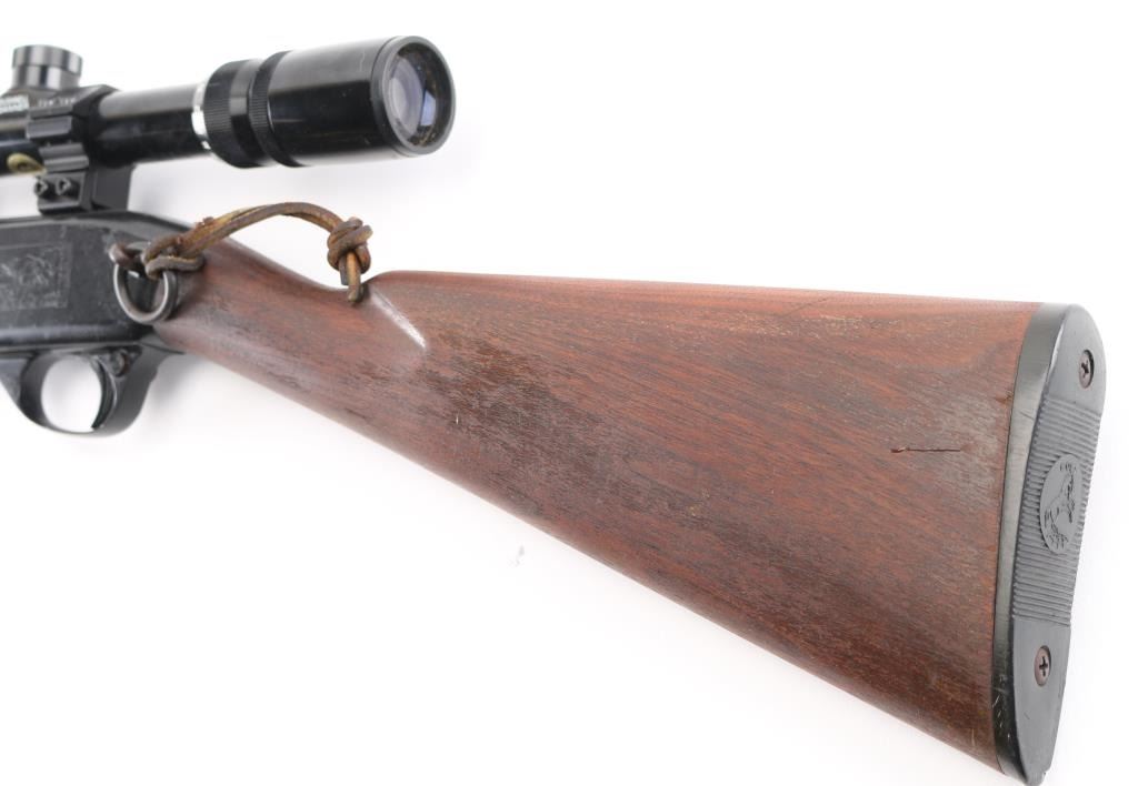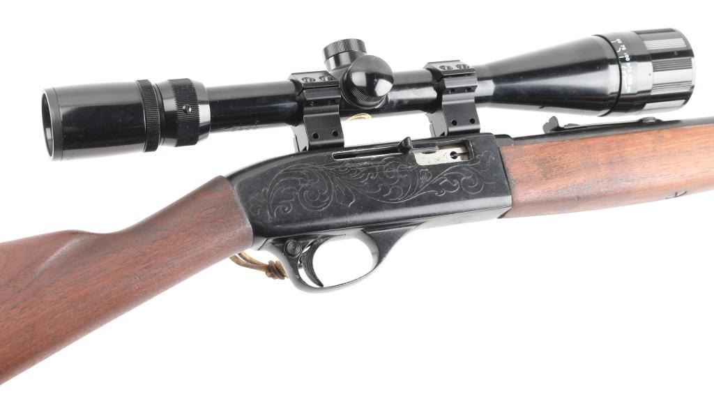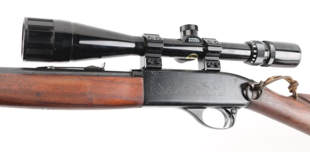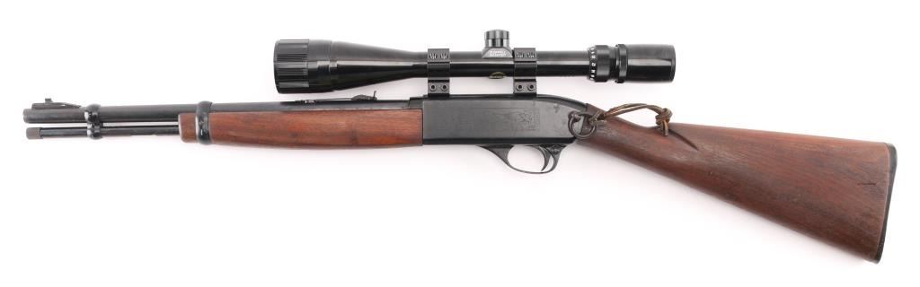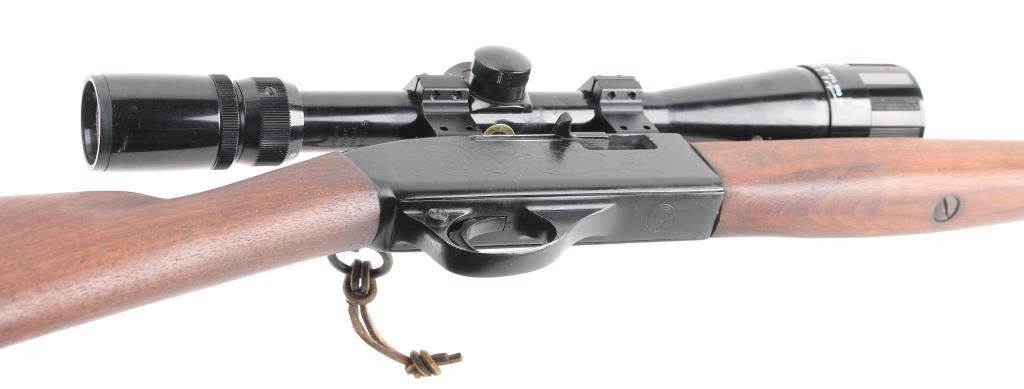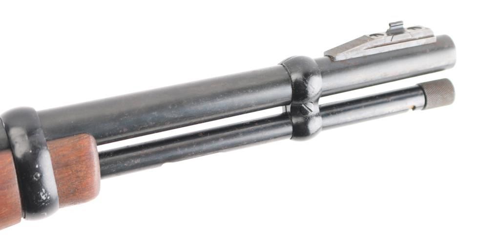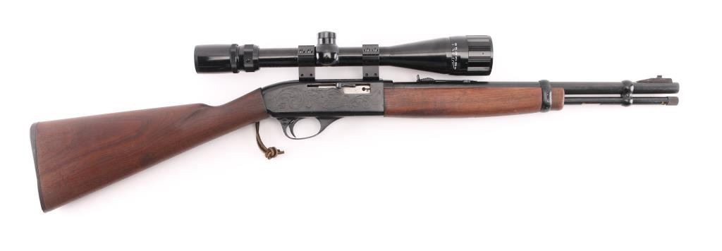 'SRC' Tube fed semi-automatic rifle chambered in .22 Long Rifle, circa 1965-1975. Features a black finish, 16.5" barrel, full length 13 round tube magazine, ramped blade/bead front sight, adjustable rear sporting sight, smooth trigger, push button safety, serrated charging handle, saddle ring, roll stamped stagecoach holdup scene on receiver, sling swivels, smooth walnut forend and straight grip shoulder stock with factory buttplate. Rifle exhibits approximately 90% of it's original matte black finish showing a few specs of light surface rust on the barrel and several small losses on the receiver. Action is smooth, bore is very good and wood stocks are very good+. NRA Condition is very good. C&R Firearm.
