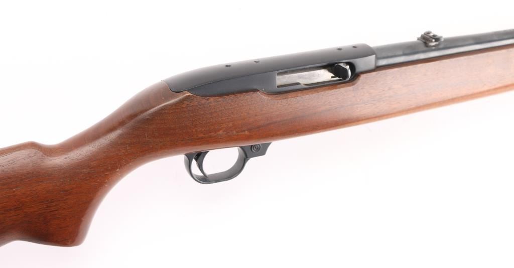 American made semi-automatic carbine, blued finish, approximately 18 5/8" barrel, bore is very good, blade/brass bead front sight, flip-up open notch rear sight, drilled/tapped receiver, smooth trigger, smooth wood stock with a pistol grip, minor scratches. Blue/matte black is 99%. No rotary magazine. NRA Condition-Near Excellent. Modern Firearm.