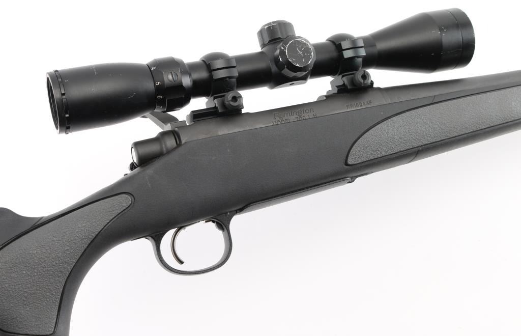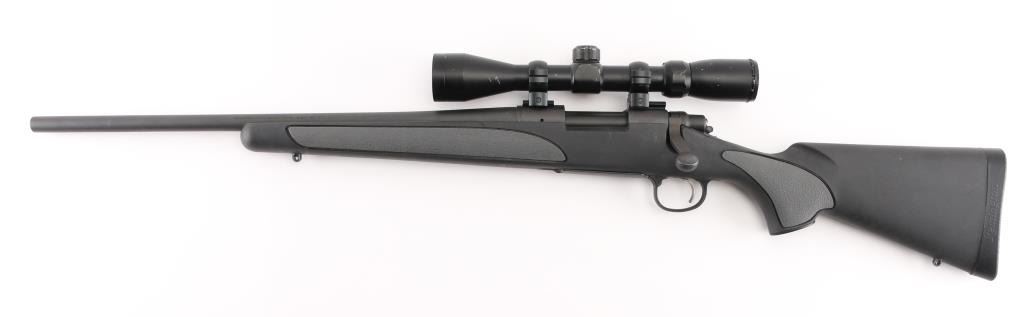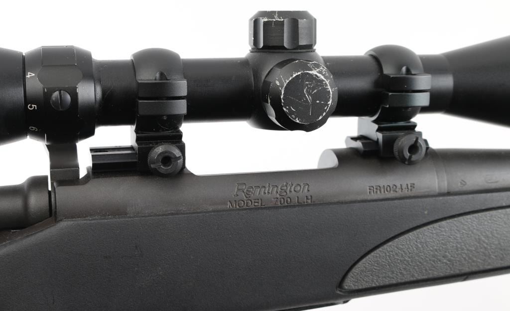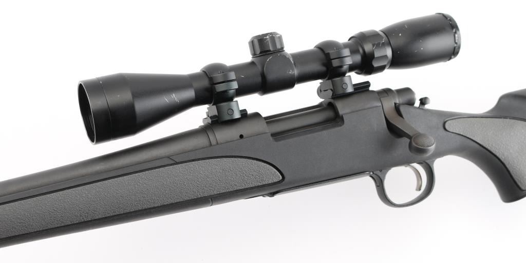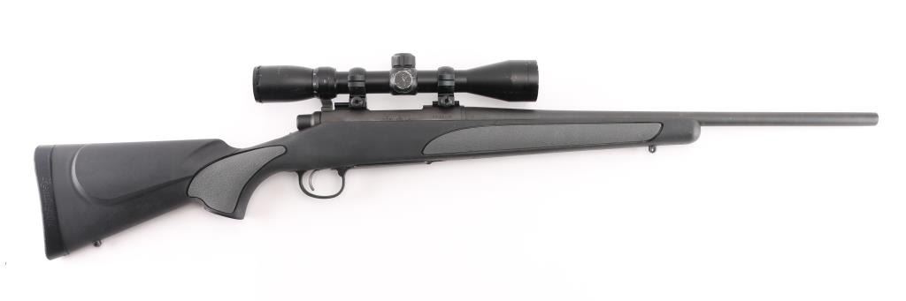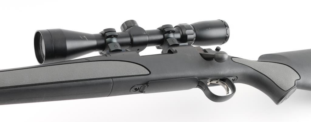 Left Hand bolt action rifle chambered in .243 Win., 20" crowned barrel with black finish, synthetic black stock with gray textured palm and fore-end inserts, solid rubber recoil pad, sling studs, no sights, manual safety, hinged floorplate. Bore is in excellent condition. Comes with mounted after market 3 X 9 scope with clear view. Condition is NRA Excellent. Modern Firearm.