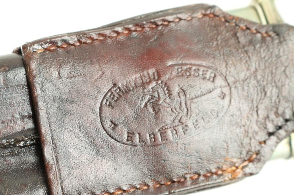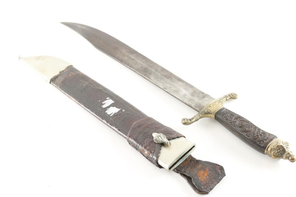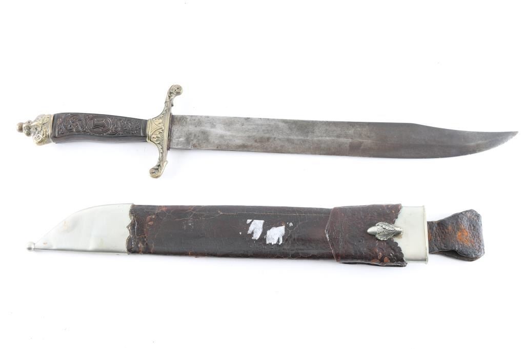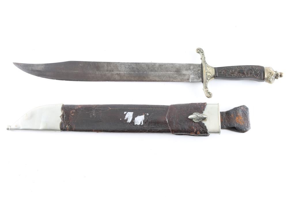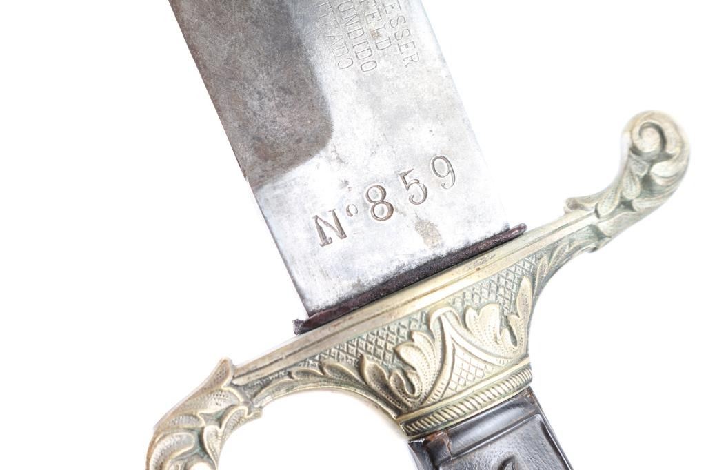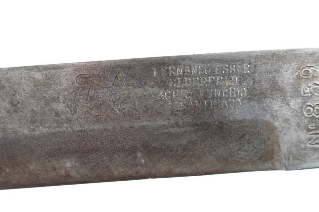 Made for export to Mexico and South America, marked "Fernando Esser Elberfeld Acero Fundido Garantizado, No. 859 & Trademark logo of horse. Circa 1880's. Features a 14" clip point blade, fancy brass mounts and processed horn grip scales. Embossed leather scabbard w/ German silver mounts and frog on carrier retainer. Blade shows dark patina w/ moderate wear and use. Scabbard has some cracking and some aging. Good to Very Good condition. From the Joseph Musso Collection