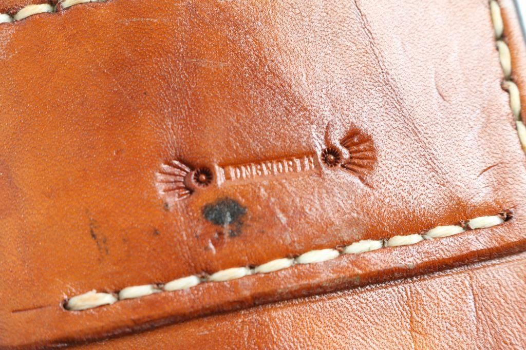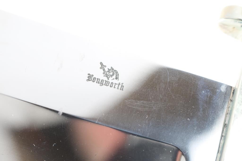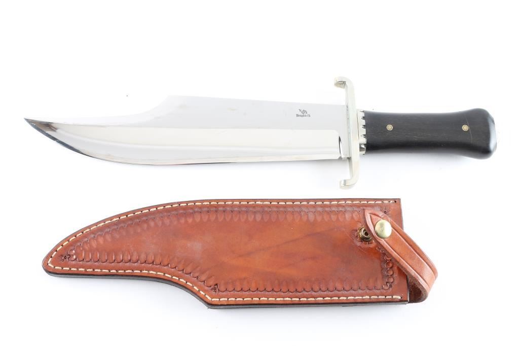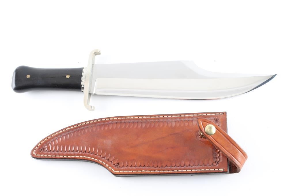 Custom Bowie knife and scabbard, both marked "Longworth". Highly polished 11 1/2" clip point blade, 17" overall. Shiny steel guard, dark grips w/ two fancy pins and shiny steel pommel. right grip had hairline crack. Overall excellent condition. From the Joseph Musso Collection