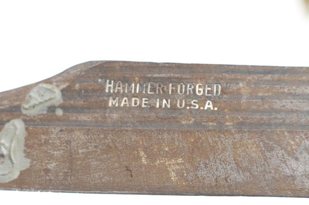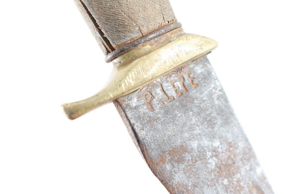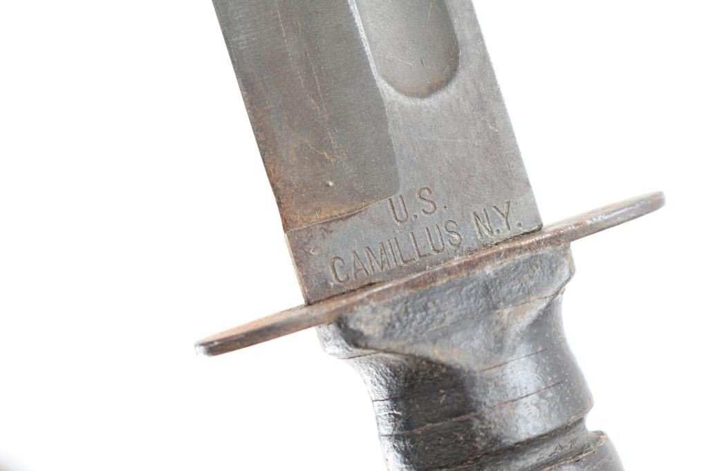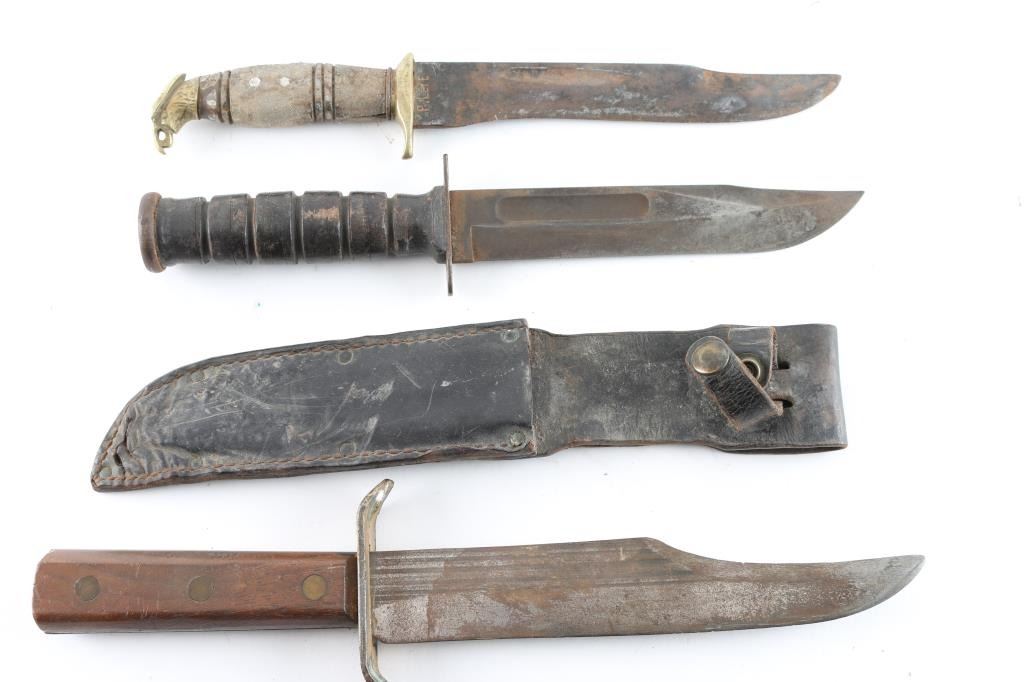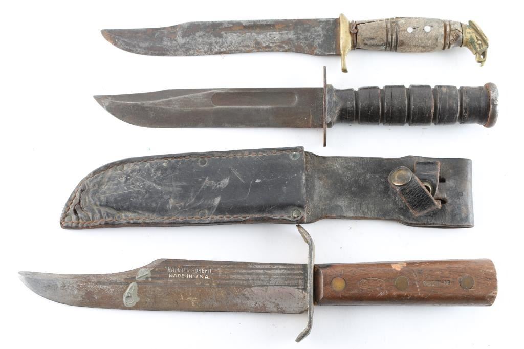 Includes Mexican Bowie knife with brass eagle head and stamped, "P. Lete" w/ no scabbard; cast steel stamped Bowie knife w/ 9"blade, made in the USA. Wood grips stamped with date and illegible name; US Camillus knife w/black scabbard. All from poor to fair condition. Joe Musso Collection.