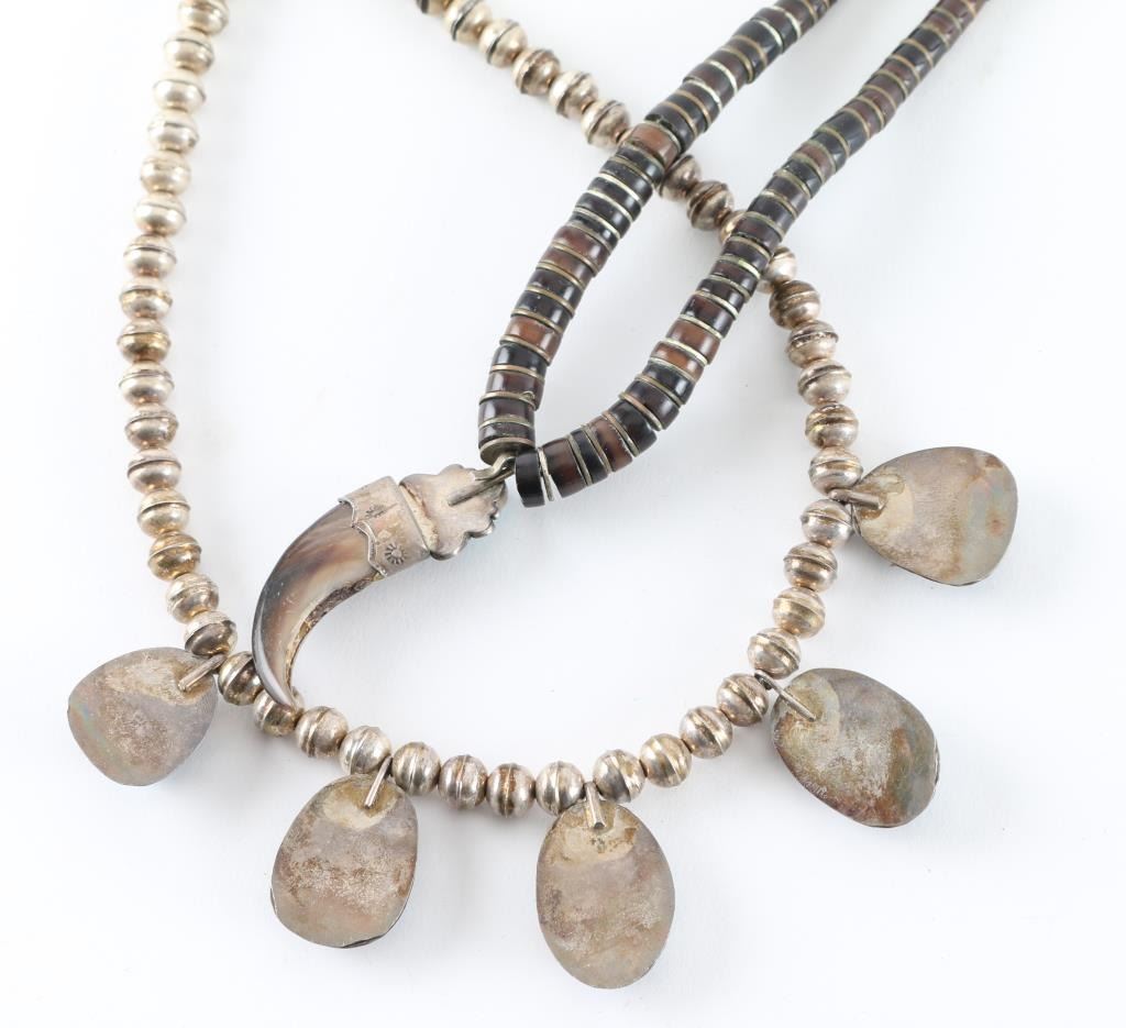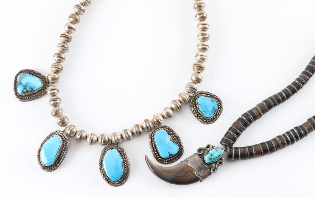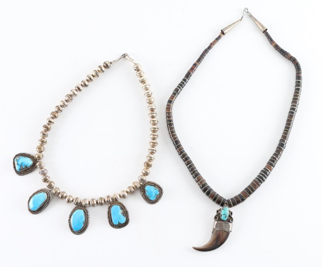 (1) Navajo Turquoise Necklace with 5 sleeping beauty stones unsigned on silver colored beaded necklace. (1) Navajo Bear Claw Beaded Necklace