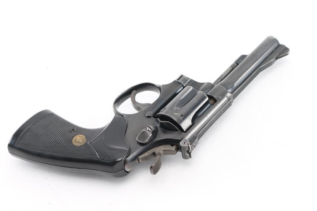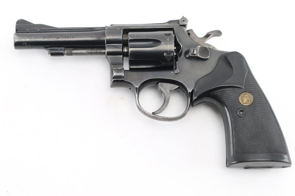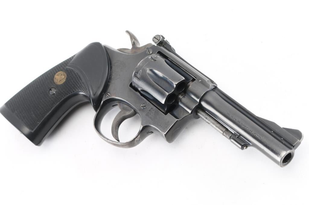 'The K-38 Combat Masterpiece' Medium frame double/single action revolver circa 1954, chambered for 38 Special cartridges. Features blued finish, Pachmayr Presentation grips with Pachmayr medallions, pinned 4" barrel, adjustable sights with serrated ramp front sight, grooved trigger, knurled wide spur hammer, Five screw square butt K frame. Bore and cylinder charge holes are very good. Retains 80% finish with handling marks, edge wear, holster marks at muzzle. Grips are very good condition. Action is smooth, lock-up is tight. Numbers match where observed. Condition is NRA Very Good+ *** C&R Firearm ***