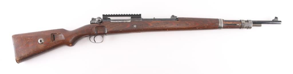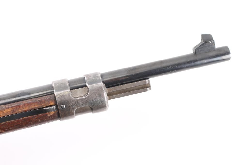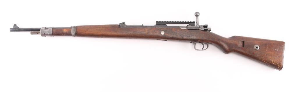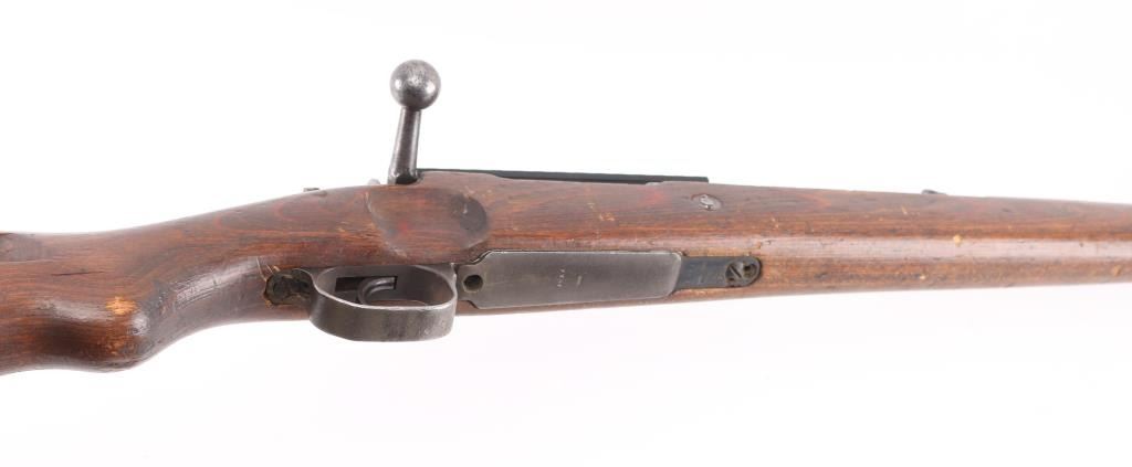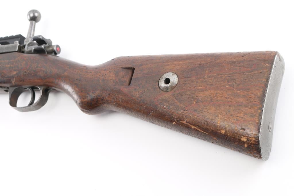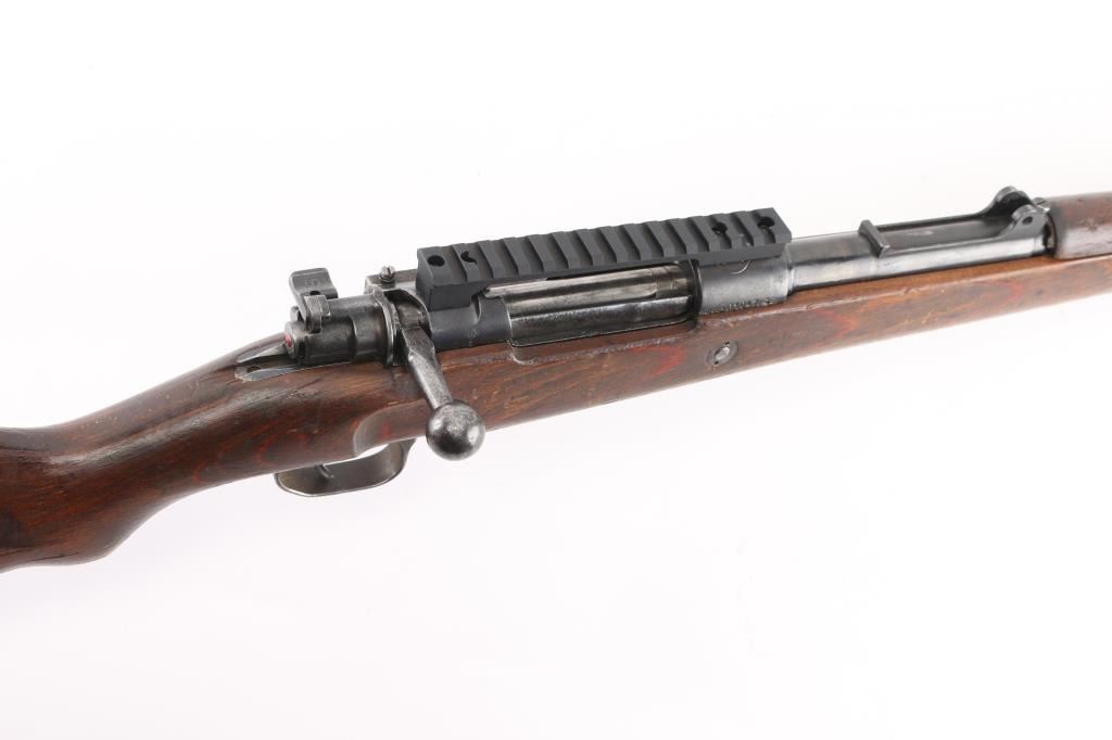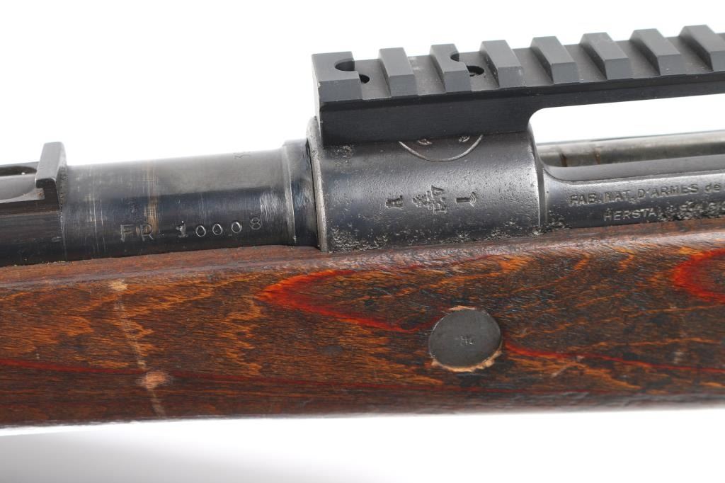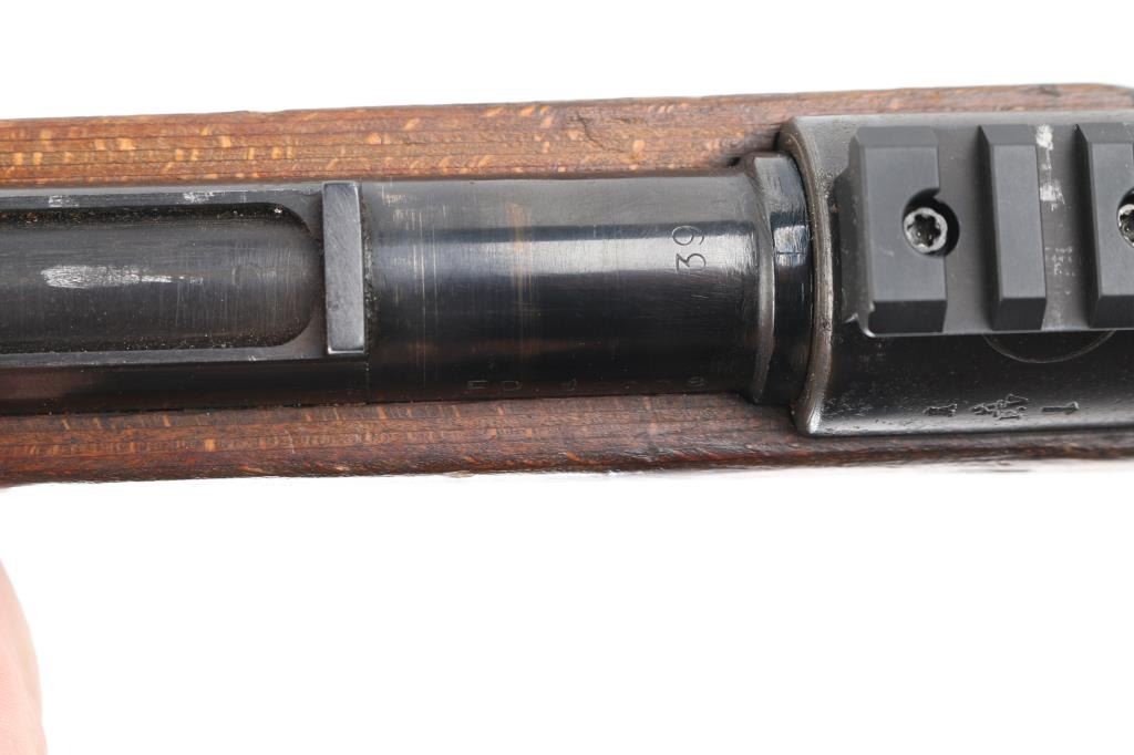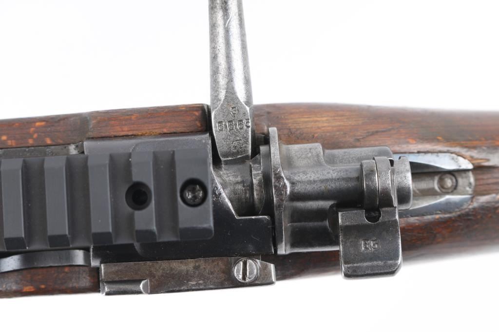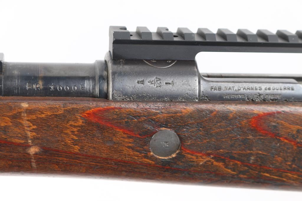 Belgian made military bolt action rifle, imported by CAI, St Albans VT. Stock and bottom metal appear to be from a German K98k. Features 24" barrel, blade front sight, rear sight removed leaving only the base, straight bolt handle, manual safety, wood stock and handguard, Picatinny rail sight based attached to receiver with screws. Bore is fair to good, dark with strong rifling, light pitting and frosting throughout, counter bored at muzzle. Retains 60% finish on barrel & receiver with pitting along wood line, bottom metal has faded to brown or bare metal, stock hardware mostly bare metal. Wood is good condition, solid overall, many scratches and scrapes. Barrel numbered, mismatched to receiver. Condition is NRA Good (as modified) *** C&R Firearm ***