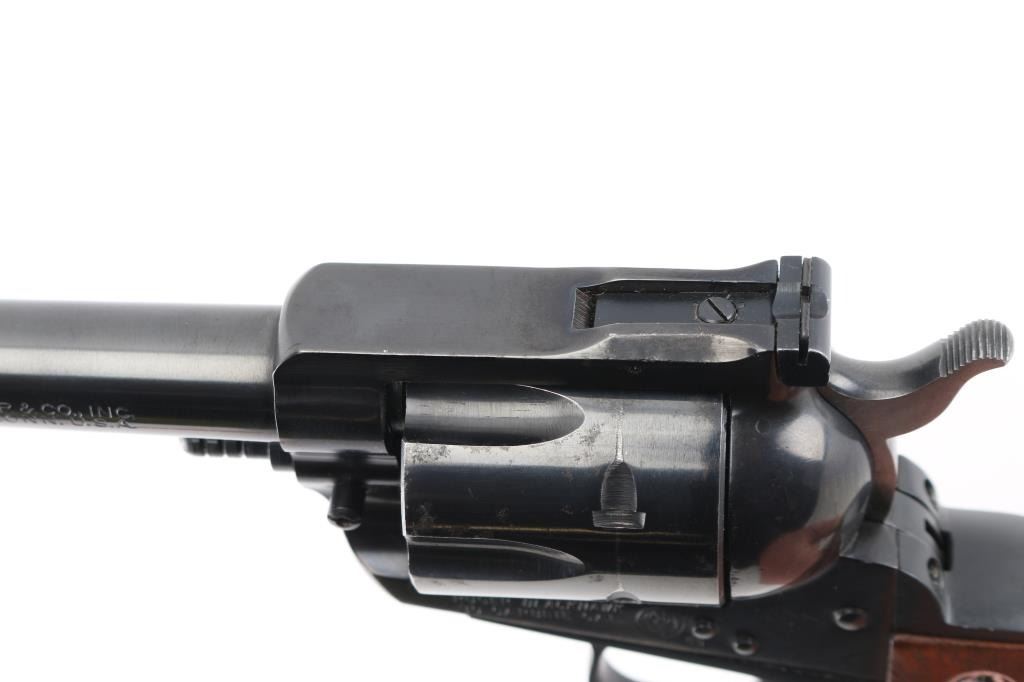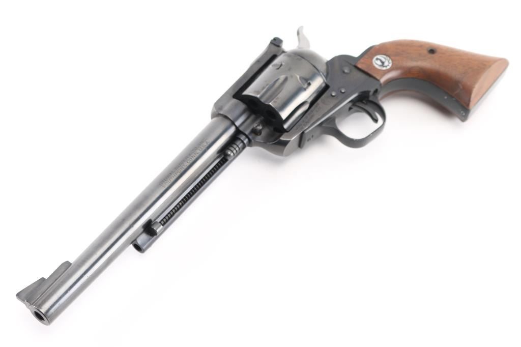 'Old Model Three-Screw' Single action revolver manufactured circa 1968. Features blued finish, smooth wood grips with silver & black Ruger medallions, 7.5" barrel, fluted 6 shot cylinder, adjustable sights. Bore is excellent. Retains 90% finish with edge losses, small amount of holster wear, patina spot on cylinder. Action operates smoothly, with tight lock-up. Grips are very good with minor scratches/dents/ NRA Condition-Very Good. C&R Firearm.