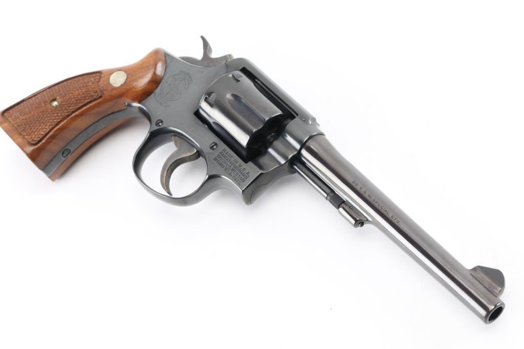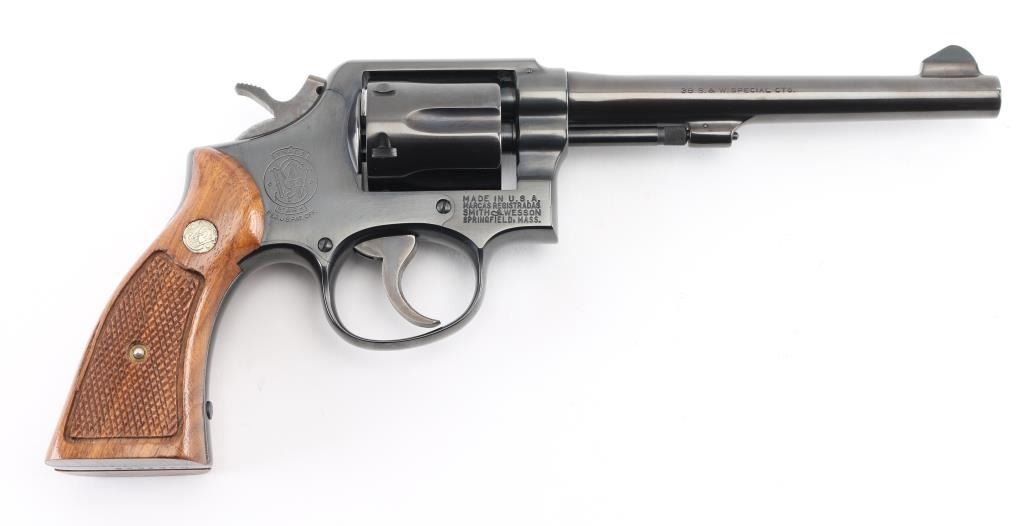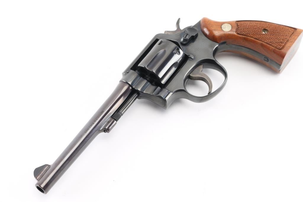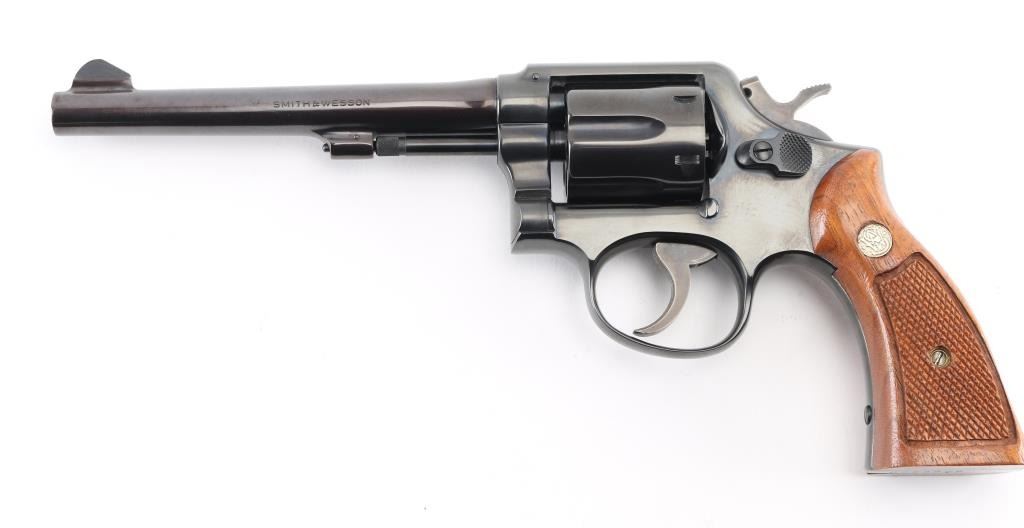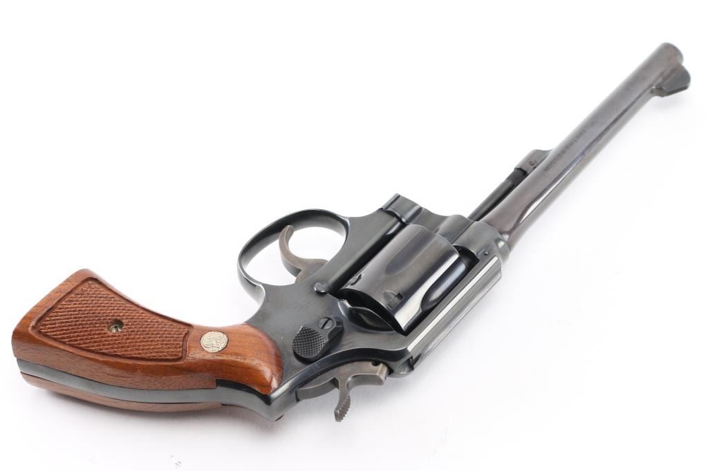 SN: D364522. Medium frame double action revolver. manufactured 1971-72. Features a blued finish, 6" barrel, forged blade front sight, square notched rear sight, non-shrouded ejector rod, fluted six-shot cylinder, grooved .240" trigger, .240" hammer, three screw square butt K service frame and two-piece checkered wood Magna grips with silver S&W medallions. Bore is excellent/bright. Revolver retains approximately 98% of it's original finish showing a very light drag line on the cylinder. Action is smooth with tight lock up. Grips are excellent. Condition is NRA Excellent. C&R Firearm.