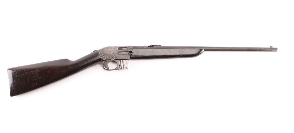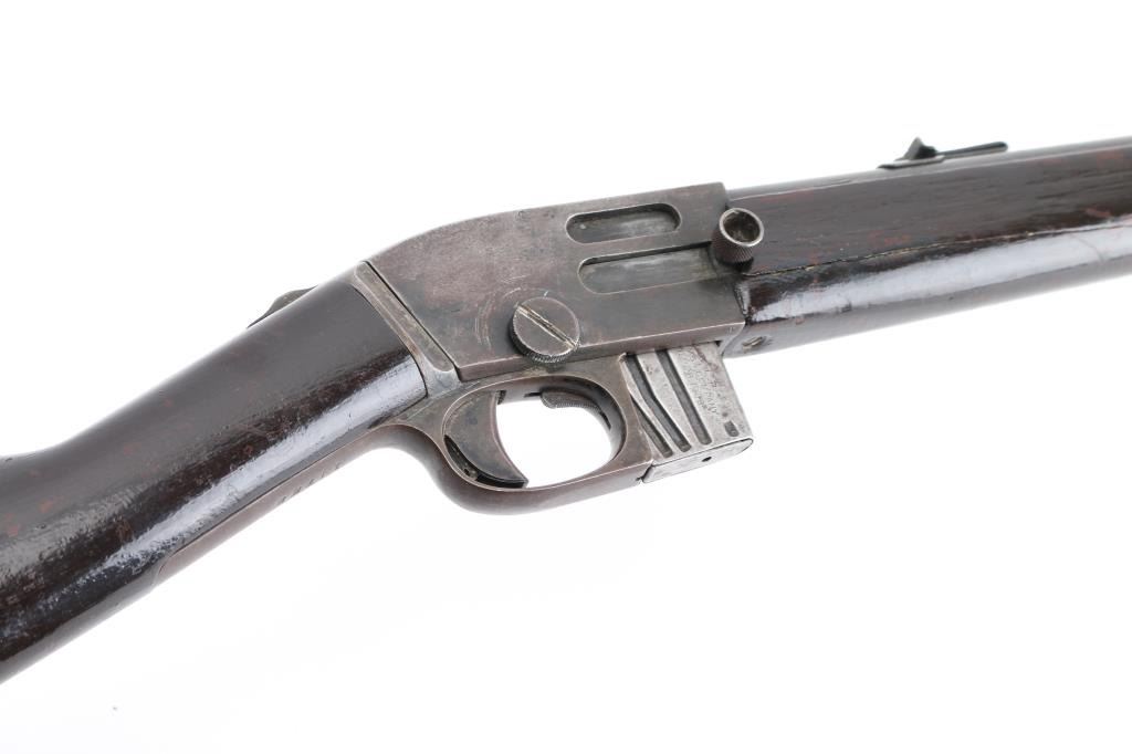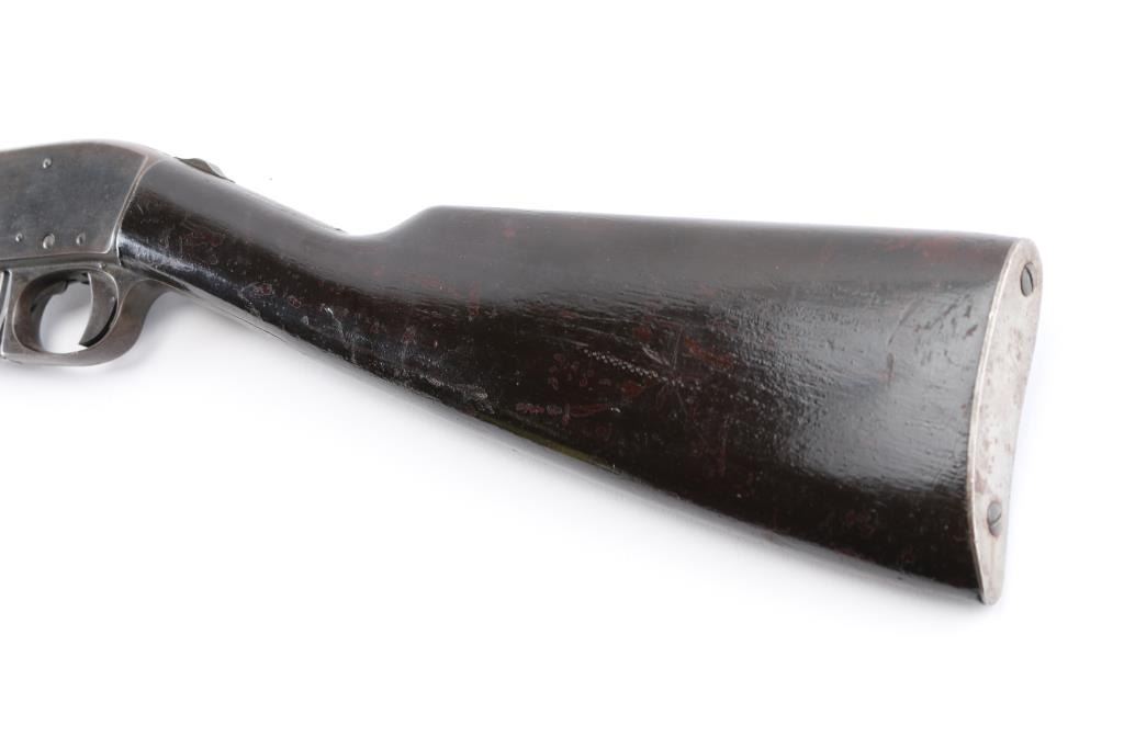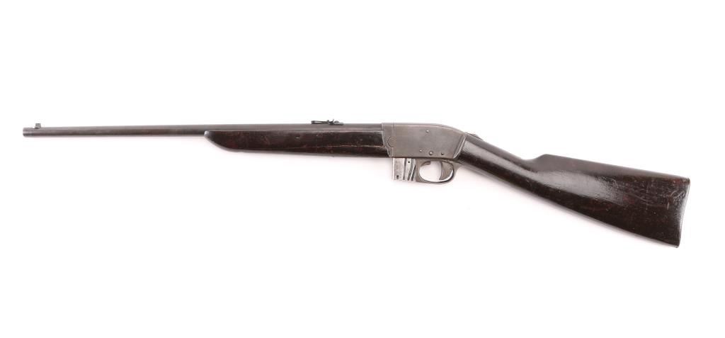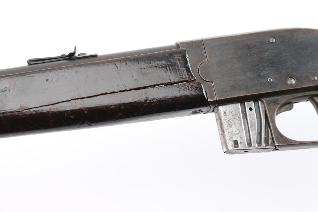 Semiautomatic takedown rimfire rifle. Features blued finish, smooth wood forend & straight wristed shoulder stock, smooth metal buttplate, 20" barrel, blade front & notch (adjustable by loosening screws) rear sights, detachable magazine, takedown screw on receiver, sliding tang safety. Bore is fair condition, dark and showing light pitting or leading, shows good rifling. Retains good coverage of faded bluing, now mostly dull brown, patina and some light pitting in many areas, edge losses. Wood is good overall, long cracks on both side of forend, many small dents. Includes one magazine. Safety operation is a bit mushy. Condition is NRA Good *** C&R Firearm ***