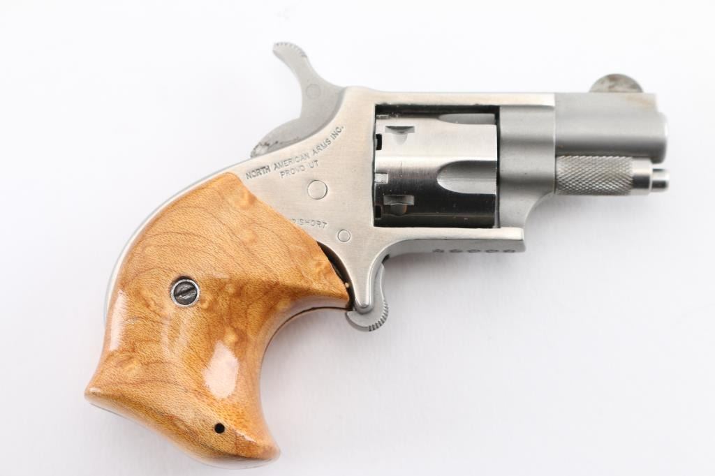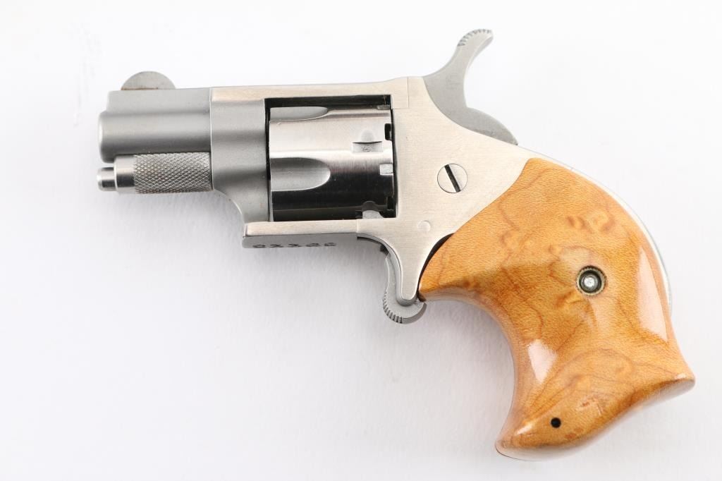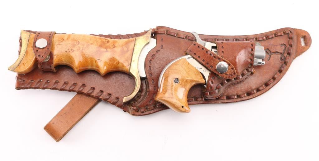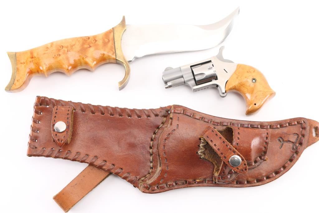 22 Short SN: S3368 Matching set with bird's eye maple grips on revolver and scales on knife. Revolver is stainless steel, 1" barrel, 5 shot fluted cylinder, single action with spur trigger. Knife is unmarked, 4.5" blade, 9" overall. Both fit in a single leather sheath with separate retention snaps. Condition is like new with few handling marks. Condition is NRA Excellent *** Modern Firearm ***