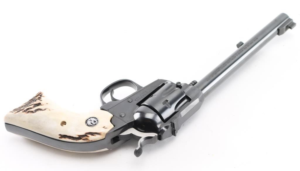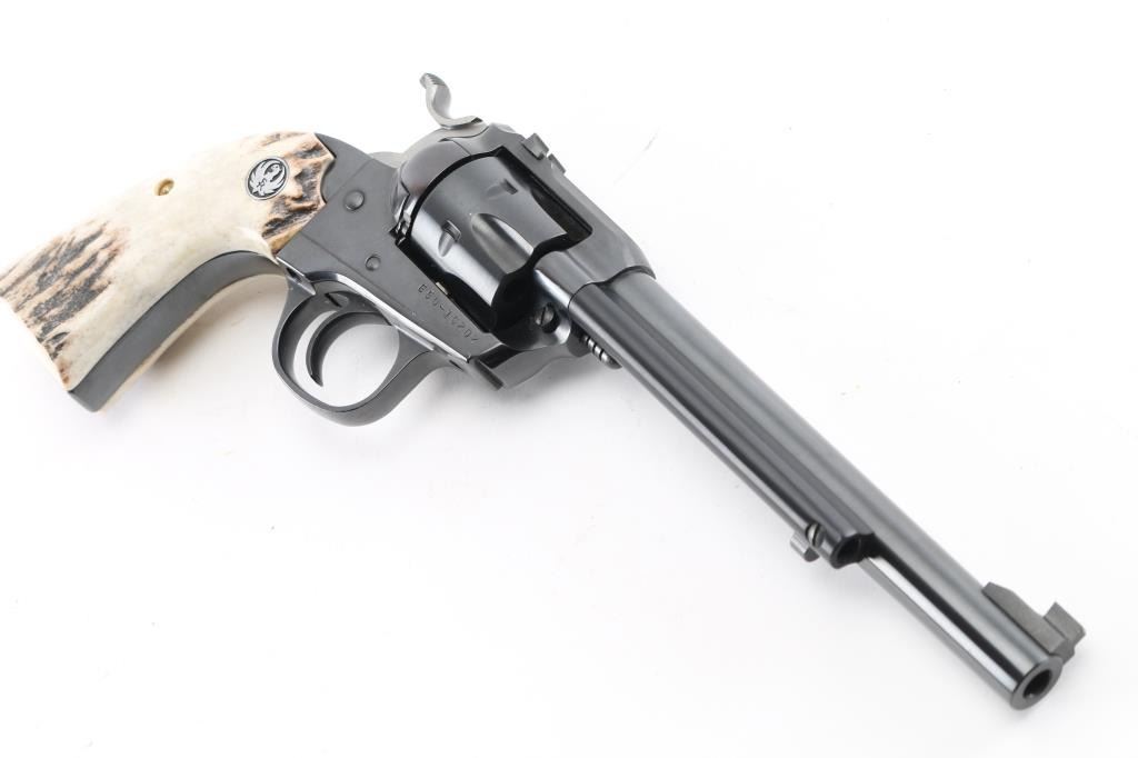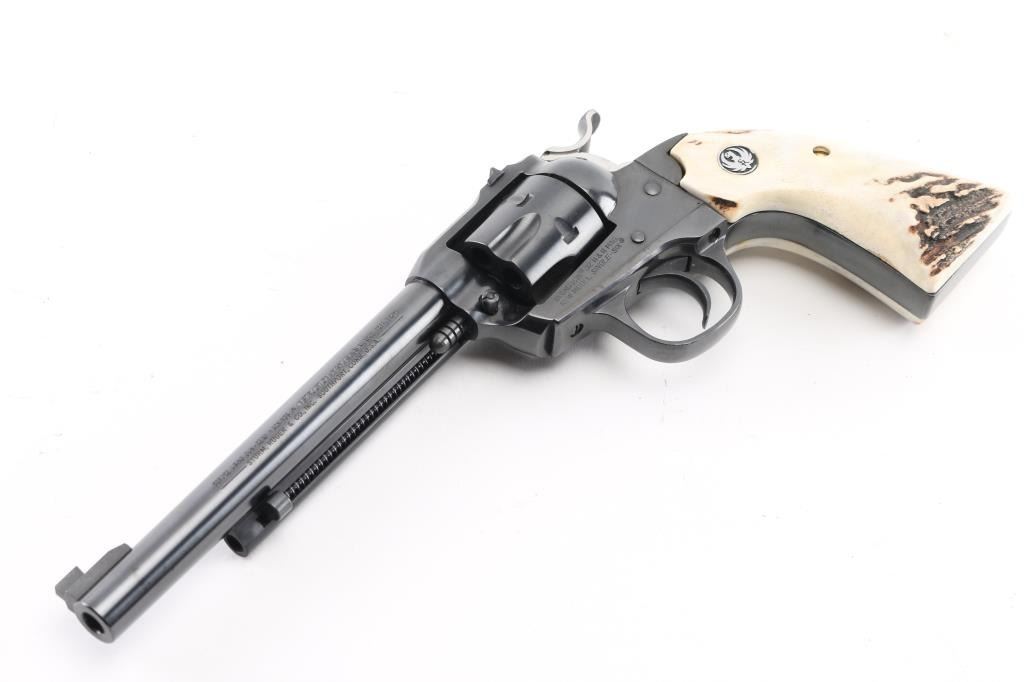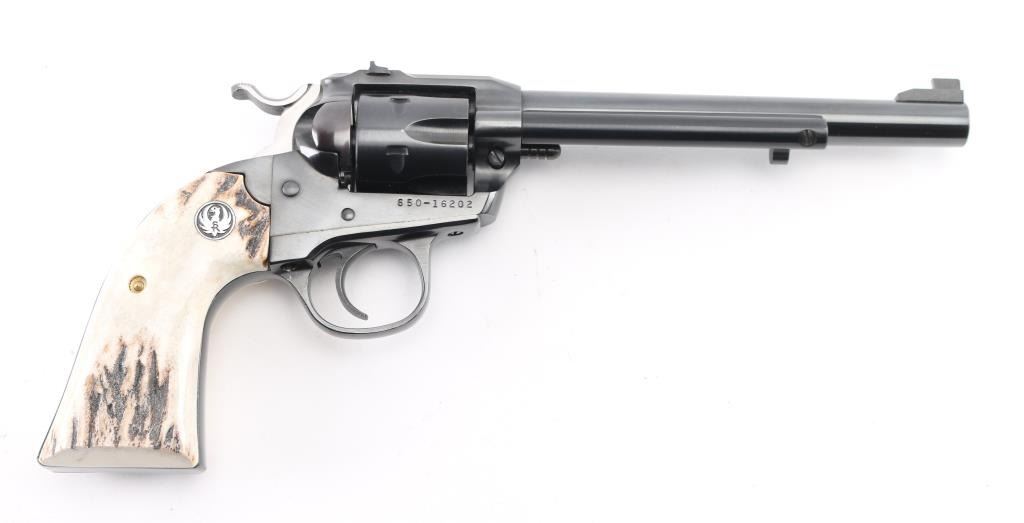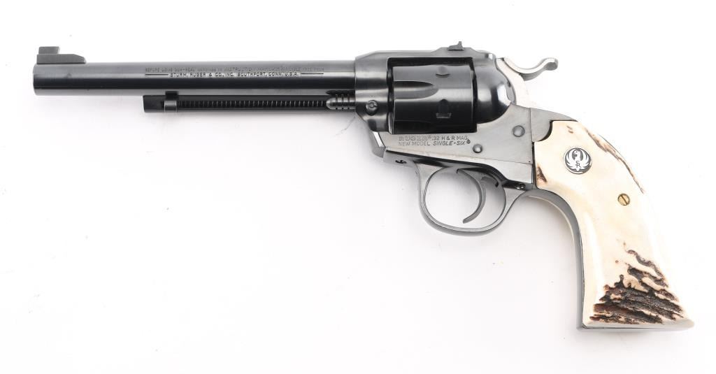 "Bisley" grip single action revolver chambered for 32 H&R Magnum. Features blued finish, stag grips with black & silver color Ruger medallions, 6.5" barrel, Partridge front & dovetailed rear notch sights. Overall condition is near new with few signs of handling. Condition is NRA Excellent *** Modern Firearm ***