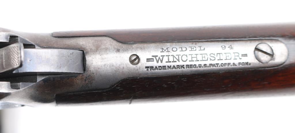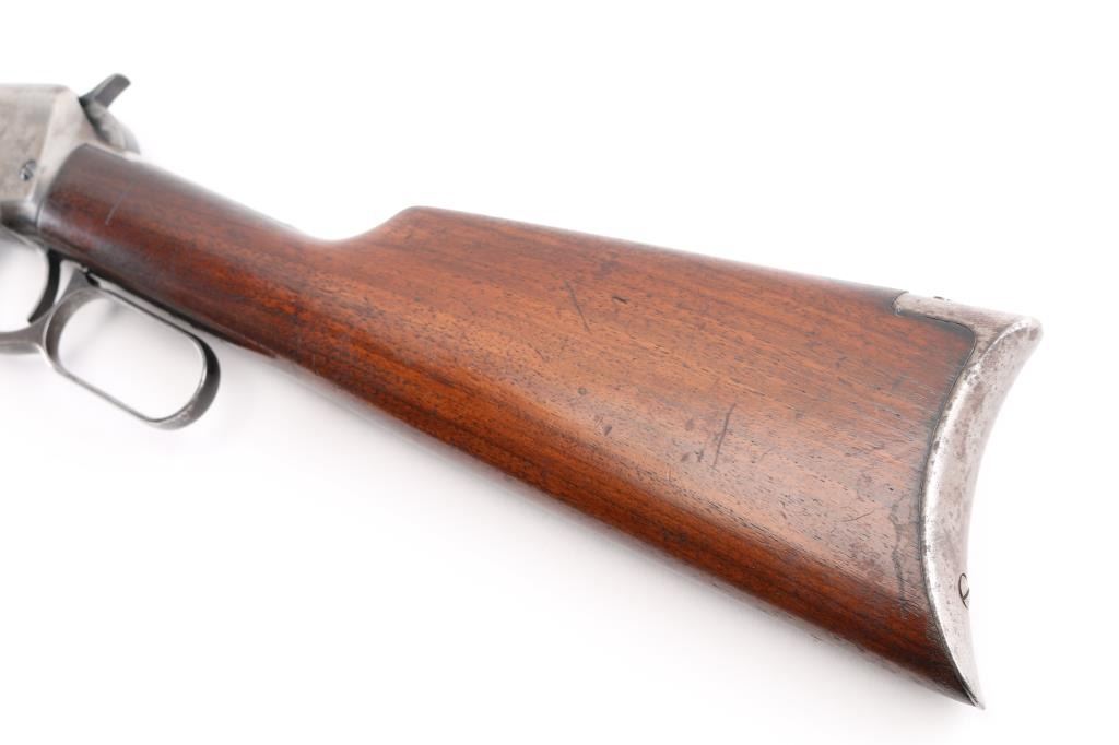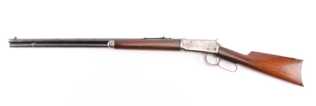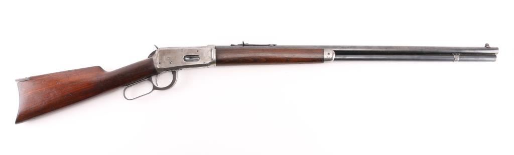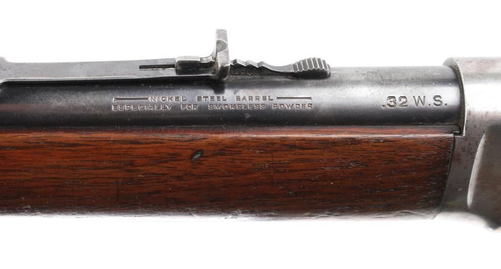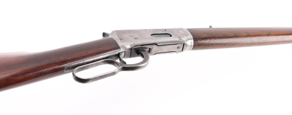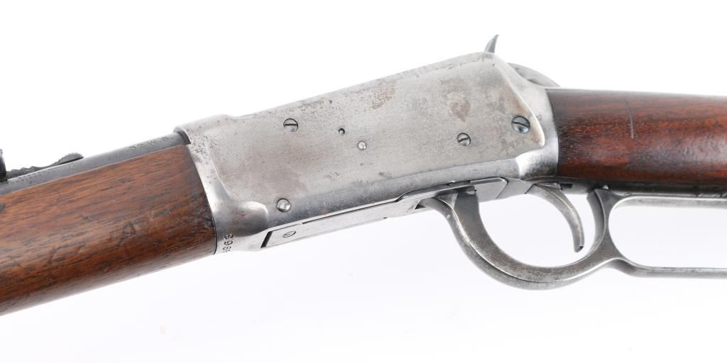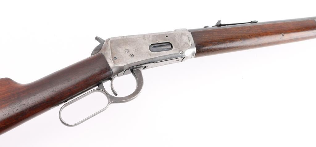 Vintage lever action repeating rifle chambered in .32 Winchester Special, manufactured in New Haven, CT circa 1921-22. Features a blued finish, 26" tapered barrel, full-length tube magazine, blade front sight, sporting rear sight, smooth trigger, knurled hammer spur, silver steel receiver, two piece wood stocks have a silver metal forend cap and a metal butt plate to match the receiver. Bore is in excellent condition and slightly dirty. Retains 60% finish with edge losses, handling marks, scratches, thinning and gray color on sides of receiver. Wood is very good condition with dents, some losses to varnish finish. Condition is NRA Very Good *** C&R Firearm ***