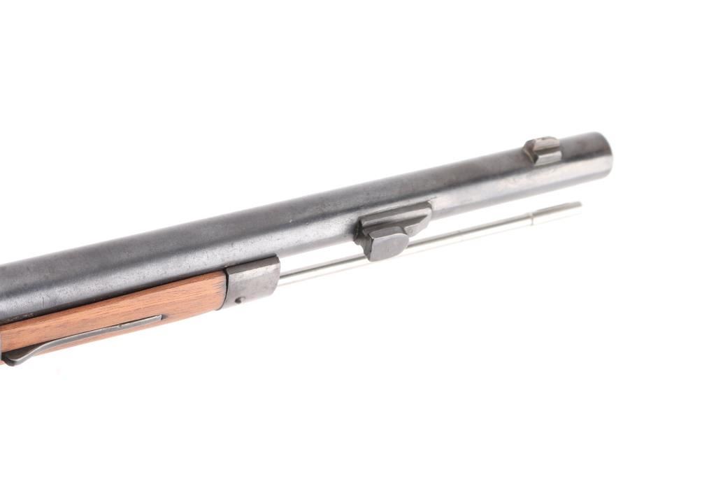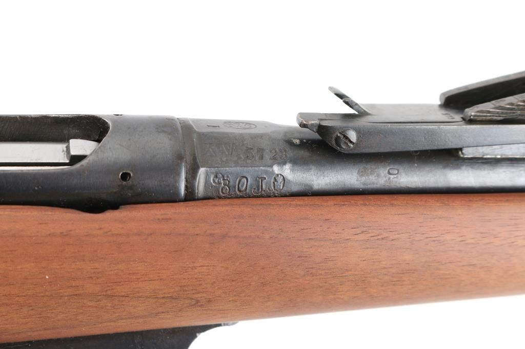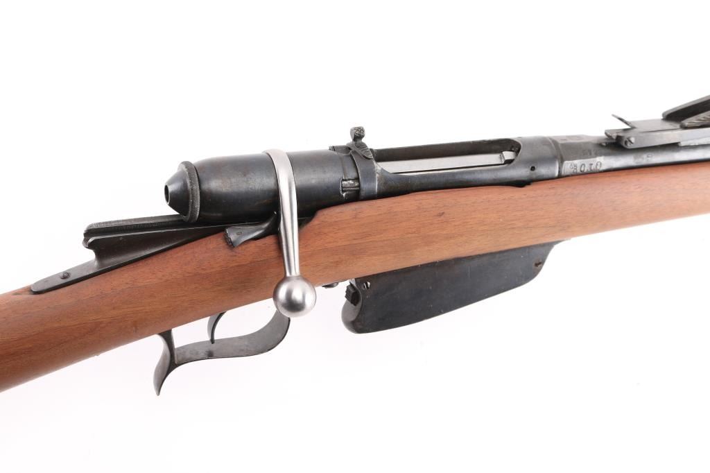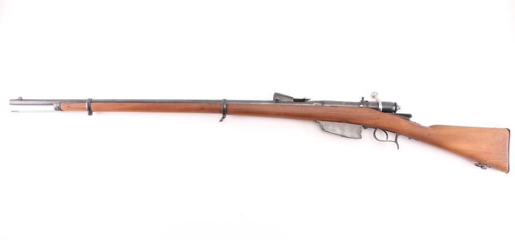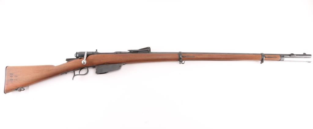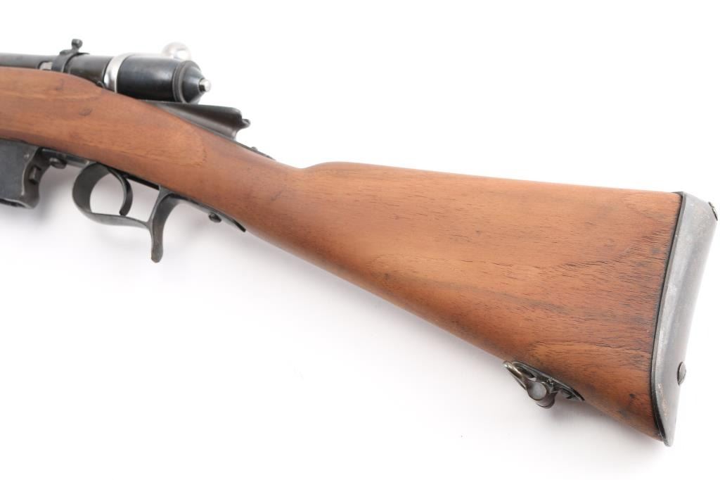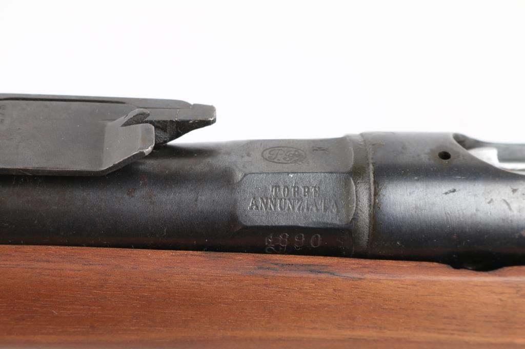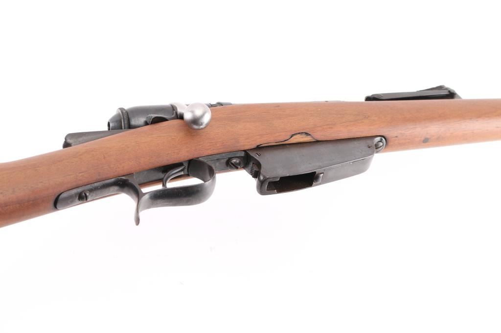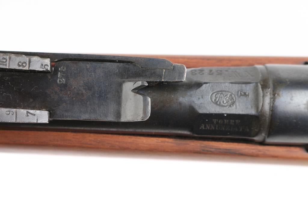 SN: WX.5723 Italian model 1870/87/15 bolt action rifle. Originally made for an 10.4mm black powder cartridge, converted during WWI to 6.5mm Carcano, with a Carcano feed system installed. 1890 date on receiver. Features re-blued finish, 33.5" barrel, blade front & adjustable rear sights, sling swivels, cleaning rod, bayonet lug. Bore is very good bright condition. Retains 95% dark black re-blue, with blemishes retained underneath from previous condition. Wood is sanded, showing losses at butt plate. Condition is NRA Very Good (refinished) *** Antique Firearm ***
