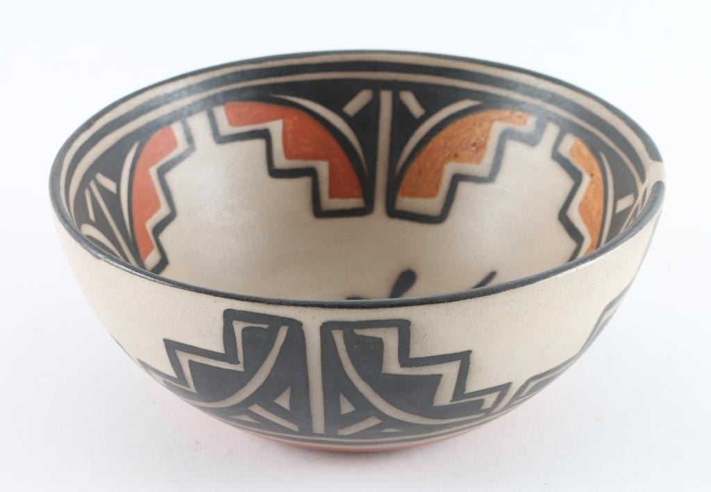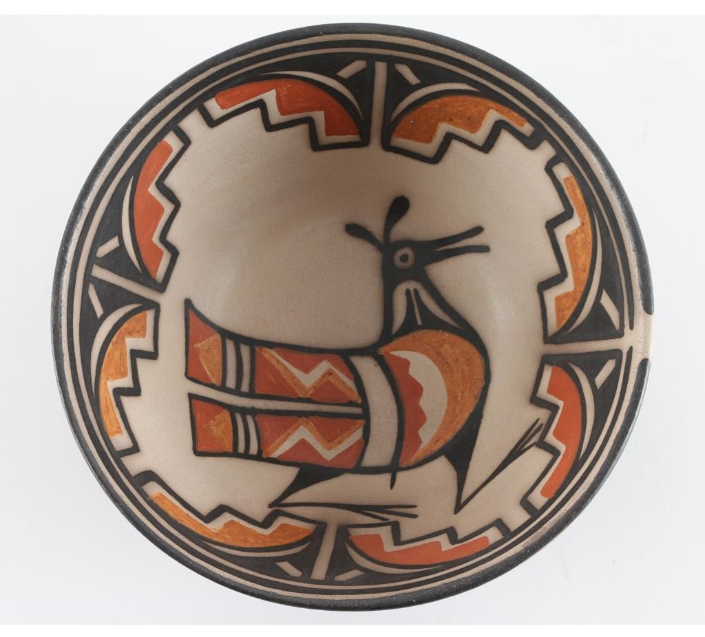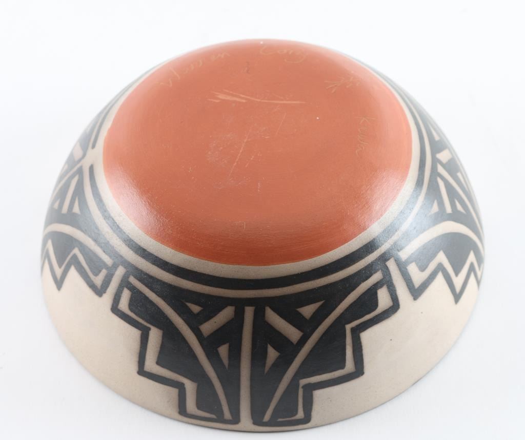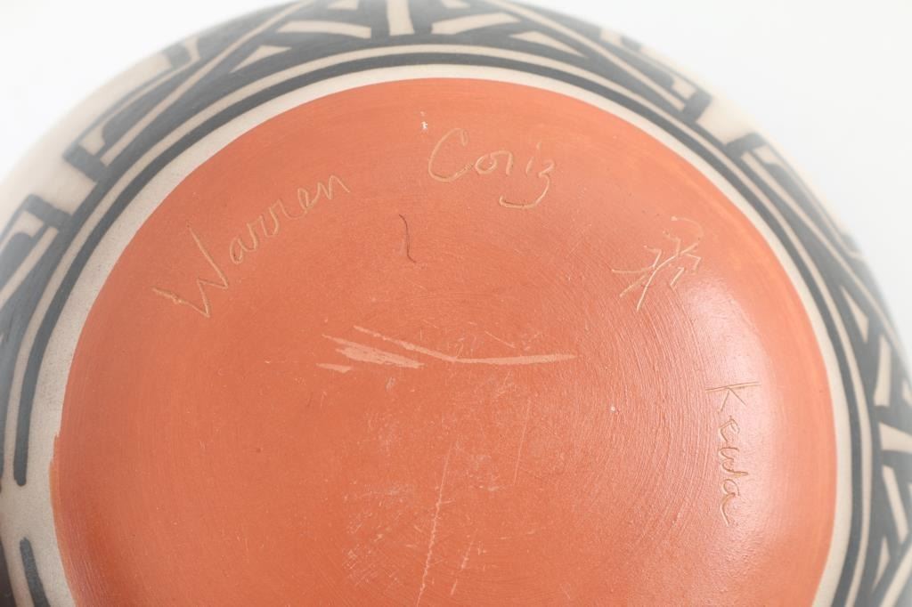 By artist "Warren Coriz' ( Tenorio Family ) Santa Domingo- Kewa. Depicts chicken on center of bowl. Measures 8inches rim to rim, 4inches to base.
