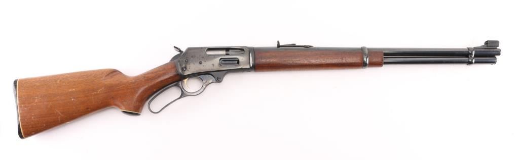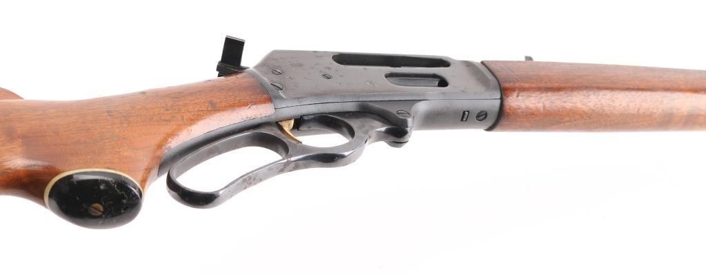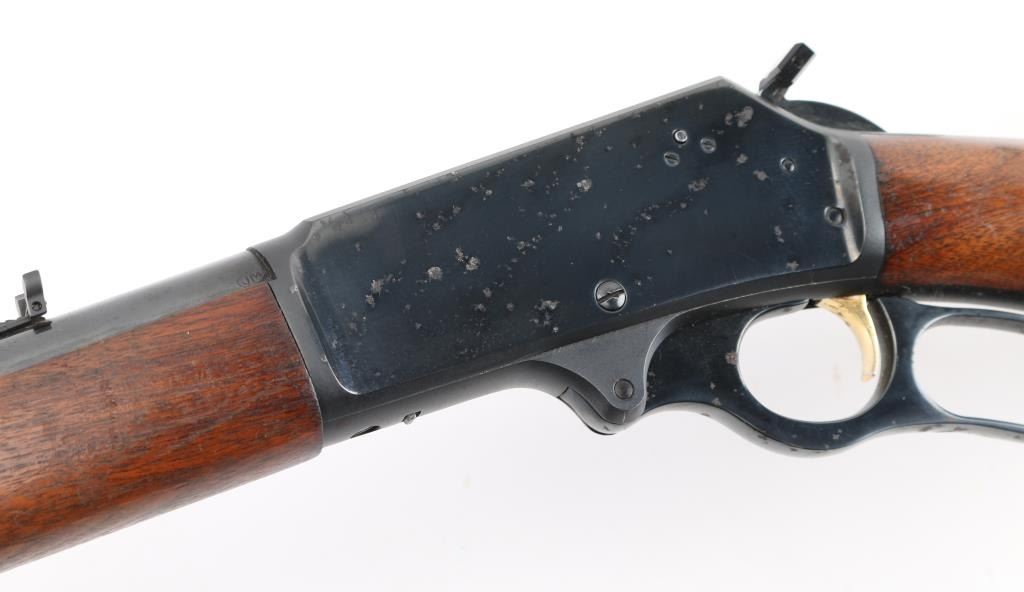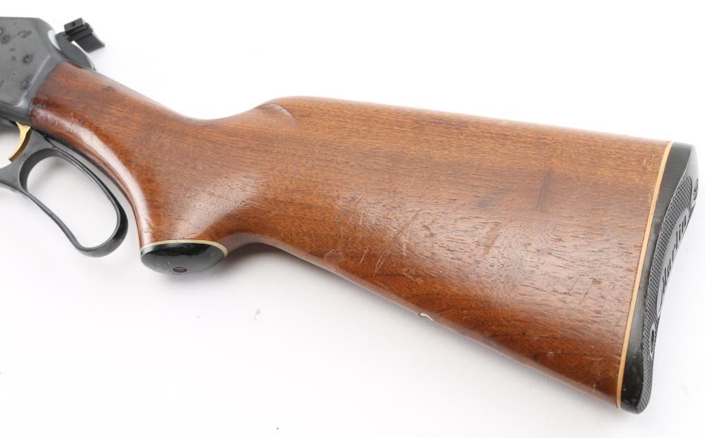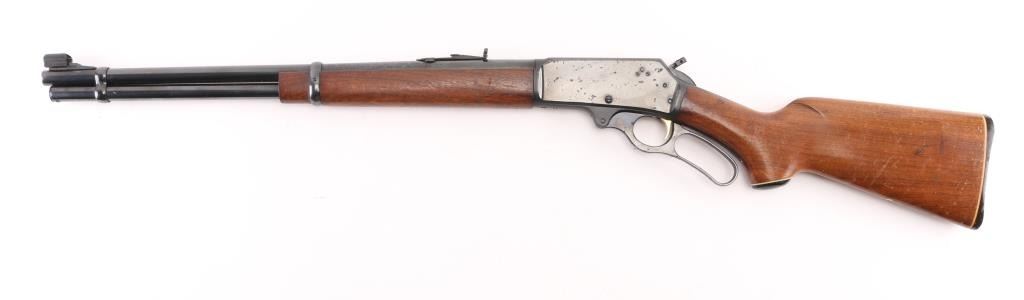 Lever action rifle. Features 20" barrel, hooded ramped blade/bead front sight, buckhorn rear sight, full length tube magazine under barrel, black plastic grip cap and buttplate with white line spacers, smooth faced gold accent trigger, serrated hammer spur with added side extension, curved finger lever. Receiver is drilled/tapped, no filler screws. Bore is very good condition. Retains about 90% blued finish, with minor scratches. The receiver & lever have scattered spots of pin-prick pitting. Smooth walnut stock & forend are very good condition with scratches and small dents. Condition is NRA Good. Modern Firearm.