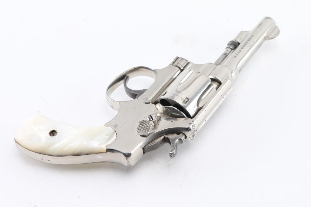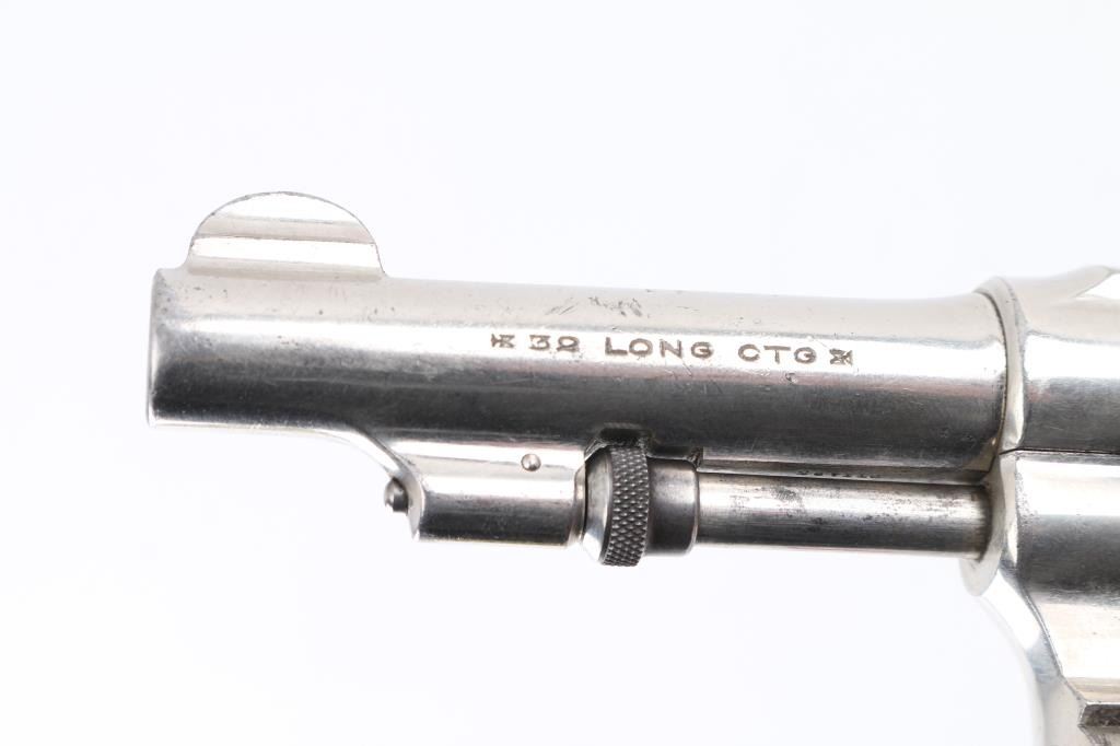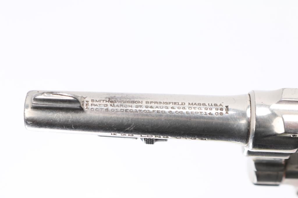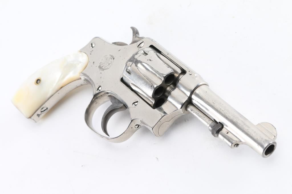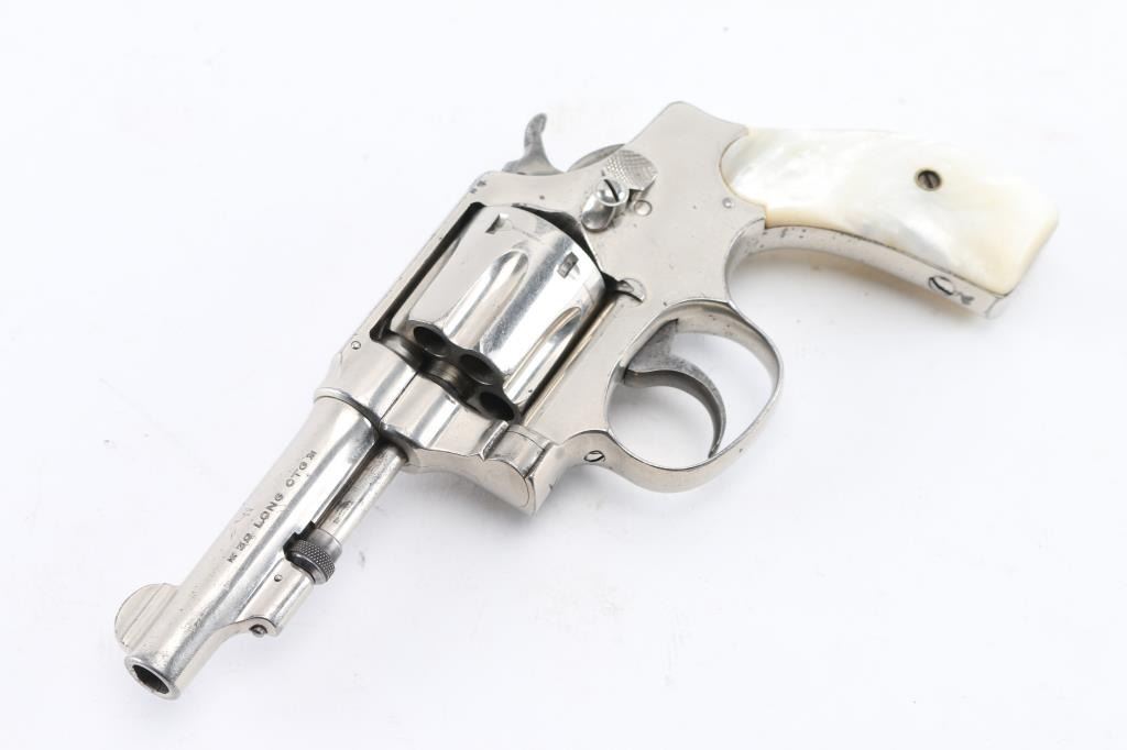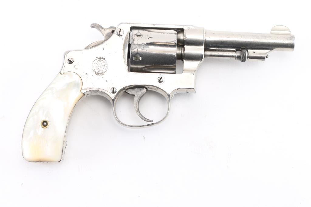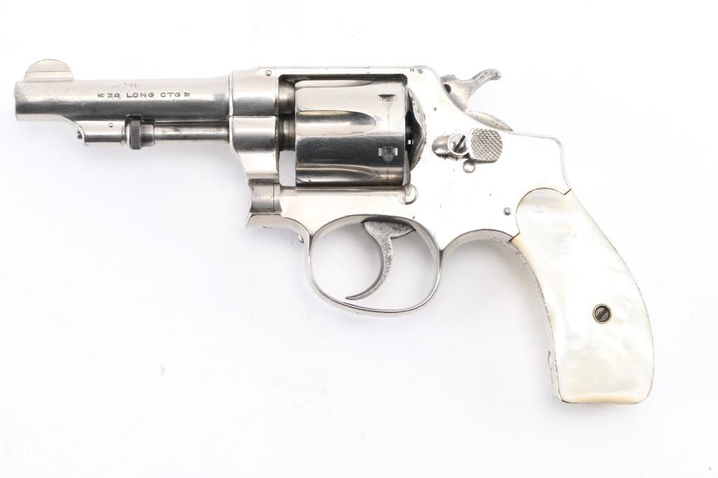 .32 Hand Ejector Model of 1903-5th change, Manufactured 1910-1917. 3 1/4" pinned, tapered barrel, nickel finish, mother of pearl grips, 6-shot fluted cylinder. Small S&W trademark on right frame. Bore overall is very good/.bright with some very minor spots of pitting near the muzzle, Grips are very good, action is crisp/tight. Nickel finish is about 90% with scratches, edge wear & and some very minor spots of pitting. Someone has scratched a small "X" on the underside of the frame forward of the triggerguard. NRA Condition-Good. C&R Firearm.