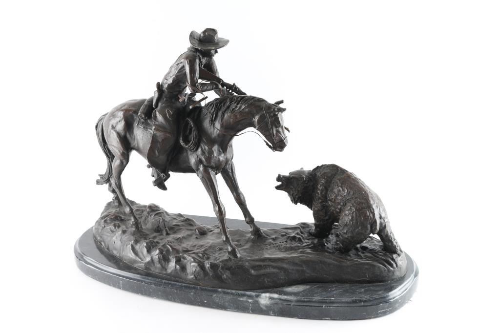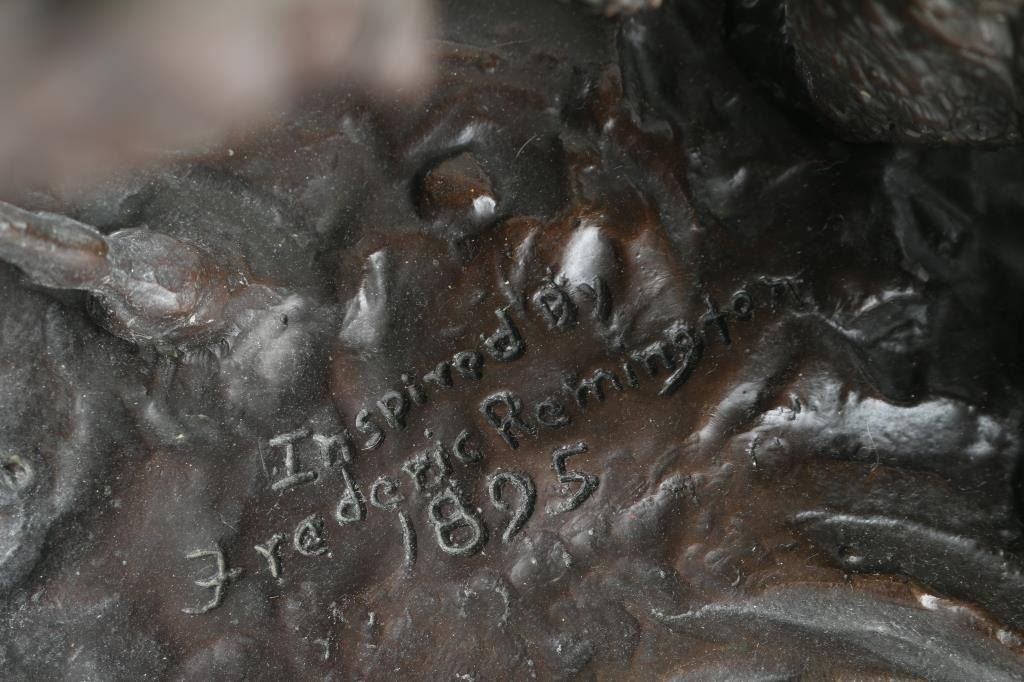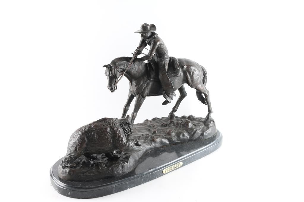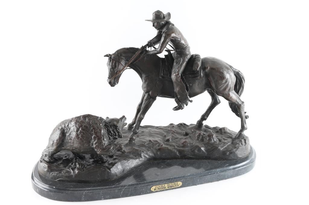 by noted western artist Frederic Remington entitled Double Trouble. Measures 27"x18". Quality restrike on marble base.