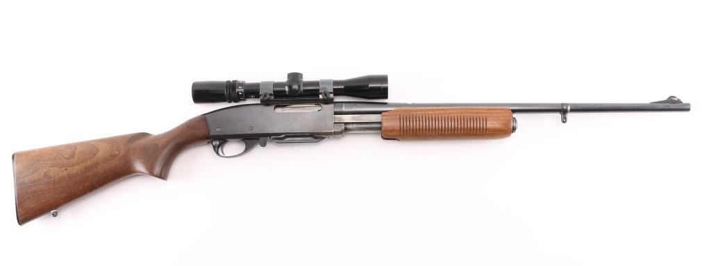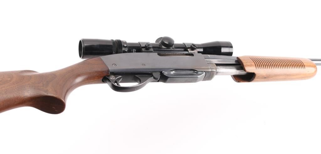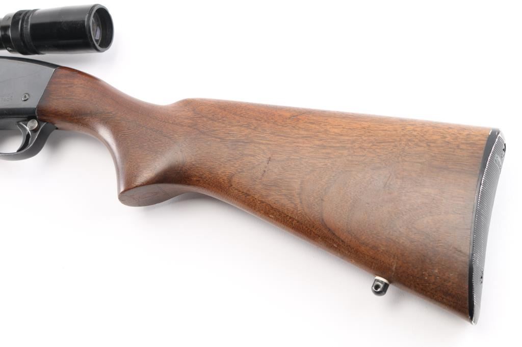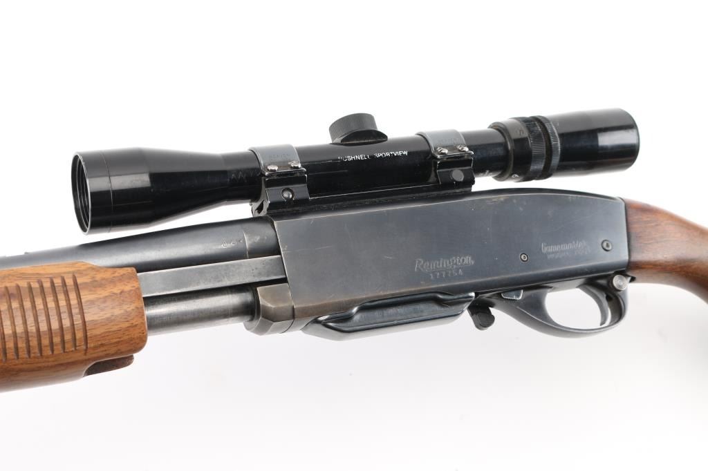 'Gamemaster' Pump action rifle, manufactured 1954. Features blued finish, grooved wood pump handle, smooth wood stock with curved grip, factory black plastic buttplate, 22.5" barrel, blade front sight, rear sight removed, Weaver rings attached to receiver top, detachable box magazine, manual safety. Bore is very good condition, some light frosting. Retains 80% blue, with scratches, edge losses, friction/handling wear. Wood is very good condition with scratches, some finish loss on the shoulder stock. Mounts a very good condition Bushnell Sportsview 3x.9x-32 scope with fine crosshair, good view. Condition is NRA Good+. Modern Firearm.
