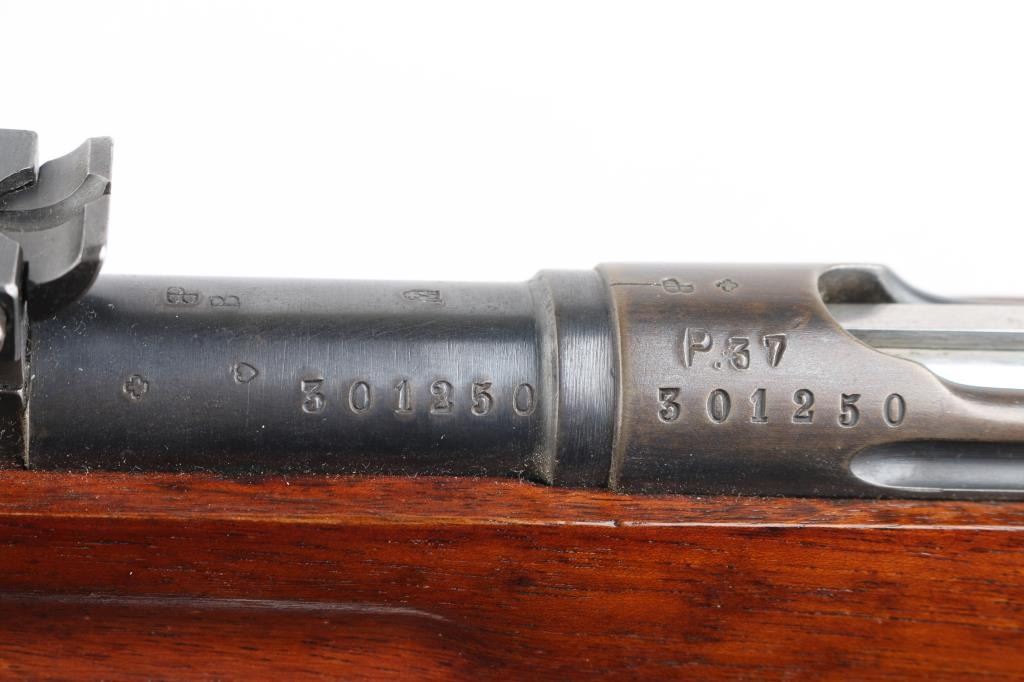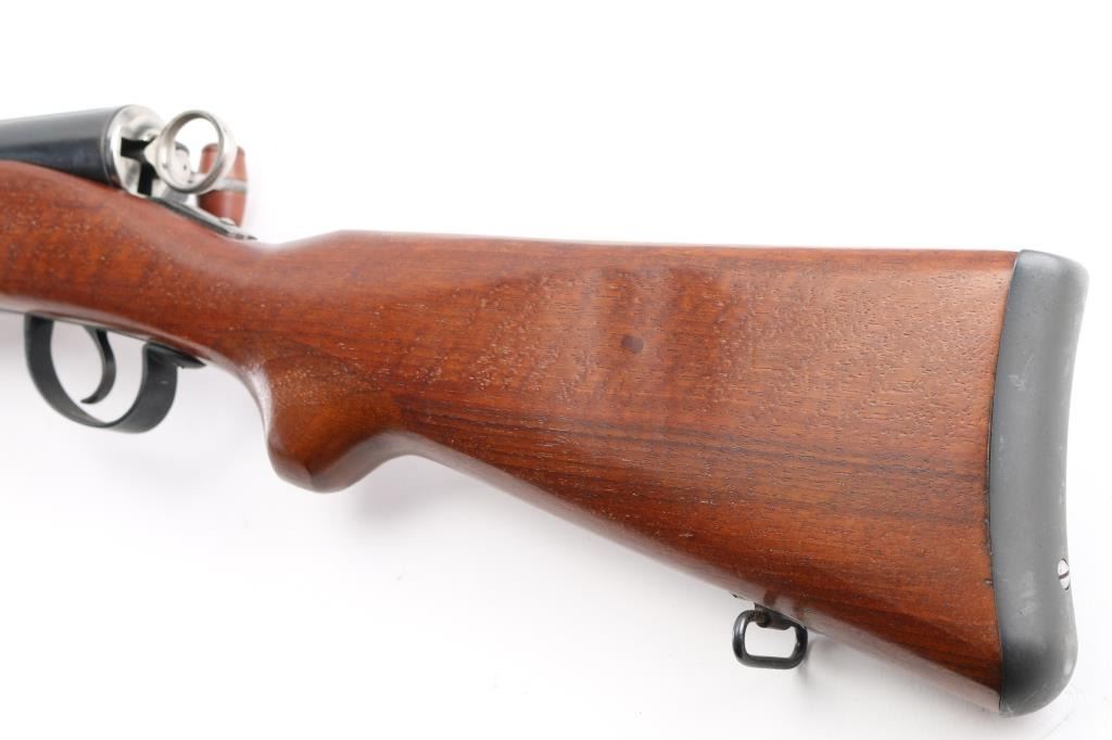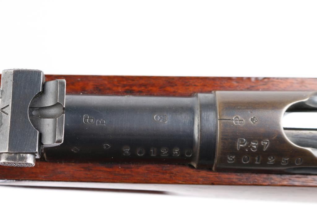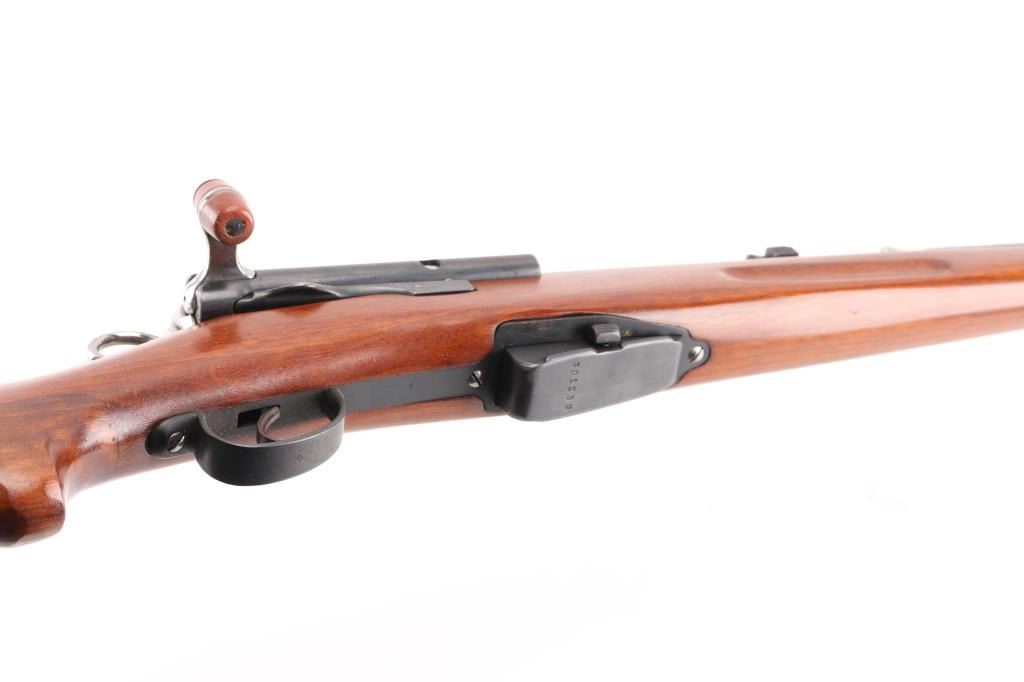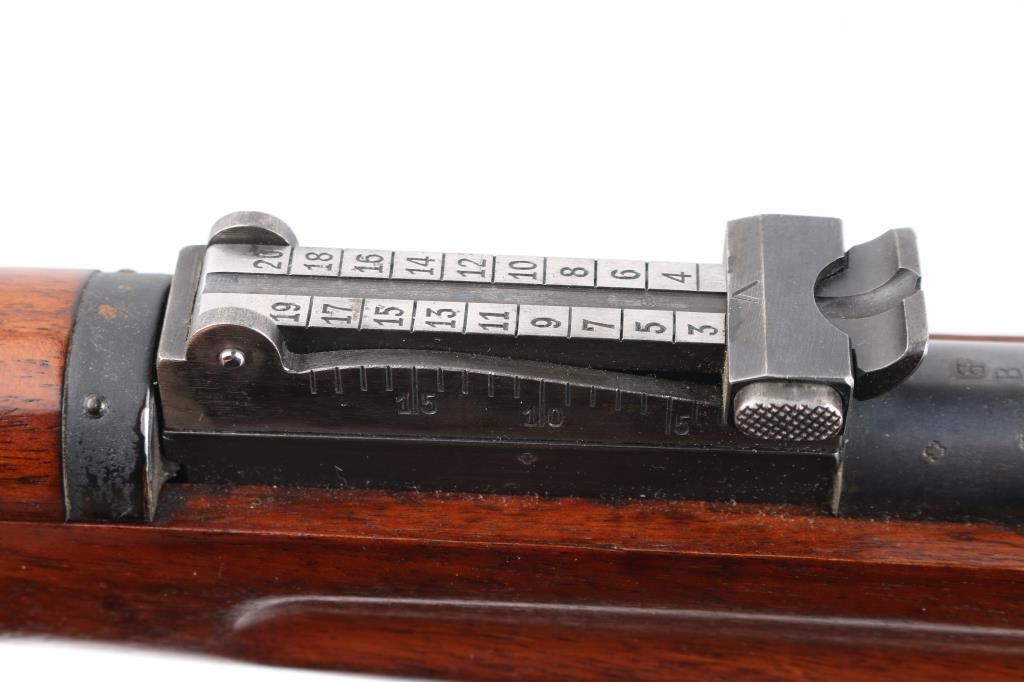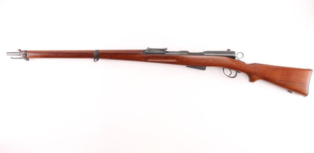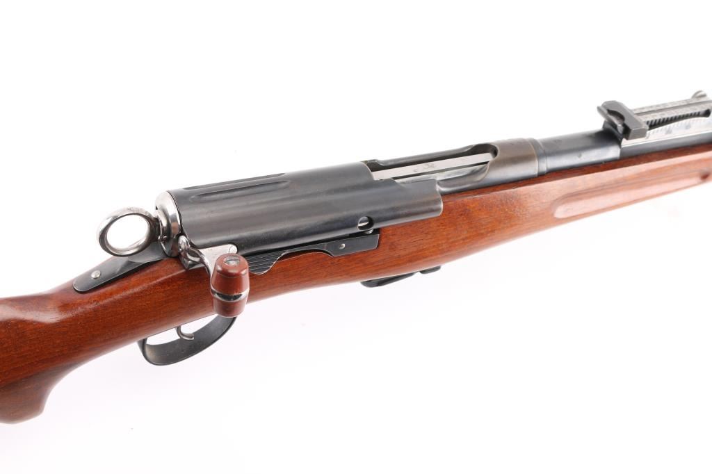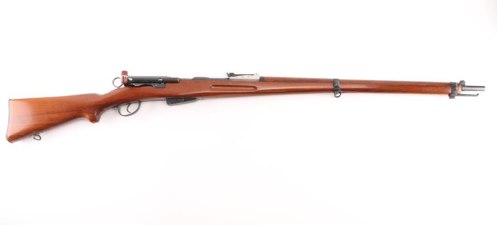 'Schmidt–Rubin' Vintage Swiss military straight-pull bolt action service rifle manufactured circa 1903. Imported by M+M, Thornton Co. Features blued finish, 30.7" barrel, dovetailed patridge front sight, Tangent rear sight graduated to 2,000 meters, two barrel bands with a stacking hook & bayonet lug on the front band, smooth trigger, detachable 6 round magazine, synthetic red barrel shaped bolt handle, cocking ring, smooth wood handguard and full-length shoulder stock with finger grooved forend, partial pistol grip & smooth metal buttplate. Serial numbers match on the receiver, barrel, bolt,buttplate and magazine. Bore is good or better, mostly bright, showing light frosting. Retains 85% blue, turning brown across front of receiver, some patina on magazine. Wood is gently refinished with s semi-gloss sheen, loss of sharpness to edges (especially at finger grooves), rear band loose, generally good fit to metal. Condition is NRA Very Good (stock refinished) *** C&R Firearm ***