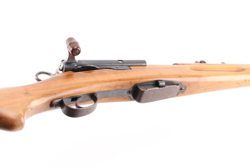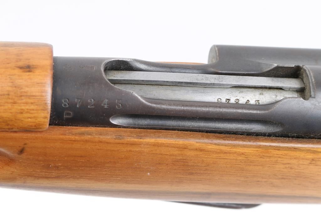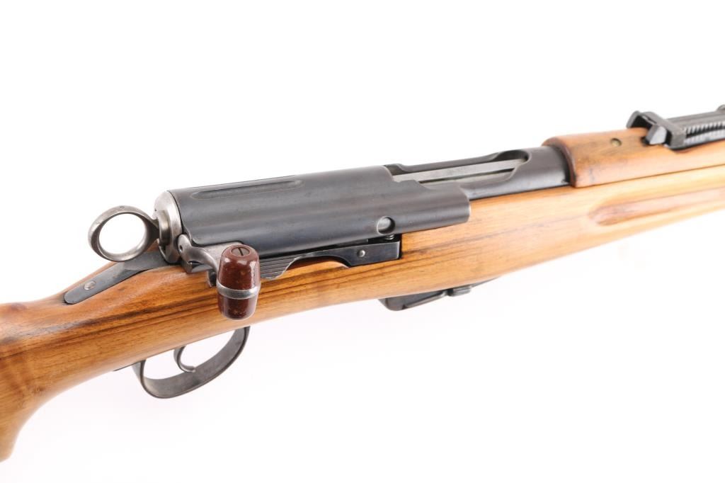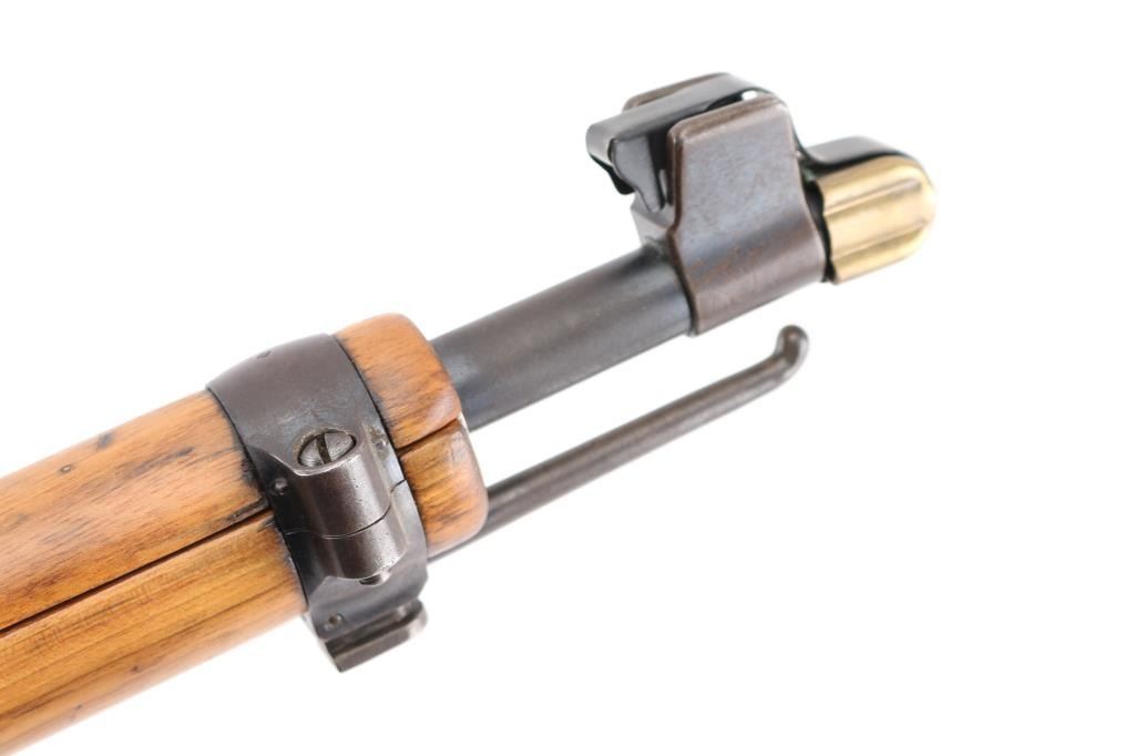 'Schmidt Rubin' 'K-11' Vintage Swiss military straight-pull bolt action service rifle chambered in 7.5×55mm Swiss, manufactured at Eidgenoessische Waffenfabrik, Bern circa 1918. No import marks. Features a blued finish, 23.3" barrel with recessed crown, shrouded blade front sight adjustable for windage, tangent rear sight graduated to 1,500 meters, stacking hook, two barrel bands with bayonet lug on the front band & sling swivel on the rear band, red hard rubber charging handle, detachable 6 round magazine, stripper clip guide cuts in the receiver, ring cocking piece/safety on the rear of the bolt, smooth curved trigger, smooth wood handguard and pistol grip shoulder stock with finger grooves in the forend, sling bar on the left side & flat metal buttplate. Serial numbers match on the receiver, bolt, and magazine. Bore is very good. Retains 75% finish, fading and thinning, turning brown in places. Wood has been sanded, showing slight erosion around butt, loss of sharp edges on finger grooves. Includes metal muzzle cap. Condition is NRA Good++ as modified *** C&R Firearm ***