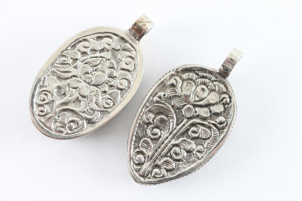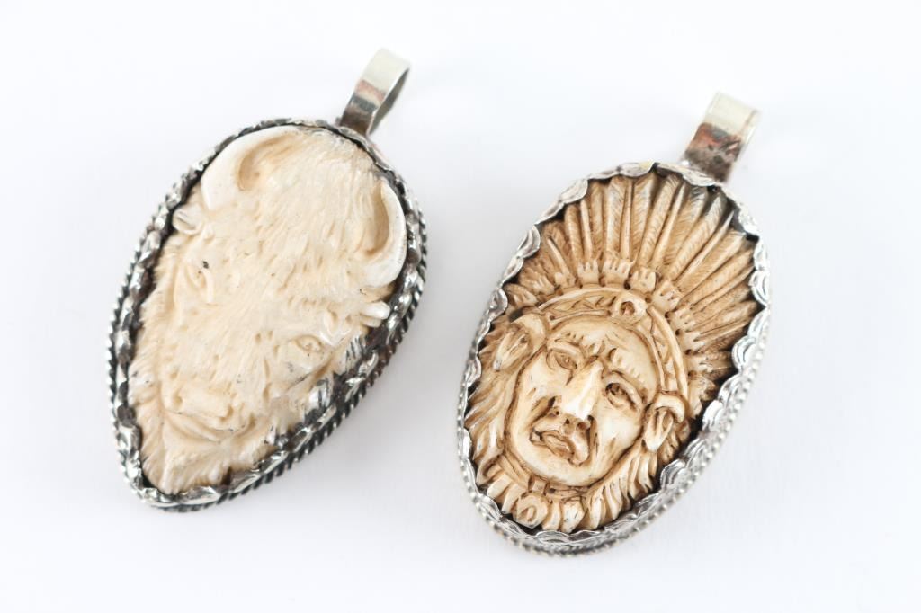 hand carved pendants set in silver plate (1) Indian Chief 1.5" (1) Buffalo 1.5"